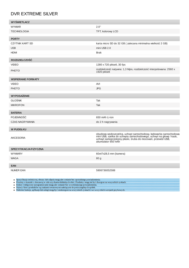 DVR EXTREME SILVER WYŚWIETLACZ WYMIAR 2.0'' TECHNOLOGIA TFT, kolorowy LCD PORTY CZYTNIK KART SD karta micro SD do 32 GB ( zalecana minimalna wielkość 2 GB) USB mini USB 2.0 HDMI Brak ROZDZIELCZOŚĆ VIDEO 1280 x 720 pikseli, 30 fps PHOTO rozdzielczość natywna: 1,3 Mpix, rozdzielczość interpolowana: 2560 x 1920 pikseli WSPIERANE FORM ATY VIDEO AVI PHOTO JPG WYPOSAŻENIE GŁOŚNIK Tak MIKROFON Tak BATERIA POJEMNOŚĆ 650 mAh Li-ion CZAS NAGRYWANIA do 2 h nagrywania W PUDEŁKU AKCESORIA obudowa wodoszczelna, uchwyt samochodowy, ładowarka samochodowa mini USB, szelka do uchwytu samochodowego, uchwyt na głowę / kask, uchwyt samoprzylepny płaski, śruba do mocowań, przewód USB, akumulator 650 mAh SPECYFIKACJA FIZYCZNA WYMIARY 60x47x28,5 mm (kamera) WAGA 80 g EAN NUMER EAN 5906736052588 Specyfikacja techniczna, obrazy lub zdjęcia mogą ulec zmianie bez uprzedniego powiadomienia. Prosimy o kontakt z dostawcą w celu uzyskania dokładnych ofert. Produkty mogą nie być dostępne na wszystkich rynkach. Kolory i dołączone oprogramowanie mogą ulec zmianie bez wcześniejszego powiadomienia. Nazwy firm i produktów są znakami towarowymi należącymi do poszczególnych spółek. Niektóre funkcje, aplikacje lub usługi mogą być niedostępne na wszystkich rynkach i we wszystkich wersjach językowych.