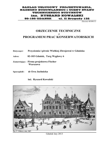ZAKLAD USLUGOWY PROJEKTOWANIA, NADZORU BUDOWLANEGO i OCENY STANU TECHNICZNEGO BUDYNKÓW inz. RYSZARD KOWALSKI 80-180 GDANSK ul. II Brygady 132 Zlecenie 48/696/13 ORZECZENIE TECHNICZNE z PROGRAMEM PRAC KONSERWATORSKICH Dotyczące: Przyziemia i piwnic Wielkiej Zbrojowni w Gdańsku Adres: 82-103 Gdańsk, Targ Węglowy 6 Zamawiający : Firma projektowa Fischer Warszawa Sporządzili : dr Ewa Jachnicka inż. Ryszard Kowalski Ryc. P. Willera z roku 1687. Gdańsk luty 2013 ORZECZENIE TECHNICZNE z PROGRAMEM PRAC KONSERWATORSKICH Wielka Zbrojownia Gdańsk 2 48/691/13 Spis treści: 1. Część ogólna 2. Lokalizacja budynku 3. Opis omawianych części arsenału 4. Historia obiektu 5. Dane o materiałach kondygnacji naziemnej 6. Dane o materiałach piwnicy 7. Badania konserwatorskie 8. Stan zachowania i przyczyny zniszczeń 9. Założenia i wytyczne konserwatorskie 10.Program prac konserwatorskich 11.Wnioski końcowe 3 3 4 5 8 10 13 20 23 27 36 Załączniki: 1. 2. 3. 4. 5. Ryciny Aneks 1 Analiza petrograficzna próbek zaprawy Aneks 2 Badania próbek warstw malarskich przyziemia wyniki badań fizykochemicznych próbek muru kserokopia uprawnień budowlanych 37 38 43 46 47 Zakład Usługowy Projektowania, Nadzoru Budowlanego i Oceny Stanu Technicznego Budynków inż. Ryszard Kowalski 80 – 180 Gdańsk ul. II Brygady 132 [email protected] 587 174 436 NIP 583-020-98-32 0601-689-199 ORZECZENIE TECHNICZNE z PROGRAMEM PRAC KONSERWATORSKICH Wielka Zbrojownia Gdańsk 3 48/691/13 1. Część ogólna Orzeczenie techniczne z programem prac konserwatorskich dotyczące wnętrza przyziemia i piwnic Wielkiej Zbrojowni w Gdańsku, opracowano na podstawie zlecenia otrzymanego od Zamawiającego. 1.2. Stan techniczny obiektu oceniono na podstawie oględzin i badań konserwatorskich w lutym 2013 roku. 1.3. Celem opracowania jest analiza stanu zachowania, przygotowanie wytycznych do projektowania oraz zaproponowanie programu prac konserwatorskich i koncepcji naprawy zaistniałego stanu na podstawie istniejącej dokumentacji historycznej oraz badawczej. 1.4. Dokumenty wykorzystane do opracowania: L. Sobiecka Dokumentacja historyczno-architektoniczna Wielkiej Zbrojowni, materiały PKZ o/Gdańsk, 1980 r. J. Habela Antoni van Obbergen, architekt i fortyfikator flamandzki z przełomu XVI i XVII wieku, Gdańsk 1965 r. Z. Jakrzewska-Śnieżko Gdańsk w dawnych rycinach J. Gzowski Badania architektoniczne piwnic Wielkiej Zbrojowni, Gdańsk, ul. Targ Węglowy 6, Gdańsk 1967 r. J. Szczurek Sprawozdanie z prac badawczych w przyziemiu i piwnicach Wielkiej Zbrojowni w Gdańsku, Kraków 2008 r. J. Stankiewicz Średniowieczne fortyfikacje Głównego Miasta w Gdańsku. Studia i materiały do historii wojskowości, tom IV, Warszawa 1958 r. J. Stankiewicz Strakowscy, fortyfikatorzy, architekci i budowniczowie Gdańscy, Gdańsk, 1955 r. R. Kowalski Ekspertyza techniczna mikologiczno – budowlana, Gdańsk, 2008 r. E. Jachnicka Piwnice Wielkiej Zbrojowni w Gdańsku, badania konserwatorskie, Gdańsk, 2008 M. Gawlicki Zabytkowa architektura Gdańska w latach 1945-1951r. Gdańsk 2012r 1.5. Nin. orzeczenie opracowano zgodnie z zamówieniem, w oparciu o obowiązujące przepisy oraz zasady wiedzy technicznej[1], i stanowi ono komplet dokumentacji niezbędnej do realizacji celu, jaki został określony w umowie z Zamawiającym i wchodzi w zakres prowadzonej działalności gospodarczej zarejestrowanej w ewidencji działalności gospodarczej Urzędu Miasta w Gdańsku pod nr 267 w dniu 10-01-1989r. 1.1 2. Lokalizacja obiektu Wielka Zbrojownia w Gdańsku znajduje się w zachodniej części średniowiecznych umocnień obronnych Głównego Miasta w bezpośrednim sąsiedztwie dawnej fosy. Obiekt zlokalizowany jest w odległości zaledwie kilkuset metrów od rzeki Motława, stanowiącej jedno z ramion ujściowego odcinka rzeki Wisła, w pradolinie dawnego potoku siedlickiego, w północno – wschodniej części Targu Węglowego, między Basztą Słomianą i Starą Apteką w linii północ – południe oraz Targiem Węglowym i ul. Tkacką w linii wschód – zachód. 1 Ustawa z dnia 07-07-1994r prawo budowlane (tekst jednolity Dz. U. nr207 z 2003r poz. 2016 z późniejszymi zmianami). Zakład Usługowy Projektowania, Nadzoru Budowlanego i Oceny Stanu Technicznego Budynków inż. Ryszard Kowalski 80 – 180 Gdańsk ul. II Brygady 132 [email protected] 587 174 436 NIP 583-020-98-32 0601-689-199 ORZECZENIE TECHNICZNE z PROGRAMEM PRAC KONSERWATORSKICH Wielka Zbrojownia Gdańsk 4 48/691/13 3. Opis omawianych części arsenału 3.1. Przyziemie Wnętrze przyziemia jest jednoprzestrzenne, czteronawowe i sześcio- przęsłowe o rzucie prostokątnym i wymiarach wewnętrznych około 36 metrów na 50 metrów. Sklepienie krzyżowe, otynkowane, wsparte jest na 15 granitowych, wtórnych filarach o przekroju kwadratowym i ścianach obwiedniowych. Od wschodu i zachodu do wnętrza hali prowadzą po dwie symetryczne stalowe bramy z kutymi nadświetlami. W elewacji wschodniej i zachodniej znajduje się po sześć symetrycznych otworów okiennych, w drewnianych ramach z podziałem krzyżowym. W ścianie południowej, w części zachodniej, znajdują się trzy okna, a w elewacji północnej, niesymetrycznie, dwa. W części środkowej ściany północnej widnieje otwór prowadzący do powojennej klatki schodowej. Otwór przejściowy został wykuty w oryginalnym, renesansowym murze. Przy elewacji zachodniej wtórnie wykonano przebicie i schody prowadzące do piwnicy. W ścianie wschodniej, na wysokości wieżyczek i zejść do piwnicy, widać nisze z łękami. Podobny otwór z łękiem, wykorzystany w okresie powojennym na przeprowadzenie wentylacji, znajduje się w północno – zachodnim narożniku pomieszczenia. Ściany przyziemia pierwotnie wymurowano z żółtej cegły „holenderki” i wyspoinowano zaprawą wapienną. Liczne remonty spowodowały nieodwracalne zmiany architektoniczne doprowadzając większą część materiału oryginalnego do dewastacji. W chwili obec