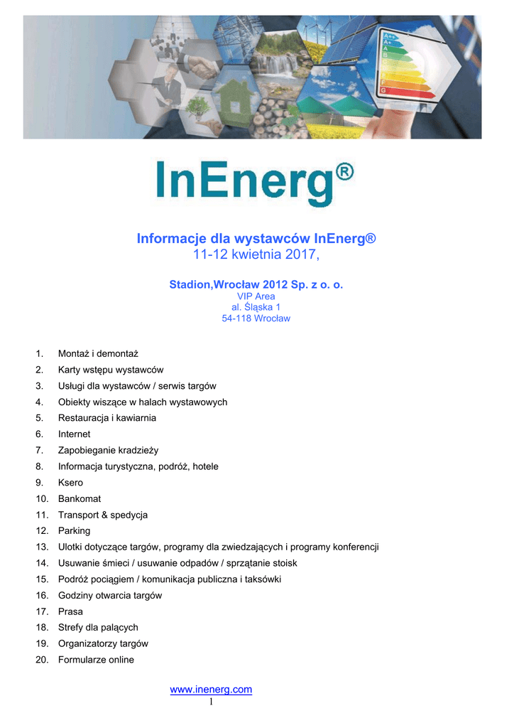 Informacje dla wystawców InEnerg® 11-12 kwietnia 2017, Stadion,Wrocław 2012 Sp. z o. o. VIP Area al. Śląska 1 54-118 Wrocław 1. Montaż i demontaż 2. Karty wstępu wystawców 3. Usługi dla wystawców / serwis targów 4. Obiekty wiszące w halach wystawowych 5. Restauracja i kawiarnia 6. Internet 7. Zapobieganie kradzieży 8. Informacja turystyczna, podróż, hotele 9. Ksero 10. Bankomat 11. Transport & spedycja 12. Parking 13. Ulotki dotyczące targów, programy dla zwiedzających i programy konferencji 14. Usuwanie śmieci / usuwanie odpadów / sprzątanie stoisk 15. Podróż pociągiem / komunikacja publiczna i taksówki 16. Godziny otwarcia targów 17. Prasa 18. Strefy dla palących 19. Organizatorzy targów 20. Formularze online www.inenerg.com 1 1. Montaż i demontaż 1.1 Wystawcy z własnym stoiskiem lub własna zabudową Montaż: Poniedziałek , 10 kwietnia 2017 od 07.00 do 22.00 Demontaż: Środa, 12 kwietnia 2016 od 17.00 do 24.00 JEŻELI POSIADAJĄ PAŃSTWO SPERSONALIZOWANE STOISKO, PROSIMY O PRZESŁANIE NAM JEGO ZDJĘCIA ORAZ INFORMACJI TECHNICZNYCH DO 20 MARCA 2017. 1.2. Wystawcy, którzy wynajęli stoisko od REECO Odbiór stoiska: Poniedziałek, 10 kwietnia 2017 od 18:00 do 22:00 Demontaż: Środa, od 17.00 do 19.00 12 kwietnia 2017 Przesyłka materiałów Jeżeli posiadają Państwo materiały, które maja być dostarczone kurierem, prosimy o dostarczenie ich na Stadion Wrocławski do Państwa stoiska w czasie, kiedy będą Państwo tam przebywać, czyli 10 kwietnia w godzinach od 18:00 do 20.00. Prosimy pamiętać, że waga wystawianych produktów nie powinna być większa niż 500 kg/m². Jeśli planują Państwo stoisko o wysokości ponad 2,5 m, prosimy o kontakt. Wózki paletowe/widłowe Jeżeli potrzebują Państwo podnośnika (ręcznego lub elektrycznego), lub innego urządzenia do przewożenia towarów, prosimy o kontakt. 2. Karty wstępu wystawców Po zarejestrowaniu się przy punkcie informacyjnym organizatora, wystawcy otrzymują zawartą w ofercie ilość identyfikatorów. Dodatkowe identyfikatory można kupić w cenie 40 zł. 3. Usługi dla wystawców / serwis targów Zespół REECO z przyjemnością pomoże Państwu w razie jakichkolwiek pytań lub problemów, jeśli takowe się pojawią. Punkt informacyjny znajduje się zaraz przy wejściu na Stadion Wrocławski. Podczas rozstawiania stoisk, osoby kontaktowe z firmy REECO to : Małgorzata Bartkowski Justyna Sułkowska [email protected]. Tel: +48-607-909-143 Fax: +48-22-379-78-60 [email protected]. Tel: +48-513-310-611 Fax: +48-22-379-78-60 www.inenerg.com 2 4. Obiekty wiszące w halach wystawowych Jeżeli potrzebują Państwo zawiesić obiekty przy suficie w hali wystawowej, prosimy o kontakt z naszym zespołem. 5. Restauracja i kawiarnia Jeżeli chcą Państwo zamówić przekąski i napoje do swojego stoiska, prosimy kontaktować się z: Stadion Catering Sp. z o.o. ul. Kazimierza Wielkiego 19 50-007 Wrocław Kontakt: Iga Klikuszowian Event manager Komórka : 509 852 836 Email :[email protected] Prosimy pamiętać, że usługi te są dodatkowo płatne. 6. Internet bezprzewodowy Dostęp do internetu przez łącze WiFi jest dla wystawców bezpłatny. 7. Zapobieganie kradzieży W godzinach otwarcia targów przy stoiskach cały czas musi ktoś przebywać. Prosimy upewnić się, że stoiska nie będą pozostawiane bez opieki podczas montażu i demontażu. REECO Poland nie ponosi odpowiedzialności za za jakiekolwiek przedmioty zaginione w godzinach otwarcia targów. 8. Informacja turystyczna, podróż, hotele Hotele w pobliżu Stadionu Wrocławskiego Proponujemy następujące hotele: Qubus Hotel Wrocław****: https://www.qubushotel.com/pl/promocje/515/Oferta-dla-uczestnikow-Targ%C3%B3w-InEnerg2016/ PARK HOTEL DIAMENT WROCŁAW **** http://www.inenerg.com/fileadmin/common/Dateien%202016/Logos/Medien%20Partner/Oferta%20Targi%20Wroc%C 5%82aw.pdf Hotel's SOLO & Hostel TRIO: http://www.puhot.pl/obiekty-hotelowe.html 9. Ksero Na Stadionie Wrocławskim nie ma dostępnej kserokopiarki 10. Bankomat BRAK!!! www.inenerg.com 3 11. Transport i spedycja Paweł Luczek SOLID-TRANS ul. Włókiennicza 77 04-964 Warszawa Tel.: +48-71-738-20-45 Mob: +48-502-295-395 www.solid-trans.pl Jeżeli posiadają Państwo materiały, które maja być dostarczone kurierem, prosimy o dostarczenie ich na Stadion Wrocławski do Państwa stoiska w czasie, kiedy będą Państwo tam przebywać, czyli 10 kwietnia w godzinach od 18:00 do 20:00. Uwaga: prosimy zwrócić uwagę na godziny, w jakich odbywa się demontaż. REECO nie ponosi odpowiedzialności za opóźnienia. Szczegóły należy ustalać z firmą SOLID-TRANS (dane kontaktowe powyżej). 12. Parking Stadion Wrocławski odpowiada za udostępnianie miejsc parkingowych. Parking bezpłatny. 13. Ulotki dotyczące targów i programy konferencji Ulotki dotyczące targów i programy konferencji będą rozprowadzane bezpłatnie w punkcie informacyjnym przy wejściu. Jeżeli chcą Państwo przekazać takie materiały partnerom biznesowym przed imprezą, prosimy o przesłanie informacji na adres [email protected]. 14. Usuwanie śmieci / usuwanie odpadów / sprzątanie stoisk Sprzątanie stoisk: Na 7. stronie formularza wystawcy mogą Państwo zamówić serwis sprzątający, który posprząta obszar stoiska i usunie śmieci. Formularz wystawcy dostępny jest pod tym adresem: http://www.inenerg.com/index.php?id=518&L=0 15. Podróż pociągiem / komunikacja publiczna i taksówki Aktualne informacje dla podróżujących dostępne są na naszej stronie głównej. Prosimy odwiedzić sekcję “DOJAZD & NOCLEG” na stronie www.inenerg.com 16. Godziny otwarcia targów Wtorek, 11.04.2017 Środa, 12.04.2017 09.00 - 17.00 09.00 - 16.00 www.inenerg.com 4 Wystawcy posiadający identyfikatory wystawcy mogą wchodzić na teren targów godzinę przed otwarciem i opuszczać go godzinę po zamknięciu targów. 17. Prasa Akredytację prasową można uzyskać na parterze. 18. Palenie Palenie na Stadionie Wrocławskim