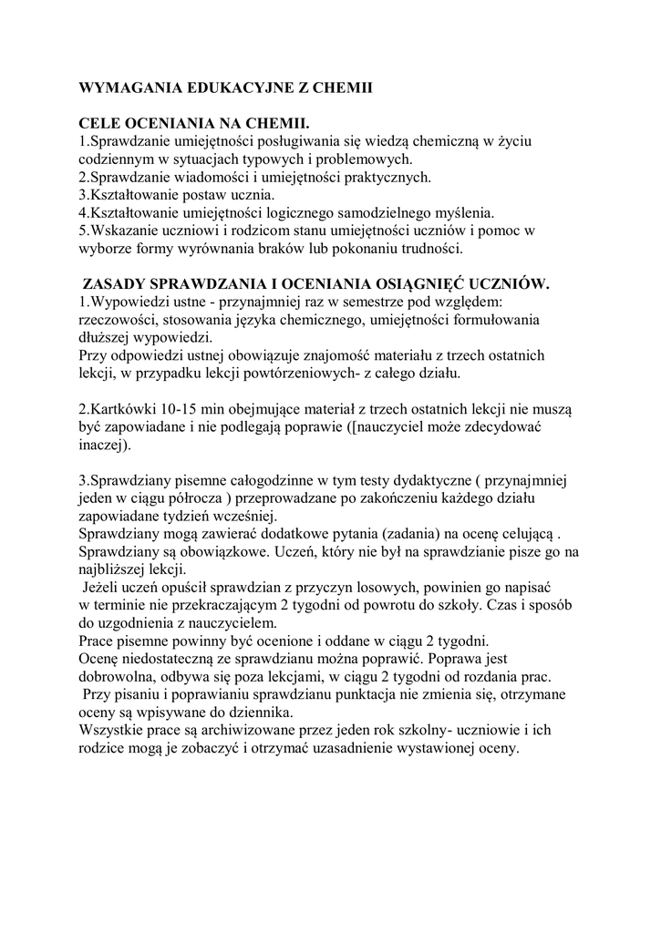WYMAGANIA EDUKACYJNE Z CHEMII CELE OCENIANIA NA CHEMII. 1.Sprawdzanie umiejętności posługiwania się wiedzą chemiczną w życiu codziennym w sytuacjach typowych i problemowych. 2.Sprawdzanie wiadomości i umiejętności praktycznych. 3.Kształtowanie postaw ucznia. 4.Kształtowanie umiejętności logicznego samodzielnego myślenia. 5.Wskazanie uczniowi i rodzicom stanu umiejętności uczniów i pomoc w wyborze formy wyrównania braków lub pokonaniu trudności. ZASADY SPRAWDZANIA I OCENIANIA OSIĄGNIĘĆ UCZNIÓW. 1.Wypowiedzi ustne - przynajmniej raz w semestrze pod względem: rzeczowości, stosowania języka chemicznego, umiejętności formułowania dłuższej wypowiedzi. Przy odpowiedzi ustnej obowiązuje znajomość materiału z trzech ostatnich lekcji, w przypadku lekcji powtórzeniowych- z całego działu. 2.Kartkówki 10-15 min obejmujące materiał z trzech ostatnich lekcji nie muszą być zapowiadane i nie podlegają poprawie ([nauczyciel może zdecydować inaczej). 3.Sprawdziany pisemne całogodzinne w tym testy dydaktyczne ( przynajmniej jeden w ciągu półrocza ) przeprowadzane po zakończeniu każdego działu zapowiadane tydzień wcześniej. Sprawdziany mogą zawierać dodatkowe pytania (zadania) na ocenę celującą . Sprawdziany są obowiązkowe. Uczeń, który nie był na sprawdzianie pisze go na najbliższej lekcji. Jeżeli uczeń opuścił sprawdzian z przyczyn losowych, powinien go napisać w terminie nie przekraczającym 2 tygodni od powrotu do szkoły. Czas i sposób do uzgodnienia z nauczycielem. Prace pisemne powinny być ocenione i oddane w ciągu 2 tygodni. Ocenę niedostateczną ze sprawdzianu można poprawić. Poprawa jest dobrowolna, odbywa się poza lekcjami, w ciągu 2 tygodni od rozdania prac. Przy pisaniu i poprawianiu sprawdzianu punktacja nie zmienia się, otrzymane oceny są wpisywane do dziennika. Wszystkie prace są archiwizowane przez jeden rok szkolny- uczniowie i ich rodzice mogą je zobaczyć i otrzymać uzasadnienie wystawionej oceny. 4.Prace domowe (przynajmniej jedna w ciągu półrocza). 5.Systematyczna obserwacja udziału uczniów w lekcji, w tym aktywność na lekcjach, umiejętność samodzielnego rozwiązywania problemów, współpraca w zespole, udział w dyskusjach prowadzących do wyciągania wniosków. 6.W przypadku sprawdzianów pisemnych lub kartkówek przyjmuje się skalę punktową przeliczaną na oceny cyfrowe wg kryteriów. • ocena celująca.........................100% plus zadanie dodatkowe • bardzo dobra............................90%-100% • dobra........................................75%-89% • dostateczna..............................50%-74% • dopuszczająca..........................30%-49% • niedostateczna.........................0%-29%. 7.Zeszyt ćwiczeń sprawdzany przynajmniej raz w ciągu półrocza ( dotyczy klas pierwszych). 8.Prace dodatkowe, schematy, plansze, rysunki, wykresy, referaty. Przy ocenianiu uwzględnia się: • wkład włożonej pracy, • twórczość pracy, • estetykę wykonania. 9. Uczeń zobowiązany jest do posiadania podręcznika i prowadzenia zeszytu przedmiotowego oraz zeszytu ćwiczeń. Oceny wystawiane przez nauczyciela są jawne. SPOSÓB INFORMOWANIA UCZNIÓW Na pierwszych godzinach lekcyjnych nauczyciel zapoznaje uczniów z wymaganiami edukacyjnymi są one udostępnione są wszystkim uczniom poprzez wywieszenie na gazetce w klasopracowni szkolnej. Oceny cząstkowe są jawne, oparte o opracowane kryteria. Sprawdziany i inne prace pisemne są przechowywane w szkole do końca danego roku szkolnego. SPOSOBY INFORMOWANIA RODZICÓW O ocenach cząstkowych lub klasyfikacyjnych informuje się rodziców na zebraniach rodzicielskich lub w czasie indywidualnych spotkań z rodzicami udostępniając zestawienie ocen i umożliwiając wgląd do dziennika lekcyjnego. Informacja o grożącej ocenie niedostatecznej klasyfikacyjnej jest przekazywana zgodnie z procedurą oceniani wewnątrzszkolnego (statut) ZASADY WYSTAWIANIA OCENY ŚRÓDROCZNEJ I ROCZNEJ Wystawienie oceny klasyfikacyjnej dokonuje się na podstawie ocen cząstkowych, przy czym większą wagę mają oceny ze sprawdzianów , w drugiej kolejności są kartkówki i odpowiedzi ustne Pozostałe oceny mają charakter wspomagający. SPOSOBY KORYGOWANIA NIEPOWODZEŃ SZKOLNYCH I PODNOSZENIA OSIĄGNIĘĆ UCZNIÓW 1.Możliwość poprawy oceny niedostatecznej ze sprawdzianu (testu) . 2.Uczeń może być zwolniony ze sprawdzianu, z kartkówki lub odpowiedzi ustnej w wyjątkowych sytuacjach losowych. 3.Istnieje możliwość konsultacji z nauczycielem w przypadku, gdy uczeń zgłosi chęć uzupełnienia braków z przedmiotu. 4.Pomoc koleżeńska. 5.Uczeń może być nieprzygotowany raz w półroczu (ISTNIEJE MOŻLIWOŚĆ NIE WPISANIA OCENY Z KARTKÓWKI I ODPOWIEDZI USTNEJ). DOSTOSOWANIE WYMAGAŃ EDUKACYJNYCH DLA UCZNIÓW Z DYSFUNKCAMI Znajomości wielu wzorów, symboli, przekształceń można podzielić na mniejsze partie. Tam, gdzie jest taka możliwość, pozwolić na korzystanie z gotowych wzorów, tablic itp. Umożliwia się ustne skomentowanie wykonywanych działań. W ocenie pracy ucznia jest uwzględniana poprawności toku rozumowania, a nie tylko prawidłowości wyniku końcowego. WARUNKI I TRYB UZYSKIWANIA OCENY WYŻSZEJ NIŻ PRZEWIDYWANA Po zapoznaniu się z propozycją oceny rocznej, klasyfikacyjnej uczeń lub jego rodzice mogą zgłosić pisemnie dyrektorowi Zespołu chęć otrzymania oceny wyższej niż przewidywana zgodnie z artykułem 62 Statutu. W ciągu dwóch dni od zgłoszenia uczeń zostaje poinformowany o zakresie materiału przewidzianego do poprawy oraz terminie zaliczenia. Zaliczenie ma formę sprawdzianu ocenianego według skali procentowej przewidzianej dla sprawdzianów.