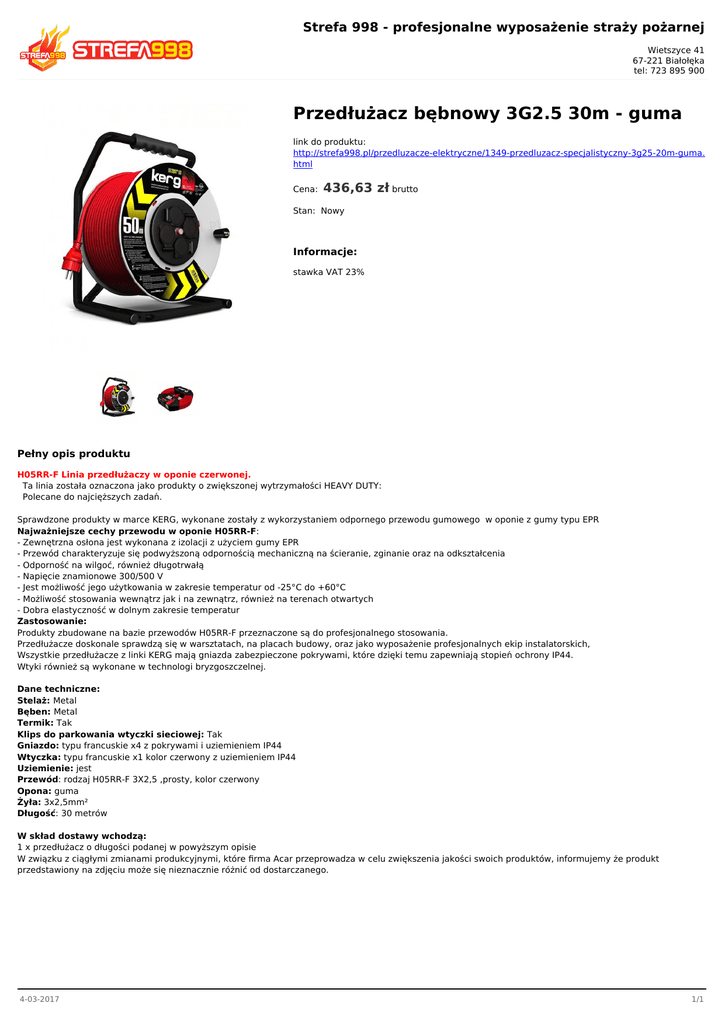 Strefa 998 - profesjonalne wyposażenie straży pożarnej Wietszyce 41 67-221 Białołęka tel: 723 895 900 Przedłużacz bębnowy 3G2.5 30m - guma link do produktu: http://strefa998.pl/przedluzacze-elektryczne/1349-przedluzacz-specjalistyczny-3g25-20m-guma. html Cena: 436,63 zł brutto Stan: Nowy Informacje: stawka VAT 23% Pełny opis produktu H05RR-F Linia przedłużaczy w oponie czerwonej. Ta linia została oznaczona jako produkty o zwiększonej wytrzymałości HEAVY DUTY: Polecane do najcięższych zadań. Sprawdzone produkty w marce KERG, wykonane zostały z wykorzystaniem odpornego przewodu gumowego w oponie z gumy typu EPR Najważniejsze cechy przewodu w oponie H05RR-F: - Zewnętrzna osłona jest wykonana z izolacji z użyciem gumy EPR - Przewód charakteryzuje się podwyższoną odpornością mechaniczną na ścieranie, zginanie oraz na odkształcenia - Odporność na wilgoć, również długotrwałą - Napięcie znamionowe 300/500 V - Jest możliwość jego użytkowania w zakresie temperatur od -25°C do +60°C - Możliwość stosowania wewnątrz jak i na zewnątrz, również na terenach otwartych - Dobra elastyczność w dolnym zakresie temperatur Zastosowanie: Produkty zbudowane na bazie przewodów H05RR-F przeznaczone są do profesjonalnego stosowania. Przedłużacze doskonale sprawdzą się w warsztatach, na placach budowy, oraz jako wyposażenie profesjonalnych ekip instalatorskich, Wszystkie przedłużacze z linki KERG mają gniazda zabezpieczone pokrywami, które dzięki temu zapewniają stopień ochrony IP44. Wtyki również są wykonane w technologi bryzgoszczelnej. Dane techniczne: Stelaż: Metal Bęben: Metal Termik: Tak Klips do parkowania wtyczki sieciowej: Tak Gniazdo: typu francuskie x4 z pokrywami i uziemieniem IP44 Wtyczka: typu francuskie x1 kolor czerwony z uziemieniem IP44 Uziemienie: jest Przewód: rodzaj H05RR-F 3X2,5 ,prosty, kolor czerwony Opona: guma Żyła: 3x2,5mm² Długość: 30 metrów W skład dostawy wchodzą: 1 x przedłużacz o długości podanej w powyższym opisie W związku z ciągłymi zmianami produkcyjnymi, które firma Acar przeprowadza w celu zwiększenia jakości swoich produktów, informujemy że produkt przedstawiony na zdjęciu może się nieznacznie różnić od dostarczanego. 4-03-2017 1/1