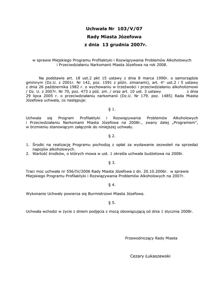 Uchwała Nr 103/V/07 Rady Miasta Józefowa z dnia 13 grudnia 2007r. w sprawie Miejskiego Programu Profilaktyki i Rozwiązywania Problemów Alkoholowych i Przeciwdziałaniu Narkomanii Miasta Józefowa na rok 2008. Na podstawie art. 18 ust.2 pkt 15 ustawy z dnia 8 marca 1990r. o samorządzie gminnym (Dz.U. z 2001r. Nr 142, poz. 1591 z późn. zmianami), art. 4 ust.2 i 5 ustawy z dnia 26 października 1982 r. o wychowaniu w trzeźwości i przeciwdziałaniu alkoholizmowi / Dz. U. z 2007r. Nr 70, poz. 473 z póź. zm. / oraz art. 10 ust. 3 ustawy z dnia 29 lipca 2005 r. o przeciwdziałaniu narkomanii (Dz.U. Nr 179. poz. 1485) Rada Miasta Józefowa uchwala, co następuje: § 1. Uchwala się Program Profilaktyki i Rozwiązywania Problemów Alkoholowych i Przeciwdziałaniu Narkomanii Miasta Józefowa na 2008r., zwany dalej „Programem”, w brzmieniu stanowiącym załącznik do niniejszej uchwały. § 2. 1. Środki na realizację Programu pochodzą z opłat za wydawanie zezwoleń na sprzedaż napojów alkoholowych. 2. Wartość środków, o których mowa w ust. 1 określa uchwała budżetowa na 2008r. § 3. Traci moc uchwała nr 556/IV/2006 Rady Miasta Józefowa z dn. 20.10.2006r. w sprawie Miejskiego Programu Profilaktyki i Rozwiązywania Problemów Alkoholowych na 2007r. § 4. Wykonanie Uchwały powierza się Burmistrzowi Miasta Józefowa. § 5. Uchwała wchodzi w życie z dniem podjęcia z mocą obowiązującą od dnia 1 stycznia 2008r. Przewodniczący Rady Miasta Cezary Łukaszewski Uzasadnienie Zgodnie z art. 4 ustawy z dnia 26 października 1982 r. o wychowaniu w trzeźwości i przeciwdziałaniu Profilaktyki Narkomanii. i alkoholizmowi Rozwiązywania Rada Miasta Problemów uchwala Alkoholowych corocznie i Program Przeciwdziałania W Programie uwzględnione są wszystkie aspekty zapobiegania alkoholizmowi, zadania związane z przeciwdziałaniem narkomanii oraz przestrzegania postanowień w/w ustawy. kontrola Załącznik do uchwały nr 103/V/07 Rady Miasta Józefowa z dnia 13 grudnia 2007r. MIEJSKI PROGRAM PROFILAKTYKI I ROZWIĄZYWANIA PROBLEMÓW ALKOHOLOWYCH ORAZ PRZECIWDZIAŁANIA NARKOMANII MIASTA JÓZEFOWA NA ROK 2008 SPIS TREŚCI WSTĘP.................................................................................................................................... 2 I ZADANIA PROGRAMU.................................................................................................. 2 II MONITORING I EWALUACJA PROBLEMU. .......................................................... 3 III PRZEWIDYWANE REZULTATY I WSKAŹNIKI OSIĄGNIĘĆ........................... 3 IV WYNAGRODZENIE KOMISJI................................................................................... 4 V ZAPLANOWANE WPŁYWY I WYDATKI NA ROK 2008 POCHODZĄCE ZA ZEZWOLENIA NA SPRZEDAŻ ALKOHOLU................................................................. 4 WSTĘP Miejski Program Profilaktyki i Rozwiązywania Problemów Alkoholowych oraz Przeciwdziałaniu Narkomanii na 2008 r. został opracowany zgodnie z treścią ustawy o wychowaniu w trzeźwości i przeciwdziałaniu alkoholizmowi oraz ustawy o przeciwdziałaniu narkomanii. W Programie szczególny nacisk położono na prowadzenie profilaktyki i edukacji wśród dzieci i młodzieży a także edukacji rodziców w zakresie wiedzy o narkotykach i zachowania się dzieci po ich użyciu. I ZADANIA PROGRAMU 1. Cele główne programu: 1) zmniejszenie zjawiska spożywania alkoholu i używania narkotyków; 2) promowanie zdrowego stylu życia w tym działania integrujące mieszkańców Józefowa połączone z aktywnością sportową; 3) edukacja dzieci i młodzieży o szkodliwości alkoholu i narkotyków; 4) edukacja rodziców jak rozpoznać narkotyki i jak poznać czy dziecko jest pod wpływem środka psychotropowego; 5) wspieranie finansowe działań zmierzających do ograniczenia spożycia alkoholu oraz narkotyków. 2. Cele szczegółowe: 1) prowadzenie działań edukacyjnych i informacyjnych również w Szkole Społecznej (średniej i gimnazjum) i ośrodkach wychowawczych o szkodliwości alkoholu i narkotyków; 2) przeprowadzenie szkoleń rodziców dzieci wszystkich szkół, z odnotowaniem ich obecności, nt. rozpoznawania narkotyków oraz objawów u dzieci po ich użyciu. Za przeprowadzenie tych przedsięwzięć w szkołach i ośrodkach wychowawczych odpowiedzialni będą realizatorzy Programu, dyrektorzy szkół i ośrodków, pedagodzy. Szkolenia finansowane będą ze środków „korkowego”; 3) przeprowadzenie działań edukacyjnych w zakresie odpowiedzialności karnej wynikającej z ustawy o przeciwdziałaniu narkomanii oraz ustawy o wychowaniu w trzeźwości. 3. Zadania: 1) prowadzenie, wspieranie finansowe – szkolnych programów profilaktycznych. Zadania realizowane będą przez pedagogów i nauczycieli. Organizowane również będą w szkołach spektakle profilaktyczne; 2) przeprowadzenie spotkań edukacyjnych dla rodziców nt. szkodliwości alkoholu i narkotyków oraz jak rozpoznać czy dziecko bierze narkotyki; 3) dofinansowanie działalności dwóch świetlic środowiskowych; 4) dofinansowanie inwestycji wykończenia pomieszczeń przy kościele pw. św. M. Kolbe w Józefowie, przeznaczonych do utworzenia trzeciej świetlicy środowiskowej. 5) dofinansowanie terapii dla dorosłych dzieci alkoholików (DDA) w Przychodni Leczenia Uzależnień i Współuzależnień w Otwocku; 6) dofinansowanie wypoczynku letniego/zimowego dzieci i młodzieży, pozalekcyjnych zajęć sportowych oraz dożywianie dzieci uczestniczących w programach opiekuńczowychowawczych; 7) przeprowadzenie i sfinansowanie w Józefowie; badań skali zjawiska alkoholizmu i narkomani 8) zakup materiałów informacyjnych w zakresie problematyki alkoholowej i narkotykowej, w tym materiałów do szkoleń sprzedawców napojów alkoholowych; 9) dofinansowanie działalności osób i instytucji zajmujących się rozwiązywaniem problemów uzależnień II MONITORING I EWALUACJA PROBLEMU Wszystkie przedsięwzi