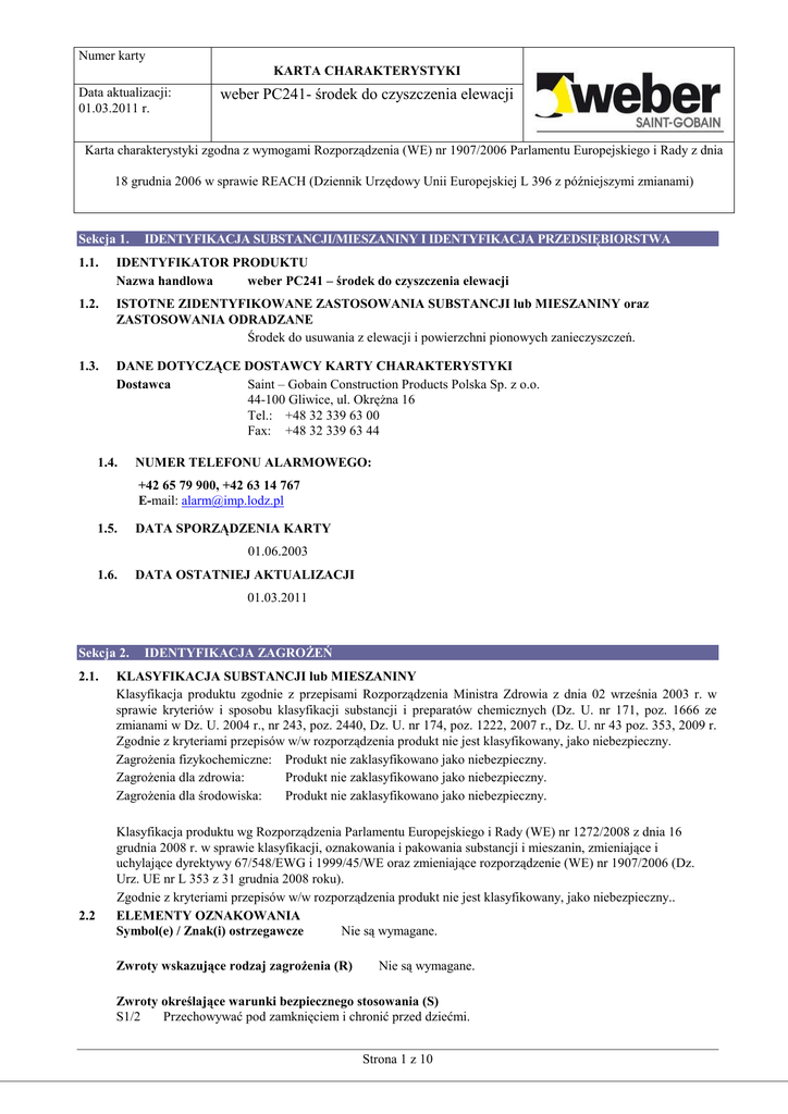Numer karty KARTA CHARAKTERYSTYKI Data aktualizacji: 01.03.2011 r. weber PC241- środek do czyszczenia elewacji Karta charakterystyki zgodna z wymogami Rozporządzenia (WE) nr 1907/2006 Parlamentu Europejskiego i Rady z dnia 18 grudnia 2006 w sprawie REACH (Dziennik Urzędowy Unii Europejskiej L 396 z późniejszymi zmianami) Sekcja 1. IDENTYFIKACJA SUBSTANCJI/MIESZANINY I IDENTYFIKACJA PRZEDSIĘBIORSTWA 1.1. IDENTYFIKATOR PRODUKTU Nazwa handlowa weber PC241 – środek do czyszczenia elewacji 1.2. ISTOTNE ZIDENTYFIKOWANE ZASTOSOWANIA SUBSTANCJI lub MIESZANINY oraz ZASTOSOWANIA ODRADZANE Środek do usuwania z elewacji i powierzchni pionowych zanieczyszczeń. 1.3. DANE DOTYCZĄCE DOSTAWCY KARTY CHARAKTERYSTYKI Dostawca Saint – Gobain Construction Products Polska Sp. z o.o. 44-100 Gliwice, ul. OkręŜna 16 Tel.: +48 32 339 63 00 Fax: +48 32 339 63 44 1.4. NUMER TELEFONU ALARMOWEGO: +42 65 79 900, +42 63 14 767 E-mail: [email protected] 1.5. DATA SPORZĄDZENIA KARTY 01.06.2003 1.6. DATA OSTATNIEJ AKTUALIZACJI 01.03.2011 Sekcja 2. 2.1. 2.2 IDENTYFIKACJA ZAGROśEŃ KLASYFIKACJA SUBSTANCJI lub MIESZANINY Klasyfikacja produktu zgodnie z przepisami Rozporządzenia Ministra Zdrowia z dnia 02 września 2003 r. w sprawie kryteriów i sposobu klasyfikacji substancji i preparatów chemicznych (Dz. U. nr 171, poz. 1666 ze zmianami w Dz. U. 2004 r., nr 243, poz. 2440, Dz. U. nr 174, poz. 1222, 2007 r., Dz. U. nr 43 poz. 353, 2009 r. Zgodnie z kryteriami przepisów w/w rozporządzenia produkt nie jest klasyfikowany, jako niebezpieczny. ZagroŜenia fizykochemiczne: Produkt nie zaklasyfikowano jako niebezpieczny. ZagroŜenia dla zdrowia: Produkt nie zaklasyfikowano jako niebezpieczny. ZagroŜenia dla środowiska: Produkt nie zaklasyfikowano jako niebezpieczny. Klasyfikacja produktu wg Rozporządzenia Parlamentu Europejskiego i Rady (WE) nr 1272/2008 z dnia 16 grudnia 2008 r. w sprawie klasyfikacji, oznakowania i pakowania substancji i mieszanin, zmieniające i uchylające dyrektywy 67/548/EWG i 1999/45/WE oraz zmieniające rozporządzenie (WE) nr 1907/2006 (Dz. Urz. UE nr L 353 z 31 grudnia 2008 roku). Zgodnie z kryteriami przepisów w/w rozporządzenia produkt nie jest klasyfikowany, jako niebezpieczny.. ELEMENTY OZNAKOWANIA Symbol(e) / Znak(i) ostrzegawcze Nie są wymagane. Zwroty wskazujące rodzaj zagroŜenia (R) Nie są wymagane. Zwroty określające warunki bezpiecznego stosowania (S) S1/2 Przechowywać pod zamknięciem i chronić przed dziećmi. Strona 1 z 10 Numer karty KARTA CHARAKTERYSTYKI Data aktualizacji: 01.03.2011 r. weber PC241- środek do czyszczenia elewacji Karta charakterystyki zgodna z wymogami Rozporządzenia (WE) nr 1907/2006 Parlamentu Europejskiego i Rady z dnia 18 grudnia 2006 w sprawie REACH (Dziennik Urzędowy Unii Europejskiej L 396 z późniejszymi zmianami) S26 Zanieczyszczone oczy przemyć natychmiast duŜą ilością wody i zasięgnąć porady lekarza. S29 Nie wprowadzać do kanalizacji. S36/37 Nosić odpowiednią odzieŜ ochronną i odpowiednie rękawice ochronne. Szczególne oznakowanie: Nie jest wymagane. Inne informacje: Atest higieniczny: 51/779/58/2005 Oznakowanie ostrzegawcze zamieszczane na opakowaniu (elementy etykiety GHS): Nazwa: weber PC 241 – środek do czyszczenia elewacji Zawiera: Inne informacje: Atest higieniczny: 51/779/58/2005 Piktogram Kody zwrotów wskazujących rodzaj zagroŜenia W celu uniknięcia zagroŜeń dla zdrowia ludzi i środowiska, naleŜy postępować zgodnie z instrukcją uŜycia. P102 – Chronić przed dziećmi. Zwroty wskazujące środki ostroŜności. Zapobieganie: P280 P264 Reagowanie P305 + P351 + P338 P304 + P340 P312 Przechowywanie P405 Stosować rękawice ochronne/odzieŜ ochronną. Dokładnie umyć ręce po uŜyciu. W PRZYPADKU DOSTANIA SIĘ DO OCZU: OstroŜnie płukać wodą przez kilka minut. Wyjąć soczewki kontaktowe, jeŜeli są i moŜna je łatwo usunąć. W PRZYPADKU DOSTANIA SIĘ DO DRÓG ODDECHOWYCH: wyprowadzić lub wynieść poszkodowanego na świeŜe powietrze i zapewnić warunki do odpoczynku w pozycji umoŜliwiającej swobodne oddychanie. W przypadku złego samopoczucia skontaktować się z OŚRODKIEM ZATRUĆ lub lekarzem. Przechowywać pod zamknięciem. Usuwanie: 2.3. INNE ZAGROśENIA Produkt nie zawiera składników PBT lub vPvB. Sekcja 3. 3.1. SKŁAD/INFORMACJA O SKŁADNIKACH MIESZANINA - Charakterystyka chemiczna Mieszanina w postaci wodnej zawiesiny, złoŜony z dyspersji odpowiednich składników oraz dodatków uzupełniających. Strona 2 z 10 Numer karty KARTA CHARAKTERYSTYKI Data aktualizacji: 01.03.2011 r. weber PC241- środek do czyszczenia elewacji Karta charakterystyki zgodna z wymogami Rozporządzenia (WE) nr 1907/2006 Parlamentu Europejskiego i Rady z dnia 18 grudnia 2006 w sprawie REACH (Dziennik Urzędowy Unii Europejskiej L 396 z późniejszymi zmianami) SKŁADNIKI NIEBEZPIECZNE: Numer CAS 497-19-82 Numer WE Nazwa składnika % (m/m) 207-838-8 węglan sodu Klasyfikacja 1 – 2,5 Xi;R36 Eye Irrit. 2- H319 Znaczenie zwrotów R i H – patrz sekcja 16 Substancje PBT / vPvB Produkt nie zawiera substancji zliczonych do PBT i vPvB. Sekcja 4. 4.1. ŚRODKI PIERWSZEJ POMOCY OPIS ŚRODKÓW PIERWSZEJ POMOCY Zalecenia ogólne - brak Kontakt z okiem Usunąć szkła kontaktowe. Przy podwiniętych powiekach niezwłocznie płukać oczy bieŜącą wodą przez co najmniej 15 minut. Zasięgnąć porady lekarza w przypadku utrzymywania się cech podraŜnienia. Kontakt ze skórą OdzieŜ zanieczyszczoną produktem niezwłocznie zdjąć. Skórę zanieczyszczoną produktem umyć duŜą ilością wody z mydłem i dobrze spłukać. Zasięgnąć porady dermatologa gdy wystąpi podraŜnienie skóry. Wdychanie Wyprowadzić/wynieść poszkodowanego z zagroŜonego obszaru. Zapewnić dostęp świeŜego powietrza i zasięgnąć porady lekarza w przypadku wystąpienia lub utrzymywania się jakichkolwiek dolegliwości. Połknięcie Przepłukać usta wodą. Wypić kilka szklanek wody. Nie wywoływać wymiotów. Osobie nieprzytomn