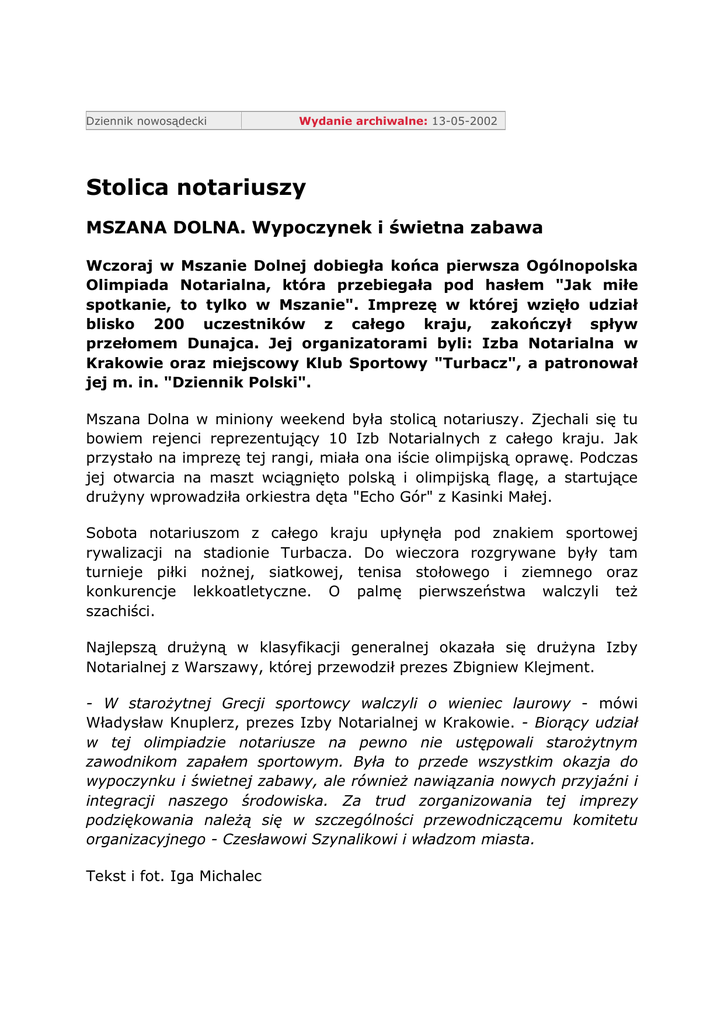 Dziennik nowosądecki Wydanie archiwalne: 13-05-2002 Stolica notariuszy MSZANA DOLNA. Wypoczynek i świetna zabawa Wczoraj w Mszanie Dolnej dobiegła końca pierwsza Ogólnopolska Olimpiada Notarialna, która przebiegała pod hasłem "Jak miłe spotkanie, to tylko w Mszanie". Imprezę w której wzięło udział blisko 200 uczestników z całego kraju, zakończył spływ przełomem Dunajca. Jej organizatorami byli: Izba Notarialna w Krakowie oraz miejscowy Klub Sportowy "Turbacz", a patronował jej m. in. "Dziennik Polski". Mszana Dolna w miniony weekend była stolicą notariuszy. Zjechali się tu bowiem rejenci reprezentujący 10 Izb Notarialnych z całego kraju. Jak przystało na imprezę tej rangi, miała ona iście olimpijską oprawę. Podczas jej otwarcia na maszt wciągnięto polską i olimpijską flagę, a startujące druŜyny wprowadziła orkiestra dęta "Echo Gór" z Kasinki Małej. Sobota notariuszom z całego kraju upłynęła pod znakiem sportowej rywalizacji na stadionie Turbacza. Do wieczora rozgrywane były tam turnieje piłki noŜnej, siatkowej, tenisa stołowego i ziemnego oraz konkurencje lekkoatletyczne. O palmę pierwszeństwa walczyli teŜ szachiści. Najlepszą druŜyną w klasyfikacji generalnej okazała się druŜyna Izby Notarialnej z Warszawy, której przewodził prezes Zbigniew Klejment. - W staroŜytnej Grecji sportowcy walczyli o wieniec laurowy - mówi Władysław Knuplerz, prezes Izby Notarialnej w Krakowie. - Biorący udział w tej olimpiadzie notariusze na pewno nie ustępowali staroŜytnym zawodnikom zapałem sportowym. Była to przede wszystkim okazja do wypoczynku i świetnej zabawy, ale równieŜ nawiązania nowych przyjaźni i integracji naszego środowiska. Za trud zorganizowania tej imprezy podziękowania naleŜą się w szczególności przewodniczącemu komitetu organizacyjnego - Czesławowi Szynalikowi i władzom miasta. Tekst i fot. Iga Michalec