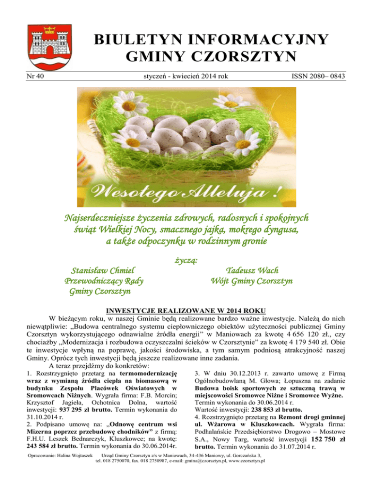 BIULETYN INFORMACYJNY GMINY CZORSZTYN styczeń - kwiecień 2014 rok Nr 40 ISSN 2080– 0843 Najserdeczniejsze życzenia zdrowych, radosnych i spokojnych świąt Wielkiej Nocy, smacznego jajka, mokrego dyngusa, a także odpoczynku w rodzinnym gronie życzą: Stanisław Chmiel Przewodniczący Rady Gminy Czorsztyn Tadeusz Wach Wójt Gminy Czorsztyn INWESTYCJE REALIZOWANE W 2014 ROKU W bieżącym roku, w naszej Gminie będą realizowane bardzo ważne inwestycje. Należą do nich niewątpliwie: „Budowa centralnego systemu ciepłowniczego obiektów użyteczności publicznej Gminy Czorsztyn wykorzystującego odnawialne źródła energii” w Maniowach za kwotę 4 656 120 zł., czy chociażby „Modernizacja i rozbudowa oczyszczalni ścieków w Czorsztynie” za kwotę 4 179 540 zł. Obie te inwestycje wpłyną na poprawę, jakości środowiska, a tym samym podniosą atrakcyjność naszej Gminy. Oprócz tych inwestycji będą jeszcze realizowane inne zadania. A teraz przejdźmy do konkretów: 1. Rozstrzygnięto przetarg na termomodernizację wraz z wymianą źródła ciepła na biomasową w budynku Zespołu Placówek Oświatowych w Sromowcach Niżnych. Wygrała firma: F.B. Morcin; Krzysztof Jagieła, Ochotnica Dolna, wartość inwestycji: 937 295 zł brutto. Termin wykonania do 31.10.2014 r. 2. Podpisano umowę na: „Odnowę centrum wsi Mizerna poprzez przebudowę chodników” z firmą: F.H.U. Leszek Bednarczyk, Kluszkowce; na kwotę: 243 584 zł brutto. Termin wykonania do 30.06.2014r. Opracowanie: Halina Wojtaszek 3. W dniu 30.12.2013 r. zawarto umowę z Firmą Ogólnobudowlaną M. Głowa; Łopuszna na zadanie Budowa boisk sportowych ze sztuczną trawą w miejscowości Sromowce Niżne i Sromowce Wyżne. Termin wykonania do 30.06.2014 r. Wartość inwestycji: 238 853 zł brutto. 4. Rozstrzygnięto przetarg na Remont drogi gminnej ul. Wżarowa w Kluszkowcach. Wygrała firma: Podhalańskie Przedsiębiorstwo Drogowo – Mostowe S.A., Nowy Targ, wartość inwestycji 152 750 zł brutto. Termin wykonania do 31.07.2014 r. Urząd Gminy Czorsztyn z/s w Maniowach, 34-436 Maniowy, ul. Gorczańska 3, tel. 018 2750070, fax. 018 2750987, e-mail: [email protected], www.czorsztyn.pl BIULETYN INFORMACYJNY GMINY CZORSZTYN 5. Podpisano umowę dotyczącą wykonania amfiteatru w Mizernej z firmą Ogólnobudowlaną Marek Głowa, Łopuszna na kwotę: 55 000 zł brutto. Termin wykonania do 31.07.2014 r. Wizualizacja amfiteatru Modernizacja oczyszczalni w Czorsztynie W związku z realizacją tej inwestycji znacznie poprawi się jakość ścieków odprowadzanych do Jeziora Czorsztyńskiego, a tym samym wzrośnie jego atrakcyjność dla osób wypoczywających na jeziorze i w jego otoczeniu. Niestety ta budowa nie zlikwiduje całkowicie problemu pojawiających się co jakiś czas większych ilości zanieczyszczeń, które z nurtem Białki oraz Czarnego i Białego Dunajca wpływają do Jeziora Czorsztyńskiego i w sporej części zatrzymują się w nim. Dlatego więc jest sprawą pilną, by wszystkie gminy, przez które przepływają te rzeki dbały z należytą starannością o swoją gospodarkę wodno – ściekową. Znaczna przecież część mieszkańców naszego regionu utrzymuje się z turystyki, należy więc podjąć pilne działania chroniące piękno naszej przyrody. Remont kuchni i sanitariatów w Izbie Regionalnej w Sromowcach Wyżnych - zakończony W skutek rozstrzygnięcia przetargu, w dniu 16.07.2013 r. Podhalańskie Przedsiębiorstwo Komunalne Sp. z o.o. podpisało umowę z Przedsiębiorstwem Inżynieryjno – Budowlanym i Sieci Sanitarnych ASTEX z Szaflar na modernizację i rozbudowę oczyszczalni ścieków w Czorsztynie. Wartość inwestycji wynosi 4 179 540 zł brutto, natomiast termin jej zakończenia zaplanowano na październik 2014 r. Roboty postępują zgodnie z harmonogramem. Do chwili obecnej wykonano: rozbiórkę istniejących reaktorów oraz pozostałych elementów, uruchomiono tymczasową, kontenerową oczyszczalnię ścieków, wykonano roboty kubaturowe i sieci międzyobiektowe wykonano remont wylotu ścieków oczyszczonych. Rozruch oczyszczalni przewidywany jest w okresie letnim i wczesnej jesieni. 2 przed remontem po remoncie Gminne Centrum Kultury w Kluszkowcach z siedzibą w Maniowach zakończyło realizację projektu pn. "Remont kuchni i sanitariatów w Izbie Regionalnej w Sromowcach Wyżnych". Prace te możliwe były dzięki środkom pozyskanym za pośrednictwem Stowarzyszenia Lokalna Grupa Działania „Gorce – Pieniny” w ramach działania 413 „Wdrażanie lokalnych strategii rozwoju” objętego PROW na lata 2007-2013. Prace remontowe wykonywane były przez firmę INSTAL - BUD Budownictwo Ogólne i Instalacje Sanitarne ze Sromowiec Wyżnych. W dniu 17 marca br. prace zostały komisyjnie odebrane. Ogólna wartość zadania – 26 468 zł Kwota przyznanej pomocy na realizację zadania – 17 491 zł. J. Plewa Urząd Gminy Czorsztyn z/s w Maniowach, 34-436 Maniowy, ul. Gorczańska 3, tel. 018 2750070, fax. 018 2750987, e-mail: [email protected], www.czorsztyn.pl BIULETYN INFORMACYJNY GMINY CZORSZTYN Rozbudowa oświetlenia ulicznego w Sromowcach Niżnych Gmina Czorsztyn zleciła Firmie „Manstel”, Maniowy wykonanie budowy oświetlenia ulicznego na ul. Pienińskiej w Sromowcach Niżnych. Prace rozpoczęto już 19 marca br., natomiast termin wykonania ustalono na połowę maja br. Kwota wynagrodzenia wynosi 31 552 zł (brutto). Dodatkowe środki finansowe na „Budowa centralnego systemu ciepłowniczego obiektów użyteczności publicznej Gminy Czorsztyn wykorzystującego odnawialne źródła energii”. Po usilnych staraniach władz Gminy Czorsztyn udało się uzyskać dofinansowanie od Marszałka Województwa Małopolskiego do inwestycji: „Budowa centralnego systemu ciepłowniczego obiektów użyteczności publicznej Gminy Czorsztyn”. W dniu 31.03.2014 r. na XLIX sesji SWM została podjęta uchwała w sprawie udzielenia dotacji dla gminy Czorsztyn w wysokości 280 000 zł. T