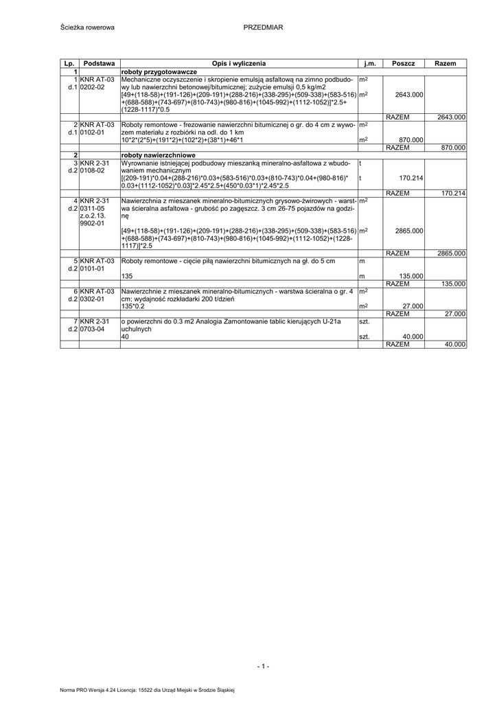 Ścieżka rowerowa PRZEDMIAR Lp. Podstawa Opis i wyliczenia j.m. 1 roboty przygotowawcze 1 KNR AT-03 Mechaniczne oczyszczenie i skropienie emulsją asfaltową na zimno podbudo- m2 d.1 0202-02 wy lub nawierzchni betonowej/bitumicznej; zużycie emulsji 0,5 kg/m2 [49+(118-58)+(191-126)+(209-191)+(288-216)+(338-295)+(509-338)+(583-516) m2 +(688-588)+(743-697)+(810-743)+(980-816)+(1045-992)+(1112-1052)]*2.5+ (1228-1117)*0.5 Poszcz 2643.000 RAZEM 2 KNR AT-03 d.1 0102-01 2 3 KNR 2-31 d.2 0108-02 Roboty remontowe - frezowanie nawierzchni bitumicznej o gr. do 4 cm z wywo- m2 zem materiału z rozbiórki na odl. do 1 km 10*2*(2*5)+(191*2)+(102*2)+(38*1)+46*1 m2 roboty nawierzchniowe Wyrownanie istniejącej podbudowy mieszanką mineralno-asfaltowa z wbudowaniem mechanicznym [(209-191)*0.04+(288-216)*0.03+(583-516)*0.03+(810-743)*0.04+(980-816)* 0.03+(1112-1052)*0.03]*2.45*2.5+(450*0.03*1)*2.45*2.5 870.000 RAZEM t 170.214 7 KNR 2-31 d.2 0703-04 170.214 2865.000 RAZEM 6 KNR AT-03 d.2 0302-01 870.000 Nawierzchnia z mieszanek mineralno-bitumicznych grysowo-żwirowych - warst- m2 wa ścieralna asfaltowa - grubość po zagęszcz. 3 cm 26-75 pojazdów na godzinę [49+(118-58)+(191-126)+(209-191)+(288-216)+(338-295)+(509-338)+(583-516) m2 +(688-588)+(743-697)+(810-743)+(980-816)+(1045-992)+(1112-1052)+(12281117)]*2.5 5 KNR AT-03 d.2 0101-01 2643.000 t RAZEM 4 KNR 2-31 d.2 0311-05 z.o.2.13. 9902-01 Razem Roboty remontowe - cięcie piłą nawierzchni bitumicznych na gł. do 5 cm m 135 m Nawierzchnie z mieszanek mineralno-bitumicznych - warstwa ścieralna o gr. 4 m2 cm; wydajność rozkładarki 200 t/dzień 135*0.2 m2 o powierzchni do 0.3 m2 Analogia Zamontowanie tablic kierujących U-21a uchulnych 40 -1- Norma PRO Wersja 4.24 Licencja: 15522 dla Urząd Miejski w Środzie Śląskiej 2865.000 135.000 RAZEM 135.000 27.000 RAZEM 27.000 40.000 RAZEM 40.000 szt. szt.