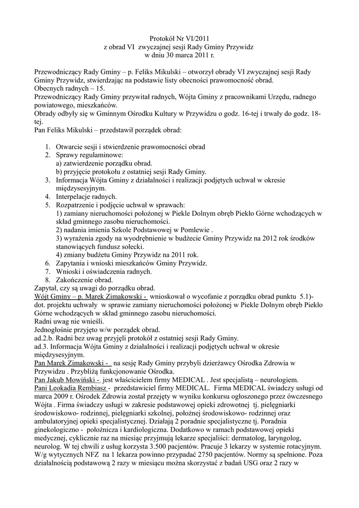 Protokół Nr VI/2011 z obrad VI zwyczajnej sesji Rady Gminy Przywidz w dniu 30 marca 2011 r. Przewodniczący Rady Gminy – p. Feliks Mikulski – otworzył obrady VI zwyczajnej sesji Rady Gminy Przywidz, stwierdzając na podstawie listy obecności prawomocność obrad. Obecnych radnych – 15. Przewodniczący Rady Gminy przywitał radnych, Wójta Gminy z pracownikami Urzędu, radnego powiatowego, mieszkańców. Obrady odbyły się w Gminnym Ośrodku Kultury w Przywidzu o godz. 16-tej i trwały do godz. 18tej. Pan Feliks Mikulski – przedstawił porządek obrad: 1. Otwarcie sesji i stwierdzenie prawomocności obrad 2. Sprawy regulaminowe: a) zatwierdzenie porządku obrad. b) przyjęcie protokołu z ostatniej sesji Rady Gminy. 3. Informacja Wójta Gminy z działalności i realizacji podjętych uchwał w okresie międzysesyjnym. 4. Interpelacje radnych. 5. Rozpatrzenie i podjęcie uchwał w sprawach: 1) zamiany nieruchomości położonej w Piekle Dolnym obręb Piekło Górne wchodzących w skład gminnego zasobu nieruchomości. 2) nadania imienia Szkole Podstawowej w Pomlewie . 3) wyrażenia zgody na wyodrębnienie w budżecie Gminy Przywidz na 2012 rok środków stanowiących fundusz sołecki. 4) zmiany budżetu Gminy Przywidz na 2011 rok. 6. Zapytania i wnioski mieszkańców Gminy Przywidz. 7. Wnioski i oświadczenia radnych. 8. Zakończenie obrad. Zapytał, czy są uwagi do porządku obrad. Wójt Gminy – p. Marek Zimakowski - wnioskował o wycofanie z porządku obrad punktu 5.1)dot. projektu uchwały w sprawie zamiany nieruchomości położonej w Piekle Dolnym obręb Piekło Górne wchodzących w skład gminnego zasobu nieruchomości. Radni uwag nie wnieśli. Jednogłośnie przyjęto w/w porządek obrad. ad.2.b. Radni bez uwag przyjęli protokół z ostatniej sesji Rady Gminy. ad.3. Informacja Wójta Gminy z działalności i realizacji podjętych uchwał w okresie międzysesyjnym. Pan Marek Zimakowski - na sesję Rady Gminy przybyli dzierżawcy Ośrodka Zdrowia w Przywidzu . Przybliżą funkcjonowanie Ośrodka. Pan Jakub Mowiński - jest właścicielem firmy MEDICAL . Jest specjalistą – neurologiem. Pani Leokadia Rembiasz - przedstawiciel firmy MEDICAL. Firma MEDICAL świadczy usługi od marca 2009 r. Ośrodek Zdrowia został przejęty w wyniku konkursu ogłoszonego przez ówczesnego Wójta . Firma świadczy usługi w zakresie podstawowej opieki zdrowotnej tj. pielęgniarki środowiskowo- rodzinnej, pielęgniarki szkolnej, położnej środowiskowo- rodzinnej oraz ambulatoryjnej opieki specjalistycznej. Działają 2 poradnie specjalistyczne tj. Poradnia ginekologiczno - położnicza i kardiologiczna. Dodatkowo w ramach podstawowej opieki medycznej, cyklicznie raz na miesiąc przyjmują lekarze specjaliści: dermatolog, laryngolog, neurolog. W tej chwili z usług korzysta 3.500 pacjentów. Pracuje 3 lekarzy w systemie rotacyjnym. W/g wytycznych NFZ na 1 lekarza powinno przypadać 2750 pacjentów. Normy są spełnione. Poza działalnością podstawową 2 razy w miesiącu można skorzystać z badań USG oraz 2 razy w tygodniu jest pobór materiałów. Następnie p. Rembiasz przybliżyła dane statystyczne . Średnio miesięcznie przyjmuje się 1.200 pacjentów, tj. ok. 60 dziennie. W sezonie letnim dużo przyjmuje się letników. W ofercie konkursowej firma MEDICAL była zobowiązana do wykonania szeregu prac . W związku z tym firma korzystała z preferencyjnych warunków dzierżawy. Prace, które wykonano to min. utwardzenie części parkingu dla pacjentów, wykonano naprawę pokrycia dachowego na budynku ośrodka, dokonano modernizacji i remontu kotłowni w przychodni i remontu Apteki. . Z piętra przeniesiono poradnię ginekologiczną . Łączny koszt nakładów wyniósł – 243.000 zł. W ub. tygodniu podpisano z Panem Wójtem aneks do umowy, gdyż minął okres preferencyjny i będziemy płacić normalną stawkę czynszu wg. stawek uchwalonych przez Radę Gminy. Przewodniczący Rady Gminy - czy są pytania? Wiceprzewodniczący Rady – p. Robert Deja - na komisji społecznej, oświaty i sportu koledzy z komisji mieli pytania do firmy MEDICAL. Może teraz zgłoszą, aby 2 razy Państwa nie wzywać. Radny Jarosław Labuda - to nie są pytania na sesję. Wójt Gminy - w uzupełnieniu dodał, że na spotkaniu rozmawiano o jakości świadczonych usług, funkcjonowaniu Apteki. Podpisano Aneks do umowy. Ewa Waloch - mieszkaniec Borowiny – osoby niepełnosprawne korzystają z usług przychodni. Wejście z chodnika do przychodni jest niedostosowane dla osób niepełnosprawnych. Poręcz jest przy schodach. Natomiast nie ma jej przy schodach od chodnika. Pani Leokadia Rembiasz - przyjrzymy się temu problemowi i wspólnie z p. Wójtem podejmiemy decyzję. Radna Maria Ścibek - na jaki okres podpisano Aneks do umowy? Pani L. Rembiasz – na 15 lat licząc od 2009 r. Przez 2 lata MEDICAL płacił preferencyjne stawki dzierżawy . Obecnie płacimy stawkę komercyjną Wójt Gminy - do momentu podpisania Aneksu, stawka wynosiła ok.250 zł miesięcznie, obecnie ok. 6,5 tys. zł miesięcznie. P. Leokadia Rembiasz - a do tego dochodzą jeszcze koszty dzierżawy wyposażenia. Pani Grażyna Ropela – sołtys Michalina - jak funkcjonuje poradnia kardiologiczna? P. L. Rembiasz - do 2013 roku poradnia będzie. P. Robert Deja - był z dzieckiem do pobrania krwi w Ośrodku Zdrowia. Zdarzyło się tak, że nie było młodej pielęgniarki i nie było komu pobrać tej krwi. Otrzymał informację, że trzeba jechać do Gdańska do ETC. Gdy drugi raz był z dzieckiem w Ośrodku Zdrowia, była ta pielęgniarka i pobrała krew od dziecka. Na przyszłość, aby takich sytuacji nie było. P. L.Rembiasz - pobieranie krwi u dziecka małego jest specyficzne. Nie każdy daje sobie radę z pobieraniem krwi u dziecka. Mogę zwrócić uwagę, żeby pielęgniarki pobierały krew od dzieci bez względu na wiek. Pan Wojciech Etmański - Radny powiatu Gdańskiego – ile wynosi dzierżawa 1m2 . P. Leokadia Rembiasz - 