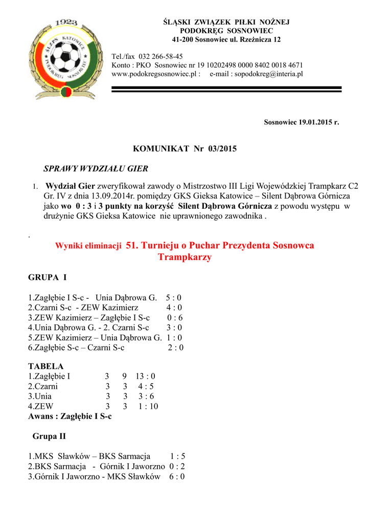 ŚLĄSKI ZWIĄZEK PIŁKI NOŻNEJ PODOKRĘG SOSNOWIEC 41-200 Sosnowiec ul. Rzeżnicza 12 Tel./fax 032 266-58-45 Konto : PKO Sosnowiec nr 19 10202498 0000 8402 0018 4671 www.podokregsosnowiec.pl : e-mail : [email protected] Sosnowiec 19.01.2015 r. KOMUNIKAT Nr 03/2015 SPRAWY WYDZIAŁU GIER 1. Wydział Gier zweryfikował zawody o Mistrzostwo III Ligi Wojewódzkiej Trampkarz C2 Gr. IV z dnia 13.09.2014r. pomiędzy GKS Gieksa Katowice – Silent Dąbrowa Górnicza jako wo 0 : 3 i 3 punkty na korzyść Silent Dąbrowa Górnicza z powodu występu w drużynie GKS Gieksa Katowice nie uprawnionego zawodnika . . Wyniki eliminacji 51. Turnieju o Puchar Prezydenta Sosnowca Trampkarzy GRUPA I 1.Zagłębie I S-c - Unia Dąbrowa G. 2.Czarni S-c - ZEW Kazimierz 3.ZEW Kazimierz – Zagłębie I S-c 4.Unia Dąbrowa G. - 2. Czarni S-c 5.ZEW Kazimierz – Unia Dąbrowa G. 6.Zagłębie S-c – Czarni S-c TABELA 1.Zagłębie I 3 2.Czarni 3 3.Unia 3 4.ZEW 3 Awans : Zagłębie I S-c 5:0 4:0 0:6 3:0 1:0 2:0 9 13 : 0 3 4:5 3 3:6 3 1 : 10 Grupa II 1.MKS Sławków – BKS Sarmacja 1:5 2.BKS Sarmacja - Górnik I Jaworzno 0 : 2 3.Górnik I Jaworzno - MKS Sławków 6 : 0 TABELA 1.Górnik I 2 6 8:0 2.Sarmacja 2 3 5:3 3.Sławków 2 0 11 : 1 Awans : Górnik I Jaworzno GRUIPA IV 1.Warta Zawiercie – CKS Czeladż 1 : 1 2.CKS Czeladż - Zagłębie II S-c 3 : 1 3.Warta Zawiercie – Zagłębie II S-c 1: 5 Tabela 1.CKC 2 4 4:2 2.Zagłębie II 2 3 6:4 3.Warta 2 1 2:6 Awans: CKS Czeladż GRUPA III 1.Silent Dąbrowa G. 2.Górnik II Jaworzno 3.SAS Wojkowice 4.Unia Ząbkowice 5.SAS Wojkowice 6.Silent Dąbrowa G. – Tabel 1.Górnik II Jaworzno 2. Silent Dąbrowa G. 3. .Unia Ząbkowice 4 SAS Wojkowice Awans: Górnik II Jaworzno Unia Ząbkowice 2 : 0 SAS Wojkowice 3 : 2 Silent Dąbrowa G. 1 : 6 Górnik II Jaworzno 2 : 2 Unia Ząbkowice 0 : 1 Górnik II Jaworzno 1 :2 3 7 7:5 3 6 9:2 3 1 3:4 3 0 3 : 10 Na Turniej nie zgłosiły się Kluby: AKS Niwka MUKP Dąbrowa Górnicza Cyklon Rogożnik Zwycięscy grup oraz zaproszone drużyny: KS Górnik Zabrze i KS Ruch Chorzów rozegrają FINAŁ dnia 25.01.2015r godz. 8:00 w Hali Sportowej przy ulicy Żeromskiego w Sosnowcu. GRUPY FINAŁOWE GRUPA I 1.Zagłębie I sosnowiec 2.Górnik II Jaworzno 3.Górnik Zabrze GRUPA II 1.Górnik I Jaworzno 2.CKS Czeladż 3.Ruch Chorzów SEKRETARZ WYDZIAŁU GIER PRZEWODNICZĄCY WYDZIAŁU GIER TADEUSZ KORUSIEWICZ HENRYK KUREK