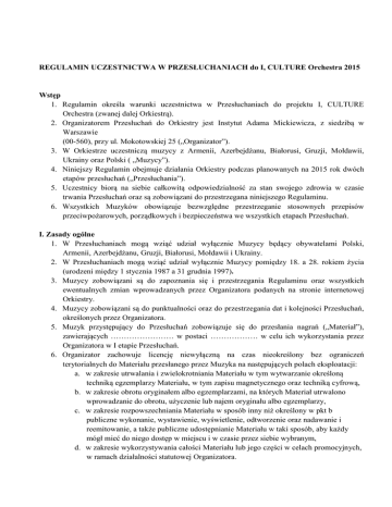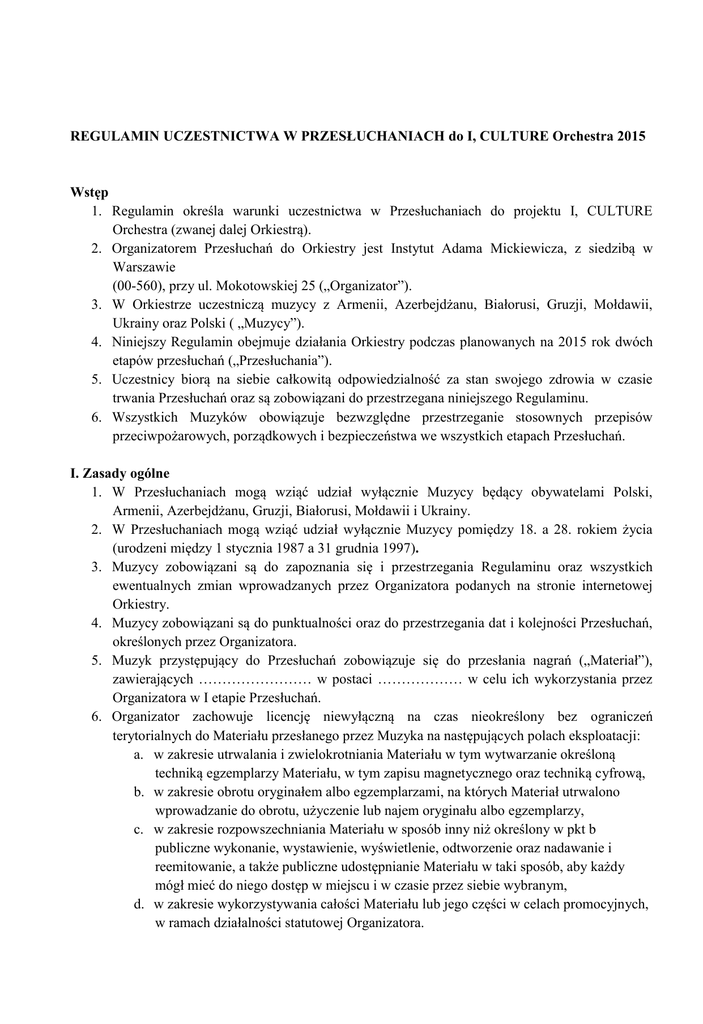 REGULAMIN UCZESTNICTWA W PRZESŁUCHANIACH do I, CULTURE Orchestra 2015 Wstęp 1. Regulamin określa warunki uczestnictwa w Przesłuchaniach do projektu I, CULTURE Orchestra (zwanej dalej Orkiestrą). 2. Organizatorem Przesłuchań do Orkiestry jest Instytut Adama Mickiewicza, z siedzibą w Warszawie (00-560), przy ul. Mokotowskiej 25 („Organizator”). 3. W Orkiestrze uczestniczą muzycy z Armenii, Azerbejdżanu, Białorusi, Gruzji, Mołdawii, Ukrainy oraz Polski ( „Muzycy”). 4. Niniejszy Regulamin obejmuje działania Orkiestry podczas planowanych na 2015 rok dwóch etapów przesłuchań („Przesłuchania”). 5. Uczestnicy biorą na siebie całkowitą odpowiedzialność za stan swojego zdrowia w czasie trwania Przesłuchań oraz są zobowiązani do przestrzegana niniejszego Regulaminu. 6. Wszystkich Muzyków obowiązuje bezwzględne przestrzeganie stosownych przepisów przeciwpożarowych, porządkowych i bezpieczeństwa we wszystkich etapach Przesłuchań. I. Zasady ogólne 1. W Przesłuchaniach mogą wziąć udział wyłącznie Muzycy będący obywatelami Polski, Armenii, Azerbejdżanu, Gruzji, Białorusi, Mołdawii i Ukrainy. 2. W Przesłuchaniach mogą wziąć udział wyłącznie Muzycy pomiędzy 18. a 28. rokiem życia (urodzeni między 1 stycznia 1987 a 31 grudnia 1997). 3. Muzycy zobowiązani są do zapoznania się i przestrzegania Regulaminu oraz wszystkich ewentualnych zmian wprowadzanych przez Organizatora podanych na stronie internetowej Orkiestry. 4. Muzycy zobowiązani są do punktualności oraz do przestrzegania dat i kolejności Przesłuchań, określonych przez Organizatora. 5. Muzyk przystępujący do Przesłuchań zobowiązuje się do przesłania nagrań („Materiał”), zawierających …………………… w postaci ……………… w celu ich wykorzystania przez Organizatora w I etapie Przesłuchań. 6. Organizator zachowuje licencję niewyłączną na czas nieokreślony bez ograniczeń terytorialnych do Materiału przesłanego przez Muzyka na następujących polach eksploatacji: a. w zakresie utrwalania i zwielokrotniania Materiału w tym wytwarzanie określoną techniką egzemplarzy Materiału, w tym zapisu magnetycznego oraz techniką cyfrową, b. w zakresie obrotu oryginałem albo egzemplarzami, na których Materiał utrwalono wprowadzanie do obrotu, użyczenie lub najem oryginału albo egzemplarzy, c. w zakresie rozpowszechniania Materiału w sposób inny niż określony w pkt b publiczne wykonanie, wystawienie, wyświetlenie, odtworzenie oraz nadawanie i reemitowanie, a także publiczne udostępnianie Materiału w taki sposób, aby każdy mógł mieć do niego dostęp w miejscu i w czasie przez siebie wybranym, d. w zakresie wykorzystywania całości Materiału lub jego części w celach promocyjnych, w ramach działalności statutowej Organizatora. 7. Udzielam nadto Organizatorowi prawa do wykonywania oraz zezwalania osobom trzecim na wykonywanie zależnych praw autorskich do Materiału, na w/w polach eksploatacji. 8. Muzyk biorący udział II etapie Przesłuchań i/lub zakwalifikowany do Projektu I,CULTURE ORCHESTRA 2015, zobowiązuje się do podpisania Oświadczenia, które stanowi Załącznik do niniejszego Regulaminu 9. Organizator nie pokrywa kosztów dojazdów i noclegów na Przesłuchania poniesionych przez Muzyków, a także nie zapewnia ubezpieczenia zdrowia, życia oraz mienia Muzyków. II. Przesłuchania do Orkiestry 1. Przesłuchania do Orkiestry odbędą się w dwóch etapach: 2. I etap Przesłuchań odbywa się w dniach 24.11.2014 – 16.01.2015 3. W celu wzięcia udziału w I etapie Przesłuchań, należy zarejestrować się na stronie internetowej www.orchestra.iam.pl w dniach od 24 listopada 2014 do 16 stycznia 2015. Rejestracja uprawnia Muzyka do zalogowania się i umieszczenia nagrania wideo z własnym wykonaniem utworów wymaganych w I etapie przesłuchań dla danego instrumentu w dniach 24 listopada 2014 – 16 stycznia 2015 roku, wg instrukcji zamieszczonej na stronie Orkiestry. Zamieszczenie nagrań wideo z repertuarem innym niż podany w regulaminie przesłuchań dyskwalifikuje kandydata z udziału w Przesłuchaniach. 4. Dopuszczalne jest zgłoszenie wymaganego repertuaru podzielonego na kilka nagrań video. 5. Na nagraniu wideo widoczny musi być aparat gry oraz twarz kandydata. 6. Nagranie wideo może być zapisane w formacie AVI, FLV (flash), MOV (quicktime). 7. Zamieszczone nagrania wideo kandydata z etapu I widoczne są tylko i wyłącznie dla Organizatora, tutorów oraz dyrygenta Orkiestry. 8. Lista osób zakwalifikowanych do II etapu Przesłuchań zostanie ogłoszona dnia 6 lutego 2015. Kandydaci zostaną poinformowani o wynikach drogą mailową. 9. II etap Przesłuchań odbędzie się w następujących miastach: 02-05.03.2015 - Warszawa 06.03.2015 - Gdańsk 10.03.2015 - Baku 11-12.03.2015 - Tbilisi 16.03.2015 - Erywań 18.03.2015 - Kiszyniów 20-21.03.2015 - Kijów 23.03.2015 - Lwów 25.03.2015 - Mińsk 10. Adresy miejsc Przesłuchań w miastach zostaną zamieszczone na stronie internetowej Orkiestry. Muzycy zobowiązani są do punktualnego przybycia na Przesłuchania. Nieobecność kandydata o wyznaczonej godzinie podczas II etapu Przesłuchań, która nie zostanie zgłoszona najpóźniej na dzień przed rozpoczęciem Przesłuchań w danym mieście, dyskwalifikuje kandydata z udziału w Przesłuchaniach do Orkiestry w roku bieżącym. 11. Organizator ogłosi listę osób przyjętych do Orkiestry dnia 27 kwietnia 2015. 12. Selekcji muzyków w obu etapach Przesłuchań dokonuje panel tutorów ICO w porozumieniu z dyrygentem ICO. Decyzja Organizatorów o wyborze uczestników Orkiestry jest ostateczna i niepodważalna. Na powyższą decyzję odwołanie nie przysługuje. 13. Muzyk, który zostanie przyjęty do Orkiestry ma prawo zgłosić rezygnację z udziału w projekcie I, CULTURE Orchestra do dnia ……………… 14. W przypadku rezygnacji przez Muzyka w udziale w projekcie I, CULTURE Orchestra po dniu ………