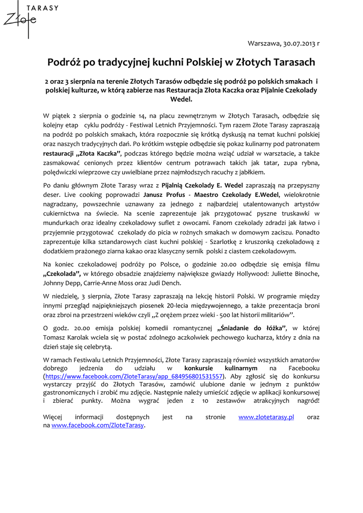 Warszawa, 30.07.2013 r Podróż po tradycyjnej kuchni Polskiej w Złotych Tarasach 2 oraz 3 sierpnia na terenie Złotych Tarasów odbędzie się podróż po polskich smakach i polskiej kulturze, w którą zabierze nas Restauracja Złota Kaczka oraz Pijalnie Czekolady Wedel. W piątek 2 sierpnia o godzinie 14, na placu zewnętrznym w Złotych Tarasach, odbędzie się kolejny etap cyklu podróży - Festiwal Letnich Przyjemności. Tym razem Złote Tarasy zapraszają na podróż po polskich smakach, która rozpocznie się krótką dyskusją na temat kuchni polskiej oraz naszych tradycyjnych dań. Po krótkim wstępie odbędzie się pokaz kulinarny pod patronatem restauracji „Złota Kaczka”, podczas którego będzie można wziąć udział w warsztacie, a także zasmakować cenionych przez klientów centrum potrawach takich jak tatar, zupa rybna, polędwiczki wieprzowe czy uwielbiane przez najmłodszych racuchy z jabłkiem. Po daniu głównym Złote Tarasy wraz z Pijalnią Czekolady E. Wedel zapraszają na przepyszny deser. Live cooking poprowadzi Janusz Profus - Maestro Czekolady E.Wedel, wielokrotnie nagradzany, powszechnie uznawany za jednego z najbardziej utalentowanych artystów cukiernictwa na świecie. Na scenie zaprezentuje jak przygotować pyszne truskawki w mundurkach oraz idealny czekoladowy suflet z owocami. Fanom czekolady zdradzi jak łatwo i przyjemnie przygotować czekolady do picia w rożnych smakach w domowym zaciszu. Ponadto zaprezentuje kilka sztandarowych ciast kuchni polskiej - Szarlotkę z kruszonką czekoladową z dodatkiem prażonego ziarna kakao oraz klasyczny sernik polski z ciastem czekoladowym. Na koniec czekoladowej podróży po Polsce, o godzinie 20.00 odbędzie się emisja filmu „Czekolada”, w którego obsadzie znajdziemy największe gwiazdy Hollywood: Juliette Binoche, Johnny Depp, Carrie-Anne Moss oraz Judi Dench. W niedzielę, 3 sierpnia, Złote Tarasy zapraszają na lekcję historii Polski. W programie między innymi przegląd najpiękniejszych piosenek 20-lecia międzywojennego, a także prezentacja broni oraz zbroi na przestrzeni wieków czyli „Z orężem przez wieki - 500 lat historii militariów”. O godz. 20.00 emisja polskiej komedii romantycznej „Śniadanie do łóżka”, w której Tomasz Karolak wciela się w postać zdolnego aczkolwiek pechowego kucharza, który z dnia na dzień staje się celebrytą. W ramach Festiwalu Letnich Przyjemności, Złote Tarasy zapraszają również wszystkich amatorów dobrego jedzenia do udziału w konkursie kulinarnym na Facebooku (https://www.facebook.com/ZloteTarasy/app_684956801531557). Aby zgłosić się do konkursu wystarczy przyjść do Złotych Tarasów, zamówić ulubione danie w jednym z punktów gastronomicznych i zrobić mu zdjęcie. Następnie należy umieścić zdjęcie w aplikacji konkursowej i zbierać punkty. Można wygrać jeden z 10 zestawów atrakcyjnych nagród! Więcej informacji dostępnych na www.facebook.com/ZloteTarasy. jest na stronie www.zlotetarasy.pl oraz Złote Tarasy to wielofunkcyjny kompleks, który powstał w samym sercu Warszawy. Obiekt mieści się między ulicami: Złotą i Emilii Plater oraz Dworcem Centralnym i Al. Jana Pawła II. Jego symbolem jest pofalowany szklany dach o powierzchni 1 hektara. Nazwa Złote Tarasy nawiązuje do ulicy Złotej i do architektury budynku. Kaskadowo rozmieszczone tarasy obejmują dwa place miejskie – wewnętrzny z fontanną oraz zewnętrzny, otoczony restauracjami. Na pięciu poziomach centrum klienci znajdą ponad 200 marek handlowych, kilkadziesiąt restauracji i kawiarni, kluby muzyczne, kino, klub fitness oraz szereg punktów usługowych. Projekt i funkcjonalność obiektu zostały już wielokrotnie nagrodzone. Złote Tarasy są zdobywcą tytułu najlepszego projektu komercyjnego na świecie (MIPIM Architectural Review Future Project Awards). Więcej na stronie internetowej www.zlotetarasy.pl Dalszych informacji udzielą: Marta Kucewicz Cohn&Wolfe Sp. z o. o. m:+48 510 089 436 p: +48 (22) 2500 900 [email protected] Aleksandra Jarowska Cohn&Wolfe Sp. z o. o. m:+48 500 113 670 p: +48 (22) 2500 900 [email protected]