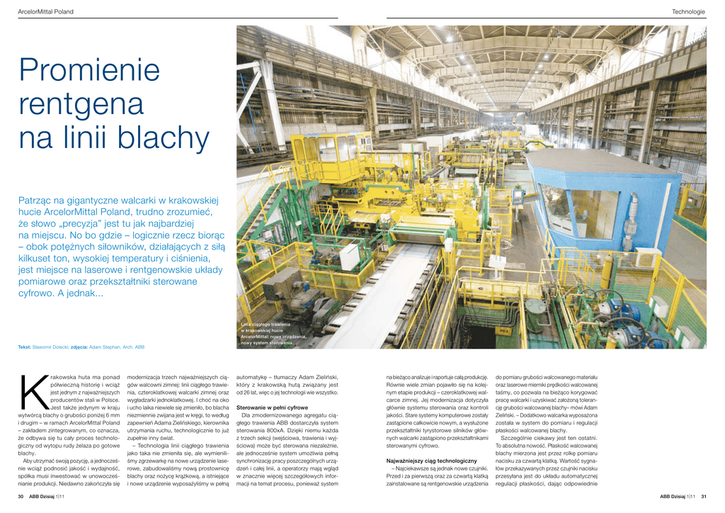 ArcelorMittal Poland Technologie Promienie rentgena na linii blachy Patrząc na gigantyczne walcarki w krakowskiej hucie ArcelorMittal Poland, trudno zrozumieć, że słowo „precyzja” jest tu jak najbardziej na miejscu. No bo gdzie – logicznie rzecz biorąc – obok potężnych siłowników, działających z siłą kilkuset ton, wysokiej temperatury i ciśnienia, jest miejsce na laserowe i rentgenowskie układy pomiarowe oraz przekształtniki sterowane cyfrowo. A jednak... Tekst: Sławomir Dolecki; zdjęcia: Adam Stephan, Arch. ABB K rakowska huta ma ponad półwieczną historię i wciąż jest jednym z najważniejszych producentów stali w Polsce. Jest także jedynym w kraju wytwórcą blachy o grubości poniżej 6 mm i drugim – w ramach ArcelorMittal Poland – zakładem zintegrowanym, co oznacza, że odbywa się tu cały proces technologiczny od wytopu rudy żelaza po gotowe blachy. Aby utrzymać swoją pozycję, a jednocześnie wciąż podnosić jakość i wydajność, spółka musi inwestować w unowocześnianie produkcji. Niedawno zakończyła się 30 ABB Dzisiaj 1|11 modernizacja trzech najważniejszych ciągów walcowni zimnej: linii ciągłego trawienia, czteroklatkowej walcarki zimnej oraz wygładzarki jednoklatkowej. I choć na oko i ucho laika niewiele się zmieniło, bo blacha niezmiennie zwijana jest w kręgi, to według zapewnień Adama Zielińskiego, kierownika utrzymania ruchu, technologicznie to już zupełnie inny świat. – Technologia linii ciągłego trawienia jako taka nie zmieniła się, ale wymieniliśmy zgrzewarkę na nowe urządzenie laserowe, zabudowaliśmy nową prostownicę blachy oraz nożycę krążkową, a istniejące i nowe urządzenie wyposażyliśmy w pełną Linia ciągłego trawienia w krakowskiej hucie ArcelorMittal: nowe urządzenia, nowy system sterowania. automatykę – tłumaczy Adam Zieliński, który z krakowską hutą związany jest od 26 lat, więc o jej technologii wie wszystko. Sterowanie w pełni cyfrowe Dla zmodernizowanego agregatu ciągłego trawienia ABB dostarczyła system sterowania 800xA. Dzięki niemu każda z trzech sekcji (wejściowa, trawienia i wyjściowa) może być sterowana niezależnie, ale jednocześnie system umożliwia pełną synchronizację pracy poszczególnych urządzeń i całej linii, a operatorzy mają wgląd w znacznie więcej szczegółowych informacji na temat procesu, ponieważ system na bieżąco analizuje i raportuje całą produkcję. Równie wiele zmian pojawiło się na kolejnym etapie produkcji – czeroklatkowej walcarce zimnej. Jej modernizacja dotyczyła głównie systemu sterowania oraz kontroli jakości. Stare systemy komputerowe zostały zastąpione całkowicie nowym, a wysłużone przekształtniki tyrystorowe silników głównych walcarki zastąpiono przekształtnikami sterowanymi cyfrowo. Najważniejszy ciąg technologiczny – Najciekawsze są jednak nowe czujniki. Przed i za pierwszą oraz za czwartą klatką zainstalowane są rentgenowskie urządzenia do pomiaru grubości walcowanego materiału oraz laserowe mierniki prędkości walcowanej taśmy, co pozwala na bieżąco korygować pracę walcarki i uzyskiwać założoną tolerancję grubości walcowanej blachy– mówi Adam Zieliński. – Dodatkowo walcarka wyposażona została w system do pomiaru i regulacji płaskości walcowanej blachy. Szczególnie ciekawy jest ten ostatni. To absolutna nowość. Płaskość walcowanej blachy mierzona jest przez rolkę pomiaru nacisku za czwartą klatką. Wartość sygnałów przekazywanych przez czujniki nacisku przesyłana jest do układu automatycznej regulacji płaskości, dając odpowiednie ABB Dzisiaj 1|11 31