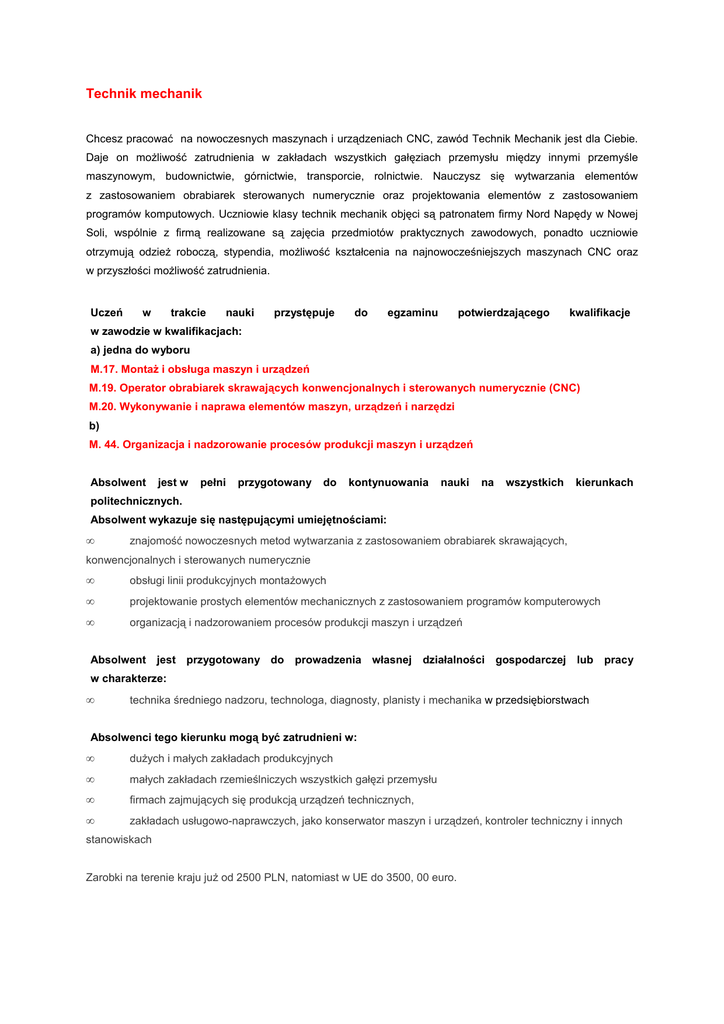 Technik mechanik Chcesz pracować na nowoczesnych maszynach i urządzeniach CNC, zawód Technik Mechanik jest dla Ciebie. Daje on moŜliwość zatrudnienia w zakładach wszystkich gałęziach przemysłu między innymi przemyśle maszynowym, budownictwie, górnictwie, transporcie, rolnictwie. Nauczysz się wytwarzania elementów z zastosowaniem obrabiarek sterowanych numerycznie oraz projektowania elementów z zastosowaniem programów komputowych. Uczniowie klasy technik mechanik objęci są patronatem firmy Nord Napędy w Nowej Soli, wspólnie z firmą realizowane są zajęcia przedmiotów praktycznych zawodowych, ponadto uczniowie otrzymują odzieŜ roboczą, stypendia, moŜliwość kształcenia na najnowocześniejszych maszynach CNC oraz w przyszłości moŜliwość zatrudnienia. Uczeń w trakcie nauki przystępuje do egzaminu potwierdzającego kwalifikacje w zawodzie w kwalifikacjach: a) jedna do wyboru M.17. MontaŜ i obsługa maszyn i urządzeń M.19. Operator obrabiarek skrawających konwencjonalnych i sterowanych numerycznie (CNC) M.20. Wykonywanie i naprawa elementów maszyn, urządzeń i narzędzi b) M. 44. Organizacja i nadzorowanie procesów produkcji maszyn i urządzeń Absolwent jest w pełni przygotowany do kontynuowania nauki na wszystkich kierunkach politechnicznych. Absolwent wykazuje się następującymi umiejętnościami: • znajomość nowoczesnych metod wytwarzania z zastosowaniem obrabiarek skrawających, konwencjonalnych i sterowanych numerycznie • obsługi linii produkcyjnych montaŜowych • projektowanie prostych elementów mechanicznych z zastosowaniem programów komputerowych • organizacją i nadzorowaniem procesów produkcji maszyn i urządzeń Absolwent jest przygotowany do prowadzenia własnej działalności gospodarczej lub pracy w charakterze: • technika średniego nadzoru, technologa, diagnosty, planisty i mechanika w przedsiębiorstwach Absolwenci tego kierunku mogą być zatrudnieni w: • duŜych i małych zakładach produkcyjnych • małych zakładach rzemieślniczych wszystkich gałęzi przemysłu • firmach zajmujących się produkcją urządzeń technicznych, • zakładach usługowo-naprawczych, jako konserwator maszyn i urządzeń, kontroler techniczny i innych stanowiskach Zarobki na terenie kraju juŜ od 2500 PLN, natomiast w UE do 3500, 00 euro.