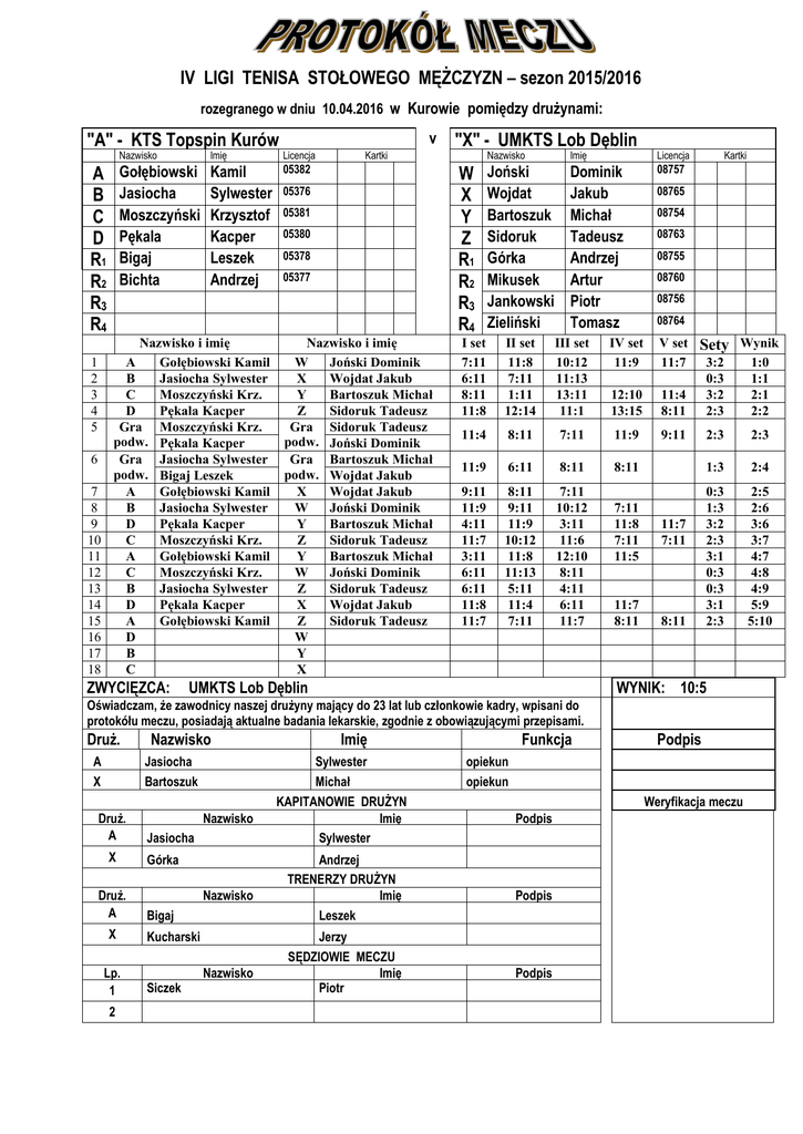IV LIGI TENISA STOŁOWEGO MĘŻCZYZN – sezon 2015/2016 rozegranego w dniu 10.04.2016 w Kurowie pomiędzy drużynami: "A" - KTS Topspin Kurów A B C D R1 R2 R3 R4 1 2 3 4 5 6 7 8 9 10 11 12 13 14 15 16 17 18 v Nazwisko Imię Licencja Gołębiowski Jasiocha Moszczyński Pękala Bigaj Bichta Kamil Sylwester Krzysztof Kacper Leszek Andrzej 05382 Nazwisko i imię A Gołębiowski Kamil B Jasiocha Sylwester C Moszczyński Krz. D Pękala Kacper Gra Moszczyński Krz. podw. Pękala Kacper Gra Jasiocha Sylwester podw. Bigaj Leszek A Gołębiowski Kamil B Jasiocha Sylwester D Pękala Kacper C Moszczyński Krz. A Gołębiowski Kamil C Moszczyński Krz. B Jasiocha Sylwester D Pękala Kacper A Gołębiowski Kamil D B C ZWYCIĘZCA: Kartki "X" - UMKTS Lob Dęblin Nazwisko W Joński X Wojdat Y Bartoszuk Z Sidoruk R1 Górka R2 Mikusek R3 Jankowski R4 Zieliński 05376 05381 05380 05378 05377 Nazwisko i imię W Joński Dominik X Wojdat Jakub Y Bartoszuk Michał Z Sidoruk Tadeusz Gra Sidoruk Tadeusz podw. Joński Dominik Gra Bartoszuk Michał podw. Wojdat Jakub X Wojdat Jakub W Joński Dominik Y Bartoszuk Michał Z Sidoruk Tadeusz Y Bartoszuk Michał W Joński Dominik Z Sidoruk Tadeusz X Wojdat Jakub Z Sidoruk Tadeusz W Y X Imię Licencja Dominik Jakub Michał Tadeusz Andrzej Artur Piotr Tomasz 08757 08765 08754 08763 08755 08760 08756 08764 I set 7:11 6:11 8:11 11:8 II set 11:8 7:11 1:11 12:14 III set 10:12 11:13 13:11 11:1 IV set 11:9 V set 11:7 12:10 13:15 11:4 8:11 7:11 11:9 11:9 6:11 8:11 8:11 9:11 11:9 4:11 11:7 3:11 6:11 6:11 11:8 11:7 8:11 9:11 11:9 10:12 11:8 11:13 5:11 11:4 7:11 7:11 10:12 3:11 11:6 12:10 8:11 4:11 6:11 11:7 UMKTS Lob Dęblin 7:11 11:8 7:11 11:5 11:7 8:11 Kartki Sety Wynik 11:4 8:11 3:2 0:3 3:2 2:3 1:0 1:1 2:1 2:2 9:11 2:3 2:3 1:3 2:4 0:3 1:3 3:2 2:3 3:1 0:3 0:3 3:1 2:3 2:5 2:6 3:6 3:7 4:7 4:8 4:9 5:9 5:10 11:7 7:11 8:11 WYNIK: 10:5 Oświadczam, że zawodnicy naszej drużyny mający do 23 lat lub członkowie kadry, wpisani do protokółu meczu, posiadają aktualne badania lekarskie, zgodnie z obowiązującymi przepisami. Druż. Nazwisko Imię Funkcja A Jasiocha Sylwester opiekun X Bartoszuk Michał opiekun Druż. A Nazwisko Jasiocha X Górka Druż. A Bigaj X Lp. 1 2 Nazwisko Andrzej TRENERZY DRUŻYN Imię Weryfikacja meczu Podpis Podpis Leszek Kucharski Siczek KAPITANOWIE DRUŻYN Imię Sylwester Nazwisko Jerzy SĘDZIOWIE MECZU Imię Piotr Podpis Podpis Uwaga ! GOSPODARZ MECZU zobowiązany jest do niezwłocznego podania wyniku meczu do prowadzącego rozgrywki: SMS 607 857 448 lub e-mail [email protected] i natychmiast przesłać protokół meczu na adres: e-mail [email protected]. Oryginał przechowywać w aktach klubu.