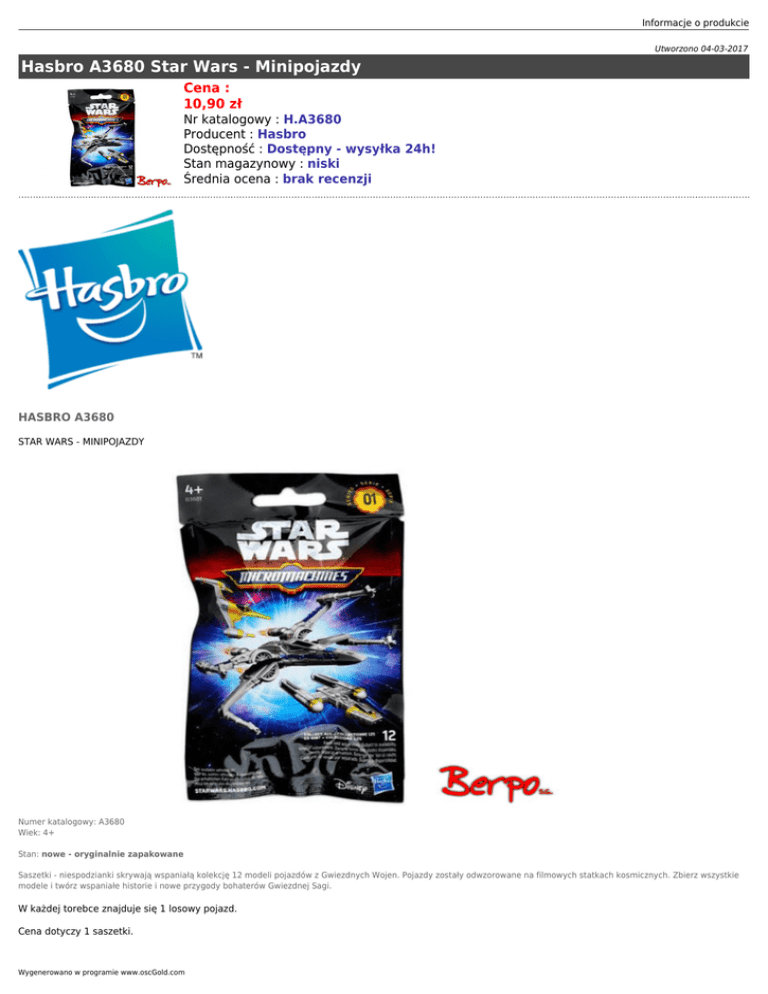 Informacje o produkcie Utworzono 04-03-2017 Hasbro A3680 Star Wars - Minipojazdy Cena : 10,90 zł Nr katalogowy : H.A3680 Producent : Hasbro Dostępność : Dostępny - wysyłka 24h! Stan magazynowy : niski Średnia ocena : brak recenzji HASBRO A3680 STAR WARS - MINIPOJAZDY Numer katalogowy: A3680 Wiek: 4+ Stan: nowe - oryginalnie zapakowane Saszetki - niespodzianki skrywają wspaniałą kolekcję 12 modeli pojazdów z Gwiezdnych Wojen. Pojazdy zostały odwzorowane na filmowych statkach kosmicznych. Zbierz wszystkie modele i twórz wspaniałe historie i nowe przygody bohaterów Gwiezdnej Sagi. W każdej torebce znajduje się 1 losowy pojazd. Cena dotyczy 1 saszetki. Wygenerowano w programie www.oscGold.com Różne wzory! Wysyłamy losowo. Dostępność w salonach: Ilość sztuk: Sklep - Złotniki: 1 Sklep - zlikwidowany: 0 Sklep - Szczepankowo: 0 Dostępne opcje Hasbro A3680 Star Wars - Minipojazdy » Wiek: 3 - 4 lat, 5 - 7 lat, 8 - 11 lat, 12 lat i więcej.