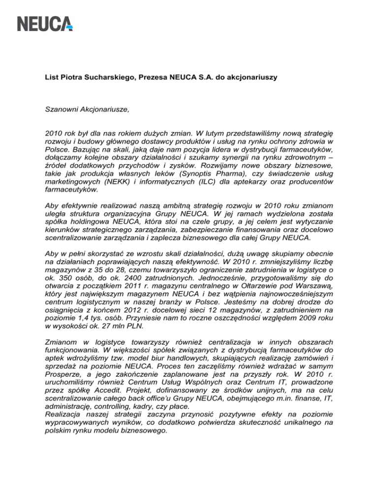 List Piotra Sucharskiego, Prezesa NEUCA S.A. do akcjonariuszy Szanowni Akcjonariusze, 2010 rok był dla nas rokiem dużych zmian. W lutym przedstawiliśmy nową strategię rozwoju i budowy głównego dostawcy produktów i usług na rynku ochrony zdrowia w Polsce. Bazując na skali, jaką daje nam pozycja lidera w dystrybucji farmaceutyków, dołączamy kolejne obszary działalności i szukamy synergii na rynku zdrowotnym – źródeł dodatkowych przychodów i zysków. Rozwijamy nowe obszary biznesowe, takie jak produkcja własnych leków (Synoptis Pharma), czy świadczenie usług marketingowych (NEKK) i informatycznych (ILC) dla aptekarzy oraz producentów farmaceutyków. Aby efektywnie realizować naszą ambitną strategię rozwoju w 2010 roku zmianom uległa struktura organizacyjna Grupy NEUCA. W jej ramach wydzielona została spółka holdingowa NEUCA, która stoi na czele grupy, a jej celem jest wytyczanie kierunków strategicznego zarządzania, zabezpieczanie finansowania oraz docelowo scentralizowanie zarządzania i zaplecza biznesowego dla całej Grupy NEUCA. Aby w pełni skorzystać ze wzrostu skali działalności, dużą uwagę skupiamy obecnie na działaniach poprawiających naszą efektywność. W 2010 r. zmniejszyliśmy liczbę magazynów z 35 do 28, czemu towarzyszyło ograniczenie zatrudnienia w logistyce o ok. 350 osób, do ok. 2400 zatrudnionych. Jednocześnie, przygotowaliśmy się do otwarcia z początkiem 2011 r. magazynu centralnego w Ołtarzewie pod Warszawą, który jest największym magazynem NEUCA i bez wątpienia najnowocześniejszym centrum logistycznym w naszej branży w Polsce. Jesteśmy na dobrej drodze do osiągnięcia z końcem 2012 r. docelowej sieci 12 magazynów, z zatrudnieniem na poziomie 1,4 tys. osób. Przyniesie nam to roczne oszczędności względem 2009 roku w wysokości ok. 27 mln PLN. Zmianom w logistyce towarzyszy również centralizacja w innych obszarach funkcjonowania. W większości spółek związanych z dystrybucją farmaceutyków do aptek wdrożyliśmy tzw. model biur handlowych, skupiających realizację zamówień i sprzedaż na poziomie NEUCA. Proces ten zaczęliśmy również wdrażać w samym Prosperze, a jego zakończenie zaplanowane jest na przyszły rok. W 2010 r. uruchomiliśmy również Centrum Usług Wspólnych oraz Centrum IT, prowadzone przez spółkę Accedit. Projekt, dofinansowany ze środków unijnych, ma na celu scentralizowanie całego back office’u Grupy NEUCA, obejmującego m.in. finanse, IT, administrację, controlling, kadry, czy płace. Realizacja naszej strategii zaczyna przynosić pozytywne efekty na poziomie wypracowywanych wyników, co dodatkowo potwierdza skuteczność unikalnego na polskim rynku modelu biznesowego. Co najważniejsze, wszystkie te zmiany byliśmy w stanie przeprowadzić na tyle sprawnie, żeby nie były odczuwalne dla naszych klientów - niezależnych aptek. Potwierdzeniem skuteczności procesu jest osiągnięcie rekordowego w historii Grupy NEUCA udziału rynkowego na poziomie 31,8% w IV kw. 2010 r. W 2010 r. NEUCA osiągnęła 4,6 mld PLN przychodów (wzrost o 9%). Zysk operacyjny zwiększył się o 51% do 38,8 mln PLN, a zysk netto wyniósł 18,2 mln PLN wobec niemal 13 mln rok wcześniej. Przed nami 2011 r., w którym zgodnie ze strategią planujemy utrzymać pozycję lidera na rynku dystrybucji i rozwijać działalność w nowych obszarach biznesowych. Jako partner aptek niezależnych świadczymy dla naszych klientów coraz bardziej kompleksowe usługi i dajemy aptekom niezależnym możliwość korzystania z oferty rynkowej i narzędzi marketingowych do tej pory zarezerwowanych jedynie dla aptek sieciowych. W 2011 roku kluczowa dla nas będzie niewątpliwie kontynuacja działań reorganizacyjnych i dalsza centralizacja logistyki. Wszystko to powinno przełożyć się pozytywnie na osiągane wyniki finansowe i dalszy dynamiczny rozwój na rynku ochrony zdrowia w Polsce. Piotr Sucharski Prezes NEUCA S.A.