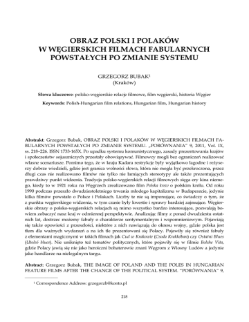 PORÓWNANIA 9, 2011 OBRAZ POLSKI I POLAKÓW W WĘGIERSKICH FILMACH FABULARNYCH POWSTAŁYCH PO ZMIANIE SYSTEMU GRZEGORZ BUBAK1 (Kraków) Słowa kluczowe: polsko-węgierskie relacje filmowe, film węgierski, historia Węgier Keywords: Polish-Hungarian film relations, Hungarian film, Hungarian history Abstrakt: Grzegorz Bubak, OBRAZ POLSKI I POLAKÓW W WĘGIERSKICH FILMACH FABULARNYCH POWSTAŁYCH PO ZMIANIE SYSTEMU. „PORÓWNANIA” 9, 2011, Vol. IX, ss. 218–226. ISSN 1733-165X. Po upadku systemu komunistycznego, zasady prezentowania krajów i społeczeństw sojuszniczych przestały obowiązywać. Filmowcy mogli bez ograniczeń realizować własne scenariusze. Pomimo tego, że w kraju Kadara restrykcje były wyjątkowo łagodne i reżyserzy dobrze wiedzieli, gdzie jest granica wolności słowa, która nie mogła być przekroczona, przez długi czas nie realizowano filmów nie tylko nie łamiących stereotypy ale także prezentujących prawdziwy punkt widzenia. Tradycja polsko-węgierskich relacji filmowych sięga ery kina niemego, kiedy to w 1921 roku na Węgrzech zrealizowano film Polska krew o polskim królu. Od roku 1990 podczas przeszło dwudziestoletniego trwania młodego kapitalizmu w Budapeszcie, jedynie kilka filmów powstało o Polsce i Polakach. Liczby te nie są imponujące, co świadczy o tym, że z punktu węgierskiego widzenia, w tym czasie były kwestie i sprawy bardziej zajmujące. Węgierskie obrazy o polsko-węgierskich relacjach są mimo wszystko bardzo interesujące, pozwalają bowiem zobaczyć nasz kraj w odmiennej perspektywie. Analizując filmy z ponad dwudziestu ostatnich lat, dostrzec możemy fabuły o charakterze sentymentalnym i wspomnieniowym. Pojawiają się także opowieści z przeszłości, niektóre z nich nawiązują do okresu wojny, gdzie polska jest tłem dla ważnych wydarzeń a na ich tle prezentowani się Polacy. Pojawiły się również fabuły z elementami magicznymi w takich filmach jak Cud w Krakowie (Csoda Krakkóban) czy Ostatni Blues (Utolsó blues). Nie uniknięto też tematów politycznych, które pojawiły się w filmie Bolshe Vita, gdzie Polacy jawią się nie jako heroiczni bohaterowie znani Węgrom z Wiosny Ludów a jedynie jako handlarze na nielegalnym targu. Abstract: Grzegorz Bubak, THE IMAGE OF POLAND AND THE POLES IN HUNGARIAN FEATURE FILMS AFTER THE CHANGE OF THE POLITICAL SYSTEM. “PORÓWNANIA” 9, ________________ 1 Correspondence Address: [email protected] 218 Grzegorz Bubak, Obraz Polski i Polaków w węgierskich filmach fabularnych 2011, Vol. IX, pp. 218–226. ISSN 1733-165X. After the fall of communism, the political rules of presenting methods of the allied countries and nations were no longer in force. The filmmakers could make their own screenplays without any constraints. Although in Kadar’s country restrictions where exceptionally soft and directors knew well where the limit of the freedom of expression which could not be crossed is, for a long time films that break stereotypes but also present the true perspective were not made. The tradition of Polish-Hungarian film relations began in the silent picture’s era, when in 1921 Polish Blood, a film about a Polish king was made in Hungary. Since 1990, during more than twenty years of young capitalism in Budapest only few pictures where made about Poland and the Poles. The numbers are not impressive, but it means that in Hungary in that period of more importance were questions from the Hungarian point of view. In fact, Hungarian pictures about Polish-Hungarian relations are not less interesting, on the contrary, they let us see the perspective used to observe our country. While analysing films from more than the recent twenty years we can also see presentations of sentimental and memoir storylines. The stories from the past are coming, some of them are even wartime stories when Poland was background for the important events or Polish citizens can be seen. There are also some unique presentations with magic elements like Miracle in Cracow, Last Blues. It was impossible to avoid politics, which can be seen again in Hungarian movies, in Bolshe vita Polish people are not heroic soldiers from the revolution of Spring of Nations but only the hucksters from the illegal market. Relacje polsko-węgierskie od dziesięcioleci uznawane są za wzorcowe, podobnie jak kontakty kulturalne między naszymi narodami. Genezę tych stosunków, niemalże bezkonfliktowych, niektórzy tłumaczą trudnością komunikacji wynikającą z odrębności językowej: skoro nie można z kimś się porozumieć to trudno tym bardziej się z nim pokłócić. Byłoby to jednak zbyt daleko idące i krzywdzące uproszczenie, przyczyn przysłowiowej przyjaźni należy szukać zupełnie w innych rejonach, chociażby w cechach charakterologicznych obu nacji. Wzajemnie dobra opinia o przedstawicielach naszych narodów znajdowała odzwierciedlenie najpierw np. w utworach literackich, później także w filmach2. Na przykładzie kilku produkcji węgierskich zrealizowanych po zmianie systemu chciałbym zanalizować wizerunek Polaków i naszego kraju. Wcześniej, jeśli nawet udałoby się odnaleźć polskie tropy3, niestety trudno o interesujące spojrzenie. Przez lata dyktatu ZSRR, o sojuszniczych narodach można było mówić wyłącznie przez pryzmat politycznych zależności. Myliłby się jednak ten, kto podejrzewa, iż po epoce państwa Kádára węgierska kinematografia nadrobi stracony czas i nad Dunajem powstanie wiele filmów o relacjach węgiersko-polskich. Twórców tak naprawdę zainteresują inne tematy, problemy dnia codziennego wywołane bły________________ 2 Pierwsze filmowe polonica sięgają już roku 1921, kiedy to zrealizowano film Polska krew (Lengyelvér) o polskim królu. 3 Np. Poeta i rycerz (Szép maglar) komedia z 1970 roku, w reż. Tamása Banovicha. 219 PORÓWNANIA 9, 2011 skawicznie przebiegającymi zmianami politycznymi i społecznymi. Szczęśliwie jednak dla naszych rozważań mo
