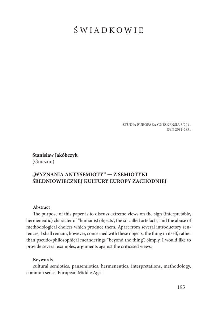 STANISŁAW JAKÓBCZYK, „WYZNANIA ANTYSEMIOTY”… ŚWIADKOWIE STUDIA EUROPAEA GNESNENSIA 3/2011 ISSN 2082-5951 Stanisław Jakóbczyk (Gniezno) „WYZNANIA ANTYSEMIOTY” — Z SEMIOTYKI ŚREDNIOWIECZNEJ KULTURY EUROPY ZACHODNIEJ Abstract The purpose of this paper is to discuss extreme views on the sign (interpretable, hermeneutic) character of “humanist objects”, the so called artefacts, and the abuse of methodological choices which produce them. Apart from several introductory sentences, I shall remain, however, concerned with these objects, the thing in itself, rather than pseudo-philosophical meanderings “beyond the thing”. Simply, I would like to provide several examples, arguments against the criticised views. Keywords cultural semiotics, pansemiotics, hermeneutics, interpretations, methodology, common sense, European Middle Ages 195 STUDIA EUROPAEA GNESNENSIA 3/2011 · ŚWIADKOWIE Celem artykułu jest poddanie dyskusji skrajnych poglądów o znakowym (interpretowalnym, hermeneutycznym) charakterze „przedmiotów humanistycznych”, tzw. artefaktów, i nadużywania prowadzących do nich wyborów metodologicznych. Pozostawać jednak będę, oprócz może paru zdań wstępu, na poziomie tych przedmiotów, rzeczy samej, a nie pseudo-filozoficznych dywagacji „ponad rzeczą”. Po prostu chciałbym podać parę przykładów, argumentów przeciw krytykowanym poglądom. Tytuł „Wyznania antysemioty” zaczerpnąłem świadomie i dobrowolnie od nieodżałowanego Stanisława Lema, który wymyślił go kiedyś dla swego przekonująco krytycznego (wobec strukturalizmu semiotycznego) tekstu z „Tekstów”1. Choć niemal 40 lat minęło od tamtej publikacji, jest ona — jak to zwykle bywa z tekstami pisarzy science fiction — nadal, czy może wręcz dopiero, aktualna teraz, kiedy w nowych już metodologiach rozważa się rozmaite paradygmaty, zaistnienia i dyskursy, podpierane okrzepłą już (choćby przez odejście jej twórcy) nibyontologią hermeneutyki, i „powracającą falą” neo-freudyzmu, upowszechnionego i spowszedniałego przez amerykanizację Świata, zwaną globalizacją kulturową. Lem zarzucał semiotyce strukturalnej (głoszącej znakowy charakter czegokolwiek, o ile to „cokolwiek” da się ująć w jakimś porządku, czyli w jakiejś strukturze — z naciskiem na znakowość), albo strukturalizmowi semiotycznemu (głoszącemu strukturalny, uporządkowany charakter czegokolwiek, o ile to „cokolwiek” poddaje się interpretacji, czyli da się w nim dostrzec jakieś znaczenie — z naciskiem na strukturalność) nie tylko i nie tyle tzw. holizm metodologiczny, co wręcz błędne koło w rozumowaniu, petitio principi. Według Lema praktyka metodologii strukturalnej polegała bowiem na zakładaniu, że badany obiekt na pewno ma charakter struktury znaczącej, którą trzeba tylko odkryć, to znaczy opisać, a jeśli taki opis się uda (według Lema zawsze się udawał!) będzie to dowodem na prawdziwość założenia. Z semiotyki i strukturalizmu, rozpowszechnianych zwłaszcza w latach 60. XX wieku, pozostało dziś przekonanie o potencjale znakowym Świata (a powinno się mówić raczej o tendencji do semiotycznego jego postrzegania i re-kreowania przez Człowieka) oraz, co się z tym wiąże, częste zamazywanie różnic między znakowością ontologiczną a metodologiczną, czyli epistemologiczną. Widać to nawet w językoznawstwie, zarówno tradycyjnym (taksonomicznym, jak mawiał Chomsky), kiedy uważa się, że język jest systemem — zamiast tylko, że lepiej się go opisuje systematyzując — jak i w lingwistyce matematycznej (prawdziwej, jak 1 Teksty 1, 1972, s. 62–79. 196 STANISŁAW JAKÓBCZYK, „WYZNANIA ANTYSEMIOTY”… mawiają jej wyznawcy), kiedy nie tylko przedmiotem i celem badania, jak w całej matematyce, stają się wytwory umysłu badacza, ale też wydaje się to tu zarazem normalne i konieczne (i jest powodem do dumy); zamiast dążyć do wyjaśnienia tych przedmiotów, które już są dane, produkuje się nowe przedmioty. Do zamazania tradycyjnej dychotomii bytu i jego poznania przyczyniał się, będąc zarazem tego zamazania przykładem i wyrazem, główny pomysł HansaGeorga Gadamera, by wobec logicznych trudności przy wyjaśnianiu humanistycznych „przedmiotów znaczących” postawić kropkę nad i: zadekretować (stało się to, faktycznie, na poziomie meta-metodologicznym, ale to się na ogół przemilcza) że poznanie takiego bytu samo jest bytem — tymże poznawanym właśnie (to ostatnie nie jest zresztą takie pewne). Podobny przyczynek do opuszczenia przez humanistykę poziomu faktów i ich ewentualnego wyjaśniania wniosło odgrzebanie pomysłów dziewiętnastowiecznego epigona romantyzmu, Wilhelma Diltheya, zwane dumnie „przełomem antypozytywistycznym”, a polegające głównie na zastąpieniu wyjaśniania (skoro tak jest niepewne i trudne) tzw. rozumieniem (bo łatwo jest mieć pewność, że ktoś coś rozumie tak, jak mówi, że rozumie); to też jest odmiana pansemiotyzmu, rozumie się bowiem tylko coś, o czym zakłada się, że posiada jakieś znaczenie. Stoję tu na stanowisku sceptycznym wobec zarówno pomysłu Gadamera, jak i semiotyki ontologicznej, a także holistycznej pan-semiotyki i hermeneutyki epigonów epigona Diltheya. Uważam, że ciekawsze naukowo — to znaczy zwiększające quantum wiedzy, może też nie zawsze prawdziwej, ale intersubiektywnie sprawdzalnej co do tej prawdziwości — są obiektywne przedmioty, a nie subiektywne „modele” i interpretacje własne badacza; być może prawdziwe, ale niesprawdzalne. W szczególności, hipotezy o znakowym, semiotycznym charakterze wielu przedmiotów i zjawisk, a zwłaszcza o wielopoziomowej jakby znakowości, nie zawsze wytrzymują próby ich sprawdzania (weryfikacji, a bardziej jeszcze — falsyfikacji); nie wytrzymują zasadniczo, logicznie, przybierając postać hipotez ad hoc; często nie wytrzymują najpierw jednak dlatego, że ni