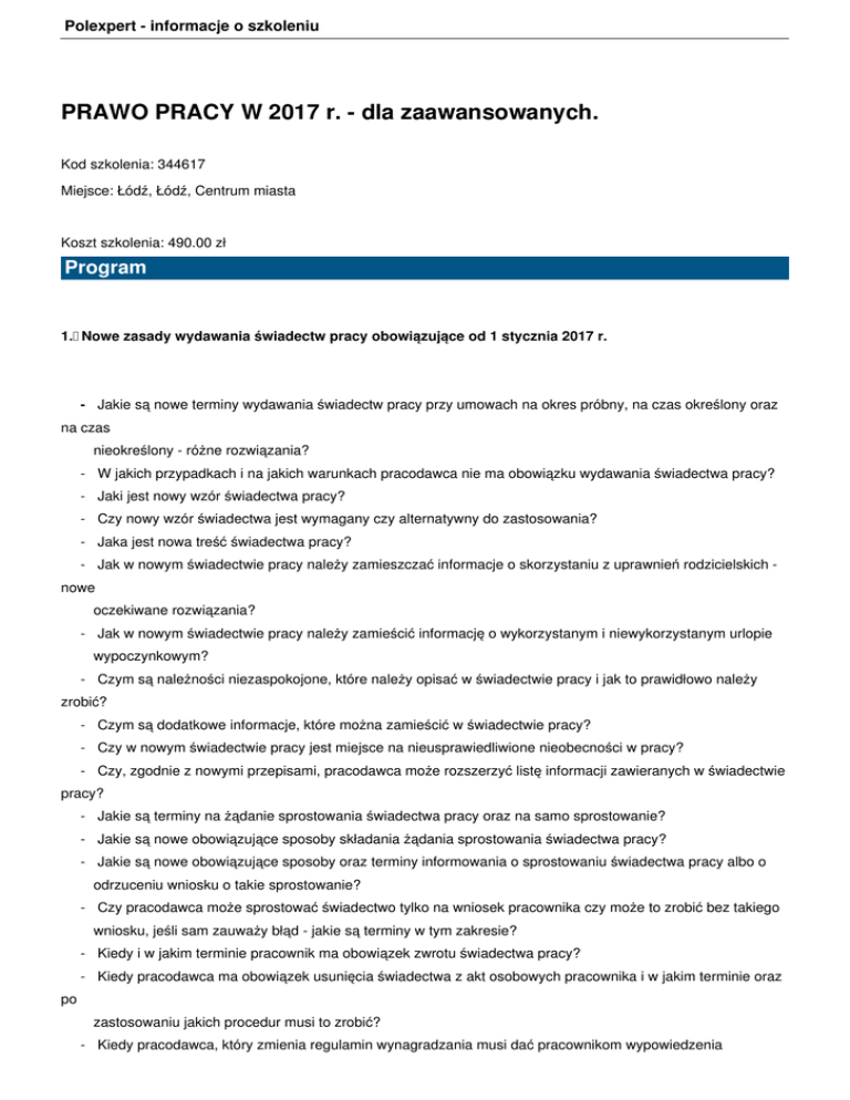 Polexpert - informacje o szkoleniu PRAWO PRACY W 2017 r. - dla zaawansowanych. Kod szkolenia: 344617 Miejsce: Łódź, Łódź, Centrum miasta Koszt szkolenia: 490.00 zł Program 1. Nowe zasady wydawania świadectw pracy obowiązujące od 1 stycznia 2017 r. - Jakie są nowe terminy wydawania świadectw pracy przy umowach na okres próbny, na czas określony oraz na czas nieokreślony - różne rozwiązania? - W jakich przypadkach i na jakich warunkach pracodawca nie ma obowiązku wydawania świadectwa pracy? - Jaki jest nowy wzór świadectwa pracy? - Czy nowy wzór świadectwa jest wymagany czy alternatywny do zastosowania? - Jaka jest nowa treść świadectwa pracy? - Jak w nowym świadectwie pracy należy zamieszczać informacje o skorzystaniu z uprawnień rodzicielskich nowe oczekiwane rozwiązania? - Jak w nowym świadectwie pracy należy zamieścić informację o wykorzystanym i niewykorzystanym urlopie wypoczynkowym? - Czym są należności niezaspokojone, które należy opisać w świadectwie pracy i jak to prawidłowo należy zrobić? - Czym są dodatkowe informacje, które można zamieścić w świadectwie pracy? - Czy w nowym świadectwie pracy jest miejsce na nieusprawiedliwione nieobecności w pracy? - Czy, zgodnie z nowymi przepisami, pracodawca może rozszerzyć listę informacji zawieranych w świadectwie pracy? - Jakie są terminy na żądanie sprostowania świadectwa pracy oraz na samo sprostowanie? - Jakie są nowe obowiązujące sposoby składania żądania sprostowania świadectwa pracy? - Jakie są nowe obowiązujące sposoby oraz terminy informowania o sprostowaniu świadectwa pracy albo o odrzuceniu wniosku o takie sprostowanie? - Czy pracodawca może sprostować świadectwo tylko na wniosek pracownika czy może to zrobić bez takiego wniosku, jeśli sam zauważy błąd - jakie są terminy w tym zakresie? - Kiedy i w jakim terminie pracownik ma obowiązek zwrotu świadectwa pracy? - Kiedy pracodawca ma obowiązek usunięcia świadectwa z akt osobowych pracownika i w jakim terminie oraz po zastosowaniu jakich procedur musi to zrobić? - Kiedy pracodawca, który zmienia regulamin wynagradzania musi dać pracownikom wypowiedzenia Polexpert - informacje o szkoleniu zmieniające i czy takie wypowiedzenia można zastąpić porozumieniami? 2. Nowe zasady tworzenia regulaminów pracy obowiązujące od 1 stycznia 2017 r. - Którzy pracodawcy maja obowiązek tworzenia regulaminów pracy zgodnie z nowymi regulacjami? - Którzy pracodawcy nie mają obowiązku tworzenia regulaminów pracy, a którzy mogą tego nie robić po spełnieniu dodatkowych warunków? - Czy pracodawcy którzy mieli obowiązek tworzenia regulaminów pracy według dotychczasowych przepisów, a nie mają takiego obowiązku zgodnie z nowymi regulacjami, mogą z tych regulaminów zrezygnować? - Jakie kwestie, zgodnie z nowymi przepisami, muszą być uregulowane w regulaminie wynagradzania, a jakie pracodawca może, ale nie musi zawierać w jego treści? - Jakie są najczęściej występujące błędy w treści regulaminów pracy? - Jak zmienia się treść informacji o warunkach zatrudnienia, którą trzeba wręczyć pracownikom, w związku z zawężeniem kręgu pracodawców zobowiązanych do tworzenia regulaminu wynagradzania? - Gdzie powinny być uregulowane kwestie, które dotychczas pracodawca miał obowiązek zamieszczać w regulaminie pracy po zniesieniu obowiązku tworzenia takiego regulaminu w stosunku do znacznej większości pracodawców? - Jakie kwestie warto zapisać w regulaminie pracy, a jakich lepiej nie robić, zgodnie nowymi przepisami? 3. Nowa stawka wynagrodzenia minimalnego od 1 stycznia 2017 r. - Jaka jest wysokość minimalnego wynagrodzenia w 2017r. - Jaka jest wysokość i nowe zasady ustalania wynagrodzenia minimalnego w pierwszym roku pracy? - Kiedy obowiązuje i do kogo ma zastosowanie stawka godzinowa wynagrodzenia minimalnego? - Czy pracodawca może ukształtować wynagrodzenie pracownika na poziomie niższym niż minimalne - kiedy jest to dopuszczalne i jakie są tego konsekwencje prawne i faktyczne? - Jaki wpływ na wynagrodzenia pochodne ma wynagrodzenie minimalne? - Jakich nowych składników nie wlicza się do stawki minimalnego wynagrodzenia? 4. Nowe przepisy dotyczące pracodawców zobowiązanych do tworzenia ZFŚS Polexpert - informacje o szkoleniu - Którzy pracodawcy maja obowiązek tworzenia ZFŚS pracy zgodnie z nowymi regulacjami? - Którzy pracodawcy nie mają obowiązku tworzenia ZFŚS, a którzy mogą tego nie robić po zmianie przepisów? - Czy pracodawcy którzy mieli obowiązek tworzenia ZFŚS według dotychczasowych przepisów, a nie mają takiego obowiązku zgodnie z nowymi regulacjami, mogą z tworzenia funduszu zrezygnować? 5. Nawiązanie umowy o pracę z zastosowaniem nowych przepisów - Jakie rodzaje umów o pracę można wykorzystania w 2017 r. - Jakie są nowe zasady zawierania umów na okres próbny? - Ile i jakiej długości umowy na okres próbny mogą być zawierane z jednym pracownikiem po zmianie przepisów? - Jaki jest okres wypowiedzenia umowy na okres próbny? - Ile umów terminowych można podpisać z jednym pracownikiem? - Jakie jest ograniczenie co do długości trwania jednej lub kilku umów na czas określony? - Czy w ograniczeniu długości lub ilości umów na czas określony mają znaczenie przerwy pomiędzy tymi umowami? - W jakich okolicznościach pracodawca nie jest ograniczony ilością ani długością umowy na czas określony? - Jakie mogą być okoliczności uzasadniające podpisanie długiej umowy na czas określony? - Z jakimi dodatkowymi obowiązkami wiąże się podpisanie długiej umowy na czas określony? - Jakie są konsekwencje zawarcia umowy na czas dłuższy niż dopuszczony nowymi przepisami lub w większej liczbie niż dopuszczalna? - Jaki jest okres wypowiedzenia umowy na czas określony zgodnie z nowymi regulacjami? - Czy pracodawca, w związku z nowymi przepisami, ma obowiązek uzasadnić wypowiedzenie umowy na c