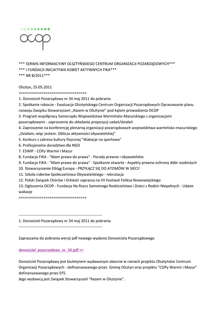 *** SERWIS INFORMACYJNY OLSZTYOSKIEGO CENTRUM ORGANIZACJI POZARZĄDOWYCH*** *** I FUNDACJI INICJATYWA KOBIET AKTYWNYCH FIKA*** *** NR 8/2011*** Olsztyn, 25.05.2011 ================================= 1. Donosiciel Pozarządowy nr 34 maj 2011 do pobrania 2. Spotkanie robocze - Ewaluacja Olsztyoskiego Centrum Organizacji Pozarządowych Opracowanie planu rozwoju Związku Stowarzyszeo „Razem w Olsztynie” pod kątem prowadzenia OCOP 3. Program współpracy Samorządu Województwa Warmiosko-Mazurskiego z organizacjami pozarządowymi - zaproszenie do składania propozycji zadao/działao 4. Zaproszenie na konferencję plenarną organizacji pozarządowych województwa warmiosko-mazurskiego „Działam, więc jestem. Oblicza aktywności obywatelskiej” 5. Konkurs z zakresu kultury fizycznej "Wakacje na sportowo" 6. Profesjonalne doradztwo dla NGO 7. ESWIP - COPy Warmii i Mazur 8. Fundacja FIKA - "Mam prawo do prawa" - Porady prawne i obywatelskie 9. Fundacja FIKA - "Mam prawo do prawa" - Spotkanie otwarte - Aspekty prawne ochrony dóbr osobistych 10. Stowarzyszenie Elbląg Europa - PRZYŁĄCZ SIĘ DO ATOMÓW W SIECI! 11. Szkoła Liderów Społeczeostwa Obywatelskiego - rekrutacja 12. Polski Związek Chórów i Orkiestr zaprasza na VII Festiwal Feliksa Nowowiejskiego 13. Ogłoszenia OCOP - Fundacja Na Rzecz Samotnego Rodzicielstwa i Dzieci z Rodzin Niepełnych - Udane wakacje ================================= -----------------------------------------------------------------1. Donosiciel Pozarządowy nr 34 maj 2011 do pobrania -----------------------------------------------------------------Zapraszamy do pobrania wersji pdf nowego wydania Donosiciela Pozarządowego donosiciel_pozarzadowy_nr_34.pdf >> Donosiciel Pozarządowy jest biuletynem wydawanym obecnie w ramach projektu Olsztyoskie Centrum Organizacji Pozarządowych - dofinansowanego przez Gminę Olsztyn oraz projektu "COPy Warmii i Mazur" dofinansowanego przez EFS. Jego wydawcą jest Związek Stowarzyszeo "Razem w Olsztynie". Archiwum DP >> --------------------------------------------------------------------2. Spotkanie robocze - Ewaluacja Olsztyoskiego Centrum Organizacji Pozarządowych Opracowanie planu rozwoju Związku Stowarzyszeo „Razem w Olsztynie” pod kątem prowadzenia OCOP --------------------------------------------------------------------Związek Stowarzyszeo „Razem w Olsztynie” organizuje w dniach 8-9 czerwca 2011 spotkanie robocze w Lesznie. Tematem spotkania będą ewaluacja Olsztyoskiego Centrum Organizacji Pozarządowych oraz opracowanie planu rozwoju Związku Stowarzyszeo „Razem w Olsztynie” pod kątem prowadzenia OCOP. Spotkanie poprowadzi Alicja Zajączkowska. Alicja Zajączkowska–Certyfikowana trenerka i członkini Stowarzyszenia Trenerów Organizacji Pozarządowych STOP. Specjalizuje się w tematyce: zarządzanie projektami na etapie planowania i wdrażania, ewaluacja projektów, budowanie strategii rozwoju, itp. Ewaluator: koordynacja i prowadzenie badao ewaluacji projektów i programów realizowanych z funduszy unijnych. Praktyczne doświadczenie w zakresie procedur monitoringu i ewaluacji projektów. Założycielka Pomorskiego Towarzystwa Ewaluacyjnego. Osoby zainteresowane udziałem w pracach prosimy o kontakt: tel. 503 680 500 [email protected] ul. Tarasa Szewczenki 1, 10-274 Olsztyn Spotkanie jest organizowane w ramach projektu „COPy Warmii i Mazur. Sied Centrów Organizacji Pozarządowych Województwa Warmiosko-Mazurskiego” przez Związek Stowarzyszeo „Razem w Olsztynie”. --------------------------------------------------------------------3. Program współpracy Samorządu Województwa Warmiosko-Mazurskiego z organizacjami pozarządowymi - zaproszenie do składania propozycji zadao/działao --------------------------------------------------------------------W związku z przystąpieniem Samorządu Województwa Warmiosko-Mazurskiego do opracowania Programu współpracy Samorządu Województwa Warmiosko-Mazurskiego z organizacjami pozarządowymi oraz podmiotami wymienionymi w art. 3 ust. 3 ustawy o działalności pożytku publicznego i o wolontariacie na rok 2012, organizacje pozarządowe oraz podmioty wymienione w art. 3 ust. 3 ustawy o działalności pożytku publicznego i o wolontariacie zostały zaproszone do składania propozycji zadao/działao o znaczeniu regionalnym do projektu programu, które w roku 2012 mogłyby zostad zrealizowane we współpracy Samorządu Województwa z organizacjami pozarządowymi. Zobacz więcej >> --------------------------------------------------------------------4. Zaproszenie na konferencję plenarną organizacji pozarządowych województwa warmiosko-mazurskiego „Działam, więc jestem. Oblicza aktywności obywatelskiej” --------------------------------------------------------------------Rada Organizacji Pozarządowych Województwa Warmiosko-Mazurskiego zaprasza na konferencję plenarną organizacji pozarządowych „Działam, więc jestem. Oblicza aktywności obywatelskiej”, która odbędzie się w dniu 10 czerwca 2011 roku w Olsztynie, Hotel Warmioski, ul. Kołobrzeska 1 Zobacz więcej >> --------------------------------------------------------------------5. Konkurs z zakresu kultury fizycznej "Wakacje na sportowo" --------------------------------------------------------------------Prezydent Miasta Olsztyn ogłasza otwarty konkurs ofert na realizację zadania publicznego w zakresie kultury fizycznej pn. "Wakacje na sportowo". Termin składania ofert upływa z dniem 3 czerwca 2011 r. (decyduje data stempla pocztowego). Oferty złożone na niewłaściwych drukach, niekompletne lub złożone po terminie nie będą rozpatrywane. Pobierz treśd ogłoszenia >> Źródło: ngo.olsztyn.eu --------------------------------------------------------------------6. Profesjonalne doradztwo dla NGO --------------------------------------------------------------------Zapraszamy do korzystania z profesjonalnego doradztwa dla organizacji pozarządowych: Kontakt: [email pro