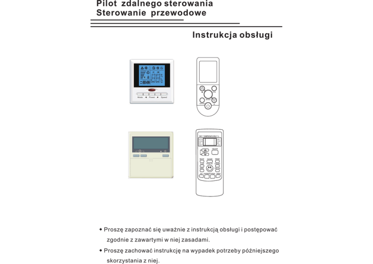 Pilot zdalnego sterowania Sterowanie przewodowe Instru k c ja obsługi FAN Mode Power Speed MODE SWING ◆ Proszę zapoznać się uważnie z instrukcją obsługi i postępować zgodnie z zawartymi w niej zasadami. ◆ P roszę zachować instrukcję na wypadek potrzeby późniejszego skorzystania z niej . 3.Programator czasowy Timing on - ustawienia czasu uruchomienia klimatyzatora : W trybie wyłączonego Pilot ON OFF”i symbol“ programatora należy nacisnąć raz przycisk“ OFF” zacznie migać na wyświetlaczu. Równocześnie zacznie migać pole programatora wskazujące godzinę [Hour] . Pilot Ⅰ ★Wyświetlacz i przyciski Tryb pracy Osuszanie Auto Chłodzenie Ogrzewanie Nawilżanie Wskaźnik emisji sygnału Prędkość pracy wentylatora Funkcja emisji anionów Silny nawiew Delikatny nawiew Nawiew z prawej/lewej strony Funkcja Timera Wyświetlacz Timera/ zagara Wybieranie trybu pracy MODE klawisz“ ON OFF " ( lub przez 5 sekund Wskaźnik temperatury Funkcja Sleep Nawiew w górę/ w dół Regulacja temperatury SWING ON nacisnąć OFF ". ”) . Symbol“ nie naciskać klawiszy“TIME / ”ani“ OFF”na wyświetlaczu zacznie świecić normalnie. Programator czasowy został ustawiony i zegar wskazuje FAN Regulacja kierunku nawiewu / Aby zatwierdzić ustawienia należy ponownie Regulacja prędkości nawiewu Regulacja temperatury lub odejmując po minucie za pomocą klawisza“TIME Wskaźnik wilgotności Funkcja Feeling on am off pm Za pomocą przycisków“TIME / ”w prowadzamy pożądaną godzinę dodając lub odejmując po jednej. ON OFF Zatwierdzamy za pomocą przycisku i na wyświetlaczu zaczyna migać pole wskazujące minuty. Przechodzimy do wprowadzenia ustawień minutowych dodając godzinę bieżącą. (P S : Dłuższe przyciskane klawisza“TIME / ”powoduje szybszą 4.Timing off: ustawienia czasu wyłączenia klimatyzatora wprowadzamy analogicznie. zmianę czasu.) ★Instal acja la sterownika przewodowego Insta lacja sterownika przewodowego 1. Odłącz panel bazy od sterownika przewodowego. 2. Za pomocą dwóch śrub przymocuj panel do ściany tak jak pokazano na rysunku . 3. Przed podłączeniem sterownika przewodowego do bazy upewnij się, że kabel podłączający sterownik jest łatwo dostępny. 4. Podłącz kabel sterownika przewodowego do jednostki wewnętrznej za pomocą kabla dołączonego w zestawie. Włączanie i wyłączanie klimatyzatora Pokrywa podzespołu Baza Sterownik przewodowy I Ⅰ Otwór instalacyjny Zdejmij Uwaga! Powyższy schemat może różnić się od rzeczywistego wyglądu pilota dostarczonego z zakupionym klimatyzatorem. Klimatyzator może również nie posiadać wszystkich funkcji przedstawionych na rysunku. ①" Mode Power Speed Śruba z łbem o nacięciu krzyżowy " Klawisz włączania/wyłączania Baza Pokrywa podzespołu Przyciśnięcie klawisza powoduje uruchomienie klimatyzatora; ponowne przyciśnięcie wyłącza urządzenie. ② Klawisz "MODE" Umożliwia wybór trybu pracy. Każde naciśnięcie klawisza powoduje zmianę trybu pracy klimatyzatora w następującej kolejności: Sterownik przewodowy Ⅱ Zdejmij Śruba z łbem o nacięciu krzyżowy 1 10 Otwór instalacyjny Uwaga : Model „ cooling-only ” - tylko chłodzenie nie ma funkcji ogrzewania . Sterowanie przewodowe ③ Klawisz "FAN" Wybór prędkości pracy wentylatora "Low", "Med", "High", "Auto". Sterowanie przewodowe Ⅰ Osuszanie Funkcja Sleep Wentylacja Ogrzewanie ★Obsługa sterownika przewodowego l Elektryczne ogrzewanie 1. Wszystkie funkcje sterowania przewodowego Chłodzenie są takie same jak w przypadku zdalnego sterowania Auto i tam też należy szukać instrukcji obsługi Prędkość wentylatora Wentylacjae High Auto Odpowiada za zmianę kierunku nawiewu powietrza za pomocą poziomych żaluzji. Po naciśnięciu klawisza żaluzje stopniowo zmieniają kierunek nawiewu powietrza z jednostki. Po osiągnięciu pozycji optymalnej naciśnij ponownie, aby zablokować żaluzje w tym ustawieniu. Klawisze pozwalają na podniesienie lub obniżenie zaprogramowanej temperatury. 2. Sterownik przewodowy może być używany Ustawienia temperatury pochodzą z zakresu od 16 oC do 32 oC. razem z pilotem zdalnego sterowania Odbiornik sygnału bezprzewodowego Wskaźnik t emp eratury . Med ⑤ Klawisz "+" lub "-" poszczególnych funkcji. Timer Low ④ Klawisz " SWING" przez skierowanie pilota w stronę odbiornika sygnału Każdorazowe naciśniecie zmienia temperaturę o 1 oC. Nie można ustawiać temperatury podczas pracy urządzenia w trybie FAN -wentylacja . bezprzewodowego pokazanego na rysunku obok. Mode Speed Power Temp. - Wentylacja Osuszanie Chłodzenie Ogrzewanie Auto Temp. + ★Pilot zdalnego sterowania-otwarty Wskaźnik temperatury Funkcja emisji anionów Ustawianie czasu programatora i zegara Timer Nawiew w górę/ w dół Ustawianie programatora i zegara Sterowanie przewodowe Ⅱ Włączanie i wyłącznie klimatyzatora Wskaźnik pracy urządzenia Odbiornik sygnału bezprzewodowego Temp. / -regulacja temperatury ★Obsługa sterownika przewodowego 1.Funkcje sterowania przewodowego są takie jak w przypadku zdalnego sterowania. Jedyną różnicą jest sposób ustawiania zegara i programatora czasowego. 2.Ustawienie zegara Uwaga: Rysunek pokazuje wszystkie segmenty wyświetlacza LCD jako podświetlone. Zjawisko to ma miejsce tylko gdy pilot podłączony jest do zasilania. W normalnym trybie operacyjnym podświetlone są tylko segmenty aktywne. ON/OFF Funkcja Timing Funkcja Sleep Time / - ustawianie czasu Nawiew w górę/ w dół Funkcja emisji a nionów Naciśnij i przytrzymaj przez 5 sekund / Prędkość wentylatora godzinę. ”wprowadź bieżącą ON OFF ”aby rozpocząć wprowadzanie minut. Wskazanie [Minute] miga. Dodając lub odejmując po minucie za pomocą klawisza“TIME ON wprowadź aktualny czas. Aby zatwierdzić ustawienia przyciśnij ponownie klawisz “ OFF ON/ OFF ” ( lub przez 5 sekund nie przyciskaj klawiszy“TIME / ”and “ ” ). Ustawianie czasu zostało