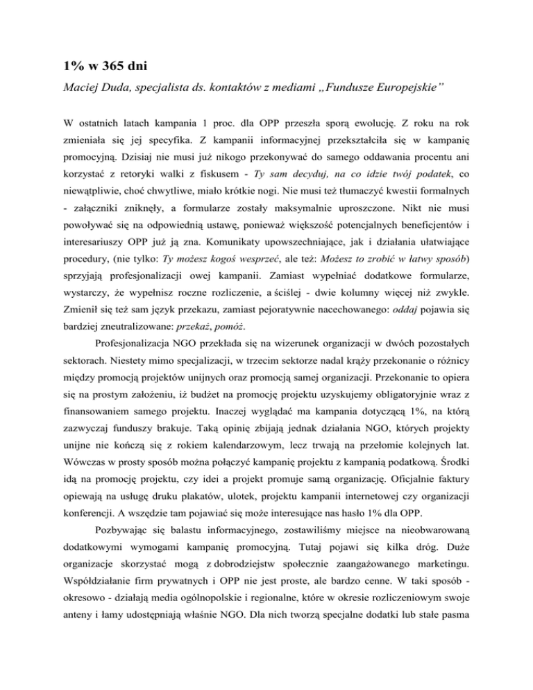 1% w 365 dni Maciej Duda, specjalista ds. kontaktów z mediami „Fundusze Europejskie” W ostatnich latach kampania 1 proc. dla OPP przeszła sporą ewolucję. Z roku na rok zmieniała się jej specyfika. Z kampanii informacyjnej przekształciła się w kampanię promocyjną. Dzisiaj nie musi juŜ nikogo przekonywać do samego oddawania procentu ani korzystać z retoryki walki z fiskusem - Ty sam decyduj, na co idzie twój podatek, co niewątpliwie, choć chwytliwe, miało krótkie nogi. Nie musi teŜ tłumaczyć kwestii formalnych - załączniki zniknęły, a formularze zostały maksymalnie uproszczone. Nikt nie musi powoływać się na odpowiednią ustawę, poniewaŜ większość potencjalnych beneficjentów i interesariuszy OPP juŜ ją zna. Komunikaty upowszechniające, jak i działania ułatwiające procedury, (nie tylko: Ty moŜesz kogoś wesprzeć, ale teŜ: MoŜesz to zrobić w łatwy sposób) sprzyjają profesjonalizacji owej kampanii. Zamiast wypełniać dodatkowe formularze, wystarczy, Ŝe wypełnisz roczne rozliczenie, a ściślej - dwie kolumny więcej niŜ zwykle. Zmienił się teŜ sam język przekazu, zamiast pejoratywnie nacechowanego: oddaj pojawia się bardziej zneutralizowane: przekaŜ, pomóŜ. Profesjonalizacja NGO przekłada się na wizerunek organizacji w dwóch pozostałych sektorach. Niestety mimo specjalizacji, w trzecim sektorze nadal krąŜy przekonanie o róŜnicy między promocją projektów unijnych oraz promocją samej organizacji. Przekonanie to opiera się na prostym załoŜeniu, iŜ budŜet na promocję projektu uzyskujemy obligatoryjnie wraz z finansowaniem samego projektu. Inaczej wyglądać ma kampania dotyczącą 1%, na którą zazwyczaj funduszy brakuje. Taką opinię zbijają jednak działania NGO, których projekty unijne nie kończą się z rokiem kalendarzowym, lecz trwają na przełomie kolejnych lat. Wówczas w prosty sposób moŜna połączyć kampanię projektu z kampanią podatkową. Środki idą na promocję projektu, czy idei a projekt promuje samą organizację. Oficjalnie faktury opiewają na usługę druku plakatów, ulotek, projektu kampanii internetowej czy organizacji konferencji. A wszędzie tam pojawiać się moŜe interesujące nas hasło 1% dla OPP. Pozbywając się balastu informacyjnego, zostawiliśmy miejsce na nieobwarowaną dodatkowymi wymogami kampanię promocyjną. Tutaj pojawi się kilka dróg. DuŜe organizacje skorzystać mogą z dobrodziejstw społecznie zaangaŜowanego marketingu. Współdziałanie firm prywatnych i OPP nie jest proste, ale bardzo cenne. W taki sposób okresowo - działają media ogólnopolskie i regionalne, które w okresie rozliczeniowym swoje anteny i łamy udostępniają właśnie NGO. Dla nich tworzą specjalne dodatki lub stałe pasma reklamowe. Wydzielony czas antenowy czy dodatkowe wkładki tematyczne wiąŜą się z duŜymi upustami dla reklamodawców, dochodzącymi nawet do 75%. Jest to jednak tylko działanie okresowe. Dodatkowym utrudnieniem moŜe być tutaj fakt, iŜ potencjalni, najwięksi partnerzy często powołują do działania swoje organizacje. Z tego teŜ powodu, partnerstwo prywatno-publiczne paradoksalnie łatwiej przebiega na rynkach lokalnych niŜ ogólnokrajowym. Takie współdziałanie nie moŜe jednak opierać się na jednorazowej prośbie i kontakcie z komórką księgowości w okresie rozliczeniowym. Przekazanie 1% wynikać musi z prezentacji działań całorocznych. Te z łatwością przedstawić moŜna na cyklicznych imprezach wpisanych w prowadzone projekty (początek i podsumowanie projektu). Przy takiej współpracy trzeba pamiętać o obopólnej korzyści. Specjalizacja rynku NGO daje moŜliwość rozmowy na temat nowych pól działania. Poza partnerstwem, działania OPP nie muszą ograniczać się do druku plakatów i rozdawania ulotek. Te zazwyczaj zawęŜają pole odbioru, skazane są tylko na miejsca stałych nośników reklamowych oraz na brak interakcji, którą oŜywia prosty marketing szeptany, działania oparte na informacjach wystosowanych nie tylko do samych beneficjentów, ale teŜ do ich rodzin – podstawowych grup targetowych. W tym kontekście ciekawie wypada tegoroczne działanie szkół podstawowych i gimnazjalnych, które nie ponosząc nakładów finansowych, zdołały nakłonić potęŜny elektorat - rodziców swoich uczniów, do wsparcia ich szkół. Powód był jasny – czysty komunikat, dla kogo i na co przeznaczone zostaną ich podatki. Ostatni i chyba najwaŜniejszy aspekt konstruowania kampanii 1 procent dla OPP to kwestia nadmiernego negatywnego obrazowania. Problemem stają się czarnobiałe kampanie ze smutnymi twarzami dzieci czy stylizowane na pietę obrazy proszące o datek na hospicjum. Pierwszym błędem jest brak konkretnego komunikatu. Na co przeznaczone zostaną pieniądze? Komu pomoŜemy? Równie waŜne staje się ukazanie efektów. Organizacje rzadko chwalą się tym, czego dokonały za poprzednio zebrane pieniądze. Nie pojawiają się hasła: Dziękujemy za pomoc, Dzięki Tobie... . Zamiast dowartościowania funkcjonuje gra na emocjach (wskazanie niezawinionej krzywdy) oraz załoŜenie, Ŝe pomoc nas uszlachetnienia. To wskazuje, iŜ mimo specjalizacji rynku NGO i weryfikacji upraszczającej funkcjonowanie mechanizmu odpisów podatkowych kampania 1% dla OPP nie całkiem weszła jeszcze w fazę profesjonalną. Nadal opiera się na bezpiecznych przekonaniach gloryfikujących pomoc i krótkofalowych działaniach. O ile ciekawsze byłoby pokazanie, Ŝe pomoc i wsparcie jest zwykłym, codziennym działaniem, Ŝe nas nie uświęca, tylko pozwala nam budować trwałe relacje, co przełoŜyć moŜe się na stałe wykorzystanie potencjału tkwiącego w docelowej grupie działania oraz interesariuszach.