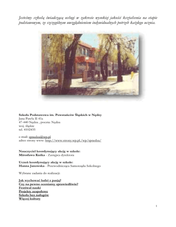 Jesteśmy szkołą świadczącą usługi w zakresie wysokiej jakości kształcenia na etapie podstawowym, ze szczególnym uwzględnieniem indywidualnych potrzeb kaŜdego ucznia. Szkoła Podstawowa im. Powstańców Śląskich w Nędzy Jana Pawła II 41a 47-440 Nędza , poczta: Nędza woj. śląskie tel. 4102435 e-mail: [email protected] adres strony www: http://www.strony.wp.pl./wp/spnedza/ Nauczyciel koordynujący akcję w szkole: Mirosława Kuśka - Zastępca dyrektora Uczeń koordynujący akcję w szkole: Hanna Janowska - Przewodnicząca Samorządu Szkolnego Wybrane zadania do realizacji: Jak wychować ludzi z pasją? Czy na pewno oceniamy sprawiedliwie? Festiwal nauki Projekty zespołowe Szkoła bez nałogów Więcej kultury 1 Dyrektor szkoły: Brygida Szczepanik Zastępca dyrektora: Mirosława Kuśka Sekretariat: Gizela Marondel Organ prowadzący szkołę: Urząd Gminy Nędza Charakter szkoły: publiczna Typ szkoły: podstawowa Liczba oddziałów: 16 Liczba nauczycieli: 31 Liczba uczniów: 324 Czym dysponujemy: Liczba sal lekcyjnych: 15 Sala gimnastyczna Boisko Biblioteka Pracownia komputerowa Liczba komputerów: 12 Co nas wyróŜnia Nowoczesny duŜy i dobrze wyposaŜony budynek Szkoły. Bardzo dobra współpraca ze środowiskiem lokalnym: organizowanie popołudniowych zajęć plastycznych dla rodziców, dzieci i nauczycieli. Nagradzanie sponsorów szkolnych tytułem - "Przyjaciel Szkoły". Wspólne organizowanie kiermaszy, festynów, zabaw karnawałowych. Rozwijanie zamiłowań i zainteresowań: Konkurs Młodych Choreografów, liczne konkursy plastyczne, muzyczne - Konkurs Pieśni Ludowej "Na Śląską Nutę", Festiwal Filmowy szkolnej twórczości dziecięcej Zajęcia pozalekcyjne Kółko j.niemieckiego 1h/tydz.(19os). Kółko plastyczne 2h(22os). Kółko przyrodnicze 1h(12os). Zespół wokalny- 2h (41os). Kółko recytatorsko-teatralne - 4h (23+16). Dziecięcy teatr "Fantasmagoria" - 1h (12os). Zespół taneczny - 2h(24os). Zespół artystyczny -2h(11+12os). SKS - 1h(48os). Klub Europejski - 2h (16os). Kółko j.włoskiego - 1h (24os). Klub Miłośników Matematyki - 1h (8os). Dla szczególnie zdolnych Kółko j.niemieckiego. Kółko przyrodnicze. Klub Miłośników Matematyki. 2 Oferta dla uczniów z trudnościami Zajęcia wyrównawcze dla kl I-III. Matematyczne Koło Ratunkowe. Pomoc w odrabianiu zadań domowych w świetlicy i bibliotece. Języki obce j.angielski ; j. niemiecki ; j.włoski Jak uczymy języków Języka niemieckiego uczymy od I klasy, w kl. IV-VI z podziałem na grupy, działa Kółko j.niemieckiego. Język angielski nauczany jest od kl. V. J. włoski jako zajęcia nieobowiązkowe dostępne dla uczniów kl. I-VI. Zajęcia profilaktyczne Akcja całodniowa "Zielony Listek" - organizowana przez pedagoga szkolnego panią mgr Monikę Bajak, występ teatrzyku szkolnego, konkurs plastyczny, zajęcia prowadzone według konspektu przygotowanego przez pedagoga. Imprezy, wydarzenia Pasowanie na ucznia, Dzień Chłopca, Sprzątanie Świata, Dzień Języków Obcych, Dzień Nauczyciela Święto Niepodległości, Konkurs Młodych Choreografów, Mikołajki, Andrzejki, Kiermasz Świąteczny, Koncert Noworoczny, wigilia klasowa, bal karnawałowy, dzień Babci i Dziadka, Dzień Kobiet, Święto Wiosny, Konkurs recytatorski, Konkurs Pieśni "Na Śląską Nutę" Dzień Ziemi, Akcja "Zielony Listek", Dzień Europejski, Dzień Matki, Święto Polskiej Szkoły, 3 Rajd matematyczno – przyrodniczy Konkursy Matematyczny -"Super Intelekt", O patronie szkoły, Konkurs Młodych Choreografów, wiedzy czerwonokrzyskiej, ekologiczny, na dzienniczek lektur, na album o kapliczkach przydroŜnych, na słownik polsko-śląski, na najładniejszą choinkę i marzannę plastyczne (kartka świąteczna, praca górnika, las, Ŝyj zdrowo, ozdoby wielkanocne), aranŜacja stołów, Super Walentynka, najmilsza dziewczyna i dŜentelmen szkoły, Zawody sportowe Turniej halowej piłki noŜnej, Sztafetowe biegi przełajowe, Turniej gier i zabaw, Mini p.noŜna 5 - cio osobowa, Turniej tenisa stołowego druŜynowego, Czwórbój lekkoatletyczny, Halowy turniej piłki noŜnej z okazji 50-cio lecia Szkolego Związku Sportowego w Raciborzu, Turniej piłki noŜnej Coca-Cola Cup 2003, Memoriał im. Janusza Kusocińskiego, Halowy turniej piłki noŜnej w Brennej. Organizacje w szkole Liga Ochrony Przyrody, Polski Czerwony KrzyŜ, Uczniowski Klub Sportowy. Wycieczki Zielona Szkoła, Muzeum Chleba w Radzionkowie, Wioska Indiańska i muzeum kolejnictwa w Rudach, ZOO w Opolu + Skansen Wsi Opolskiej w Bierkowicach, Stacja Meteorologiczna w Raciborzu, Kopalnia srebra i ołowiu w Tarnowskich Górach, Panorama Racławicka, Planetarium w Chorzowie, 4 Rajd matematyczno-przyrodnicza do Rud. Po Ojcowskim Parku Narodowym, Zakopane. Współpraca z innymi szkołami Gimnazjum w Nędzy - organizacja konkursu Młodych Choreografów, SP nr.1 w Raciborzu - organizacja wspólnych imprez. Współpraca z innymi instytucjami Starostwo Powiatowe w Raciborzu, Urząd Gminy Nędza, Gminny Ośrodek Pomocy Społecznej, Mniejszość niemiecka - DFK, Fundacja Ekologiczna "Silesia" w Katowicach, Szkółka Kontenerowa w Nędzy, Polski Czerwony KrzyŜ, Liga Ochrony Przyrody, Dom Kultury "Strzecha" w Raciborzu, Dom Kultury w Kuźni Raciborskiej, Parafia w Nędzy i Górkach Śląskich. Sprawdziany, egzaminy Próbny Sprawdzian Kompetencji kl. VI. Udział wzięło 50 uczniów, najwyŜszy wynik 38pkt, najniŜszy 7pkt. Sprawdzian Kompetencji kl.VI. Udział wzięło 52 uczniów, najwyŜszy wynik 38pkt, najniŜszy 9pkt. Losy absolwentów Wszyscy przechodzą do miejscowego gimnazjum. Laureaci Karolina Semczuk- Nagroda II stopnia w Międzynarodowym Konkursie Matematycznym "Kangur", Paweł Plewa- Nagroda II stopnia w Międzynarodowym Konkursie Matematycznym "Kangur" oraz Finalista Konkursu Matematycznego "Pikomat", Michał Augustyn- Finalista Konkursu Matematycznego "Pikomat", Krzysztof Matusik- Laureat II Olimpiady Języka Niemieckiego-VI miejsce, David Marcol- Fina