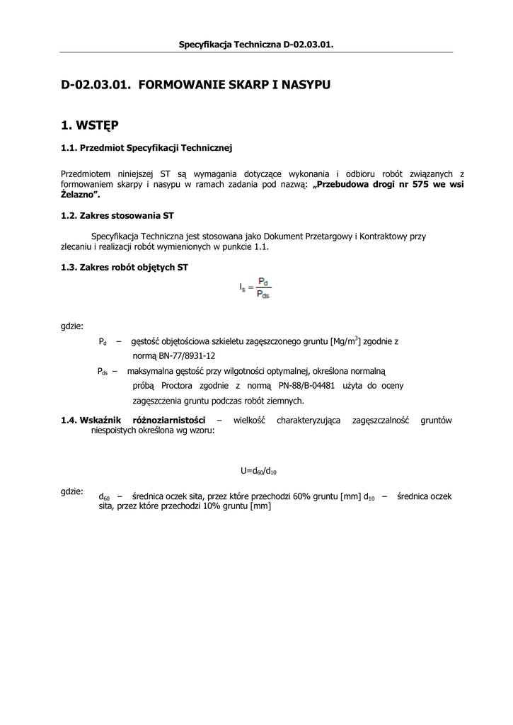 Specyfikacja Techniczna D-02.03.01. D-02.03.01. FORMOWANIE SKARP I NASYPU 1. WST P 1.1. Przedmiot Specyfikacji Technicznej Przedmiotem niniejszej ST s wymagania dotycz ce wykonania i odbioru robót zwi zanych z formowaniem skarpy i nasypu w ramach zadania pod nazw : „Przebudowa drogi nr 575 we wsi elazno”. 1.2. Zakres stosowania ST Specyfikacja Techniczna jest stosowana jako Dokument Przetargowy i Kontraktowy przy zlecaniu i realizacji robót wymienionych w punkcie 1.1. 1.3. Zakres robót obj tych ST gdzie: Pd – g sto obj to ciowa szkieletu zag szczonego gruntu [Mg/m3] zgodnie z norm BN-77/8931-12 Pds – maksymalna g sto prób przy wilgotno ci optymalnej, okre lona normaln Proctora zgodnie z norm PN-88/B-04481 u yta do oceny zag szczenia gruntu podczas robót ziemnych. 1.4. Wska nik ró noziarnisto ci – niespoistych okre lona wg wzoru: wielko charakteryzuj ca zag szczalno gruntów U=d60/d10 gdzie: d60 – rednica oczek sita, przez które przechodzi 60% gruntu [mm] d10 – sita, przez które przechodzi 10% gruntu [mm] rednica oczek Specyfikacja Techniczna D-02.03.01. 1.5. Materia y odpadowe – materia y powsta e podczas pierwotnego procesu produkcji takie jak: el wielkopiecowy, popió lotny; lub produkt uboczny eksploatacji minera ów takich jak: upek w glowy przepalony, odpady z kamienio omu lub odpady rozbiórkowe z robót budowlanych. Pozosta e okre lenia podstawowe s zgodne z obowi zuj cymi odpowiednimi polskimi normami i okre leniami podanymi ST D-00.00.00 "Wymagania ogólne". 2. MATERIA Y 2.1. Wymagania ogólne dotycz ce materia ów Ogólne wymagania dotycz ce materia ów, ich pozyskiwania i sk adowania, podano w ST "Wymagania ogólne". 2.2. Przydatno gruntów do budowy nasypów Wybór gruntu do wykonania nasypów korpusu drogowego oraz l dowiska, uzyskanego z wykopów na trasie lub z dokopów, powinien by dokonany po przeprowadzeniu bada laboratoryjnych i zakwalifikowaniu go jako przydatnego, to jest spe niaj cego wymagania okre lone w PN-S02205:1998 oraz dodatkowe wymagania okre lone w niniejszej Specyfikacji. Grunt przeznaczony do wbudowania w nasyp powinien uzyska akceptacj In yniera. Akceptacja nast puje na bie co w czasie trwania robót ziemnych na podstawie przedk adanych przez Wykonawc wyników bada laboratoryjnych, okre lonych w niniejszej Specyfikacji. Warto wska nika ró noziarnisto ci „U” gruntów u ytych do budowy nasypów powinna wynosi dla warstwy po onej poni ej niwelety robót ziemnych: - do 0,5 m co najmniej 5 - od 0,5 m do 1,2 m powy ej 3,5 - poni ej 1,2 m od 2 do 3,5 Je eli Wykonawca wbuduje w nasyp grunty lub materia y nieprzydatne, albo nie uwzgl dni zastrze dotycz cych gruntów o ograniczonej przydatno ci okre lonych w normie PN-S-02205:1998, to wszelkie takie cz ci nasypu zostan przez Wykonawc usuni te i wykonane powtórnie z gruntów o odpowiednich w ciwo ciach na jego koszt. 2.3. Grunty uzyskane z dokopów Zgodnie z Dokumentacj Projektow , brakuj ca ilo gruntu do wykonania nasypów b dzie uzyskana z dokopów wskazanych przez Wykonawc i zaakceptowanych przez In yniera. Koszt pozyskania gruntów wraz z transportem Wykonawca uwzgl dni w swoim kosztorysie. 2.4. U ycie materia ów odpadowych Materia y odpadowe okre lone w punkcie 1.4.5. mog by u yte do wykonania nasypów zgodnie z warunkami ogólnymi zawartymi w ST DM.00.00.00, mo liwo ci ich u ycia jako materia u do budowy nasypu oraz gdy spe nione zostan poni sze warunki: - materia y mog by u yte do budowy nasypu jedynie powy ej 0,5m maksymalnego poziomu wód gruntowych w rejonie nasypu. - materia zostanie zag szczony zgodnie z ST i projektem organizacji robót dla materia u uzgodnionego z dostawc , odno nymi w adzami i In ynierem. - tam, gdzie materia musi by zmieszany aby zapewni d ugotrwa stabilno lub odpowiedni sto , nale y tego dokona przy wbudowaniu materia ów. - wykonawca powinien zapewni ci e spryskiwanie wod uk adanych py ów. Woda deszczowa z Specyfikacja Techniczna D-02.03.01. - nieuko czonych robót powinna by zebrana i odprowadzona rowami umocnionymi przed oczyszczeniem oraz doprowadzona do cieku wodnego zgodnie z systemem uzgodnionym z odpowiednimi w adzami. materia y powinny rozsta wbudowane natychmiast, nie jest dopuszczalne ich sk adowanie na placu budowy. 3. SPRZ T 3.1. Ogólne wymagania dotycz ce sprz tu Ogólne wymagania dotycz ce sprz tu podano w ST "Wymagania ogólne". 3.2. Sprz t do zag szczania Sprz t u ywany do zag szczania powinien uzyska akceptacj In yniera. Wykonawca jest zobowi zany do u ywania jedynie takiego sprz tu, który nie spowoduje niekorzystnego wp ywu na w ciwo ci gruntu, zarówno w miejscach jego naturalnego zalegania, jak te w czasie odspajania, transportu, wbudowania i zag szczania. Do zag szczania nasypów nale y u ywa walce ogumione, walce wibracyjne, ubijaki mechaniczne. Dobór sprz tu zag szczaj cego zale y od rodzaju gruntu i grubo ci zag szczanej warstwy. Dobór sprz tu zag szczaj cego Wykonawca ustali do wiadczalnie przed przyst pieniem do wykonywania nasypów. Dopuszcza si ka dy inny rodzaj sprz tu zag szczaj cego zaproponowany przez Wykonawc i zaakceptowany przez In yniera. 4. TRANSPORT 4.1. Ogólne wymagania dotycz ce transportu Ogólne wymagania dotycz ce transportu podano w ST "Wymagania ogólne". 4.2. Wybór rodków transportu Wybór rodków transportu powinien by dostosowany do kategorii gruntu, jego obj to ci, technologii odspajania i za adunku oraz od odleg ci transportu. Wydajno rodków transportu powinna by dostosowana do wydajno ci sprz tu u ywanego do wykonywania wykopów oraz sprz tu u ywanego do odspajania gruntu pozyskiwanego z dokopu. 5. WYKONANIE ROBÓT 5.1. Ogólne zasady wykonania robót Ogólne zasady wykonania robót podano w ST "Wymagania ogólne". 5.2. Przygotowanie pod o a w obr bie podstawy nasypu Przed przyst pieniem do wykonywania nasypu nale y w obr bie jego podstawy zako czy roboty przygotowawcze, okre lone w Dokumentacji Projektowej oraz w ST D.01.01.01 i ST D.01.02.02. Wykonawca przy u yciu widocznych palików wyzna