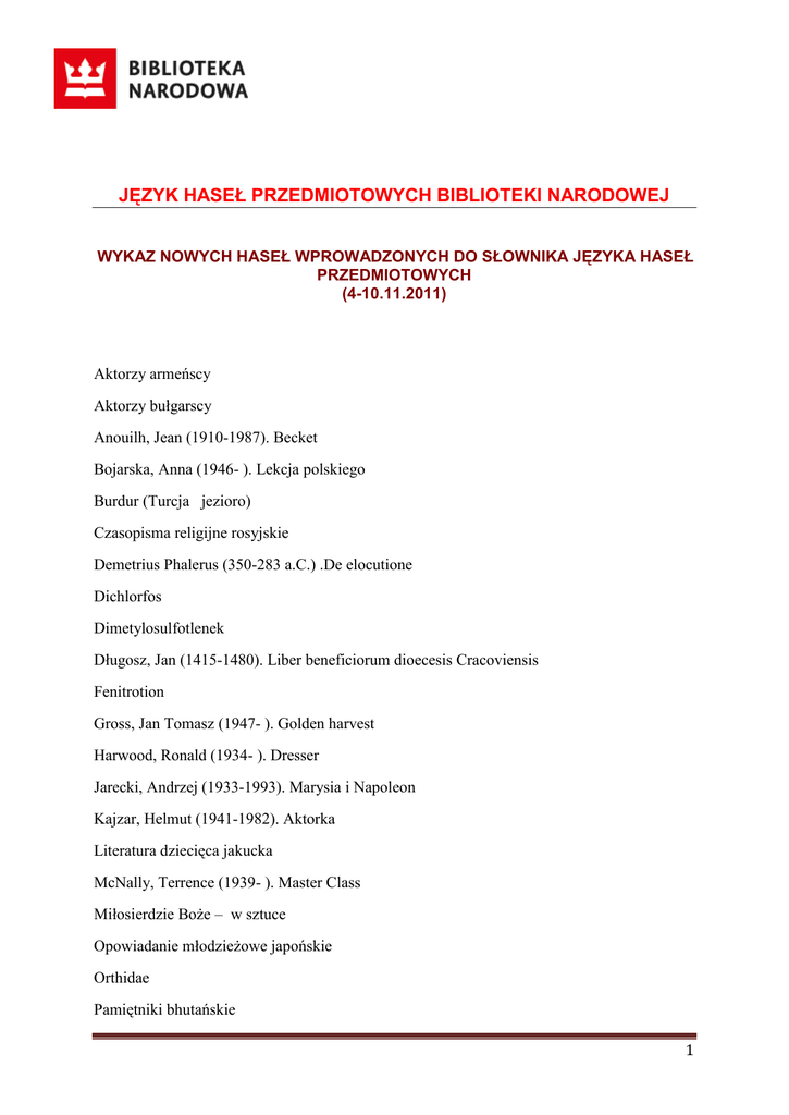 JĘZYK HASEŁ PRZEDMIOTOWYCH BIBLIOTEKI NARODOWEJ WYKAZ NOWYCH HASEŁ WPROWADZONYCH DO SŁOWNIKA JĘZYKA HASEŁ PRZEDMIOTOWYCH (4-10.11.2011) Aktorzy armeńscy Aktorzy bułgarscy Anouilh, Jean (1910-1987). Becket Bojarska, Anna (1946- ). Lekcja polskiego Burdur (Turcja jezioro) Czasopisma religijne rosyjskie Demetrius Phalerus (350-283 a.C.) .De elocutione Dichlorfos Dimetylosulfotlenek Długosz, Jan (1415-1480). Liber beneficiorum dioecesis Cracoviensis Fenitrotion Gross, Jan Tomasz (1947- ). Golden harvest Harwood, Ronald (1934- ). Dresser Jarecki, Andrzej (1933-1993). Marysia i Napoleon Kajzar, Helmut (1941-1982). Aktorka Literatura dziecięca jakucka McNally, Terrence (1939- ). Master Class Miłosierdzie Boże – w sztuce Opowiadanie młodzieżowe japońskie Orthidae Pamiętniki bhutańskie 1 Polo (sport) Rym czeski Rząd Badeniego Słowniki chińsko-łacińskie Strefa euro Strindberg, August (1849-1912). Fröken Julie Szczypiorski, Andrzej (1928-2000). Msza za miasto Arras Teatr dla dzieci polski Tocqueville, Alexis de (1805-1859). Anciéne régime et la Révolution Zjawisko Kerra 2