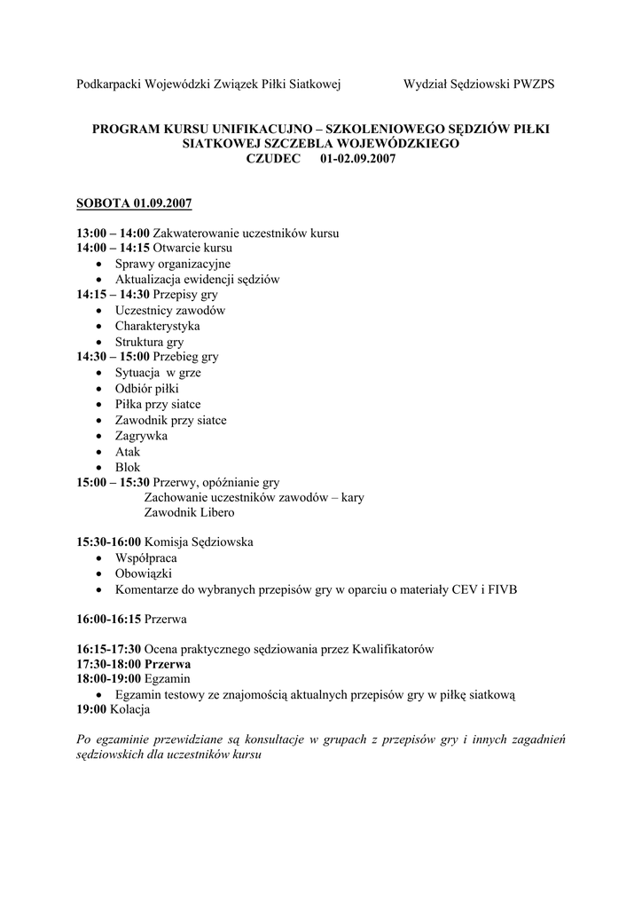 Podkarpacki Wojewódzki Związek Piłki Siatkowej Wydział Sędziowski PWZPS PROGRAM KURSU UNIFIKACUJNO – SZKOLENIOWEGO SĘDZIÓW PIŁKI SIATKOWEJ SZCZEBLA WOJEWÓDZKIEGO CZUDEC 01-02.09.2007 SOBOTA 01.09.2007 13:00 – 14:00 Zakwaterowanie uczestników kursu 14:00 – 14:15 Otwarcie kursu • Sprawy organizacyjne • Aktualizacja ewidencji sędziów 14:15 – 14:30 Przepisy gry • Uczestnicy zawodów • Charakterystyka • Struktura gry 14:30 – 15:00 Przebieg gry • Sytuacja w grze • Odbiór piłki • Piłka przy siatce • Zawodnik przy siatce • Zagrywka • Atak • Blok 15:00 – 15:30 Przerwy, opóźnianie gry Zachowanie uczestników zawodów – kary Zawodnik Libero 15:30-16:00 Komisja Sędziowska • Współpraca • Obowiązki • Komentarze do wybranych przepisów gry w oparciu o materiały CEV i FIVB 16:00-16:15 Przerwa 16:15-17:30 Ocena praktycznego sędziowania przez Kwalifikatorów 17:30-18:00 Przerwa 18:00-19:00 Egzamin • Egzamin testowy ze znajomością aktualnych przepisów gry w piłkę siatkową 19:00 Kolacja Po egzaminie przewidziane są konsultacje w grupach z przepisów gry i innych zagadnień sędziowskich dla uczestników kursu NIEDZIELA 23.09.2007 07:00 – 08:50 Śniadanie 09:00 – 09:15 Wznowienie zajęć • Podsumowanie pierwszego dnia szkolenia • Sprawy organizacyjne 09:15 – 09:30 Protokołowanie zawodów • Wybrane zagadnienia z zasad protokołowania zawodów piłki siatkowej • Omówienie zmian w zapisie protokołu zawodów w sezonie 2007/2008 • Analiza błędów w protokołowaniu zawodów w okresie ubiegłego sezonu rozgrywek 09:30 – 09:45 Sygnalizacja sędziowska • Omówienie aktualnej sygnalizacji sędziowskiej sędziego S I, S II i S Liniowego wraz z prezentacją 09:45 – 10:15 Ceremonia i organizacja zawodów • Omówienie aktualnego Ceremoniału zawodów międzynarodowych i krajowych, wojewódzkich obowiązującego w sezonie 2007/2008 • Zagadnienia techniczno-organizacyjne, dotyczące przygotowania zawodów piłki siatkowej i ich przeprowadzania. /boisko, piłki do gry, osprzęt techniczny/ 10:15 – 10:30 Przerwa 10:30 – 11:15 Kwalifikacje sędziowskie • Omówienie kwalifikacji sędziowskich przeprowadzonych w sezonie 2006/2007 – analiza błędów popełnianych przez sędziów • Rola, zadania i obowiązki Kwalifikatora na zawodach • Współpraca sędziów i Kwalifikatorów • Zasady kwalifikacji sędziów w sezonie 2007/2008 • Omówienie arkusza kwalifikacyjnego sędziów 11:15–12:00 Zagadnienie informacyjno – organizacyjne, stawki sędziowskie i system rozgrywek • Informacja o działalności Wydziału Sędziowskiego PWZPS w sezonie 2006/2007 • Zasady rozliczania delegacji sędziowskich obowiązujące w sezonie 2007/2008, stawki sędziowskie 12:00 – 12:15 Przerwa 12:15 – 12:45 Obsada sędziowska • Założenia dotyczące obsady sędziowskiej szczebla wojewódzkiego na sezon 2007/2008 • Zasady dokonywania zamian w obsadzie sędziowskiej • Podsumowanie obsad sędziowski za sezon 2006/2007 12:45 – 13:00 Wyniki egzaminu • Omówienie testu egzaminacyjnego ze znajomości gry w piłkę siatkową 13:00 – 14:00 Zakończenie kursu • Sprawy różne • Wolne wnioski • Podsumowanie przebiegu szkolenia • Zakończenie kursu W kursie uczestniczą obowiązkowo wszyscy sędziowie PWZPS. Dotyczy to również sędziów, którzy ukończyli kurs podstawowy oraz sędziów szczebla centralnego. Na kurs należy zabrać ze sobą: - kopię ubezpieczenia z tytułu wykonywania obowiązków sędziego piłki siatkowej - przybory do pisania - 80 zł – opłata za licencję na sezon 2007/2008 - dobry humor Brak usprawiedliwionej nieobecności na kursie lub niezdanie egzaminów spowoduje skreślenie sędziego z listy sędziów PWZPS. Drugi termin szkolenia zostanie podany w Czudcu i na naszej stronie internetowej. PRZEWODNICZĄCY WS PWZPS Piotr Dudek