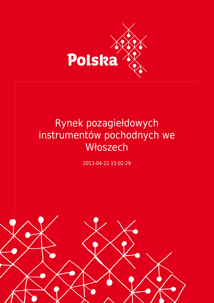 Rynek pozagiełdowych instrumentów pochodnych we Włoszech 2013-04-22 15:02:29 2 Rozwój włoskiego rynku pozagiełdowych instrumentów pochodnych nastąpił począwszy od końca lat osiemdziesiątych. Informacje ogólne: Rozwój włoskiego rynku pozagiełdowych instrumentów pochodnych nastąpił począwszy od końca lat osiemdziesiątych i na początku następnej dekady, będąc następstwem procesu liberalizacji wraz z wprowadzeniem waluty unijnej Euro. W latach osiemdziesiątych głównymi graczami na rynku były duże banki, firmy ubezpieczeniowe oraz niewielka liczba przedsiębiorstw przemysłowych. We wrześniu 2004 r. całkowita wielkość transakcji rynku instrumentów pochodnych negocjowanych przez banki osiągnęła 6.400 mld euro. Działalność banków i innych pośredników na rynku produktów pochodnych jest kontrolowana przez dwie instytucje we Włoszech: CONSOB (włoski odpowiednik Komisji Nadzoru Finansowego) i Banca d’Italia. Uczestnicy rynku pozagiełdowych instrumentów pochodnych (w tym opcji walutowych): -Instytucje finansowe: główne banki we Włoszech- Bank Nazionale del Lavoro (BNL), Banca UniCredit Banca Intesa oraz Mobiliare (UBM, oddział investment banking bankowego giganta Credito Italiano), Banca Akros. -Inwestorzy instytucjonalni, firmy ubezpieczeniowe -Instytucje niefinansowe: przedsiębiorstwa korzystają z instrumentów pochodnych w celu zwalczania skutków zmian cen towarów, walut , wymiany, stóp procentowych. Z badania przeprowadzonego na 7.000 firmach w 2004 r. wydaje się, że instrumenty pochodne są wykorzystywane głównie na pokrycie ryzyka walutowego (44 procent) oraz ryzyka stopy procentowej (33 procent) -Sektor publiczny W 2003 roku dokonano analizy rynkowej z której wynika że głównymi graczami na włoskim rynku instrumentów pochodnych byli: Goldman Sachs, UBS Warburg, Banca Nazionale del Lavoro, Deutsche Bank, JP Morgan Chase. W kwietniu 2007 Ufficio Italiano dei Cambi przeprowadził zwyczajowe trzyletnie badanie obrotów na rynku walutowym i rynku pozagiełdowych instrumentów pochodnych przeprowadzanych przez główne banki we Włoszech. W projekcie uczestniczyły banki centralne i władze monetarne 54 krajów, pracami koordynował Bank Rozrachunków Międzynarodowych. Włoskie badanie zostało przeprowadzone na próbie 27 banków (26 banków włoskich i 1 oddział banku zagranicznego we Włoszech). Ich udział we włoskim rynku walutowym i rynku instrumentów pochodnych szacowany jest na 82 i 92 procent, odpowiednio, próbki z roku 2004 stanowiły 92 i 84 procent.W kwietniu 2007 wielkość transakcji walutowych brutto dokonanych przez system bankowy, biorąc pod uwagę zakres próby, wyniósł 856 miliardów dolarów USD lub 824 miliardów dolarów po korekcie lokalnego podwójnego naliczania. Na podstawie średniej dziennej (19 dni w kwietniu 2007) obroty netto można szacować na około 43 mld dolarów (22 mld $ w 2004 r.). Zliczając wielkość transakcji walutowych i transakcji z rynku instrumentów pochodnych, wyniósła ona 1,538 mld dolarów lub 1,481 mld dolarów po korekcie podwójnego naliczania. Średnie dzienne obroty wyniosły 78 mld dolarów.We Włoszech transakcja typu swap pozostaje 3 najczęściej wykorzystywanym rodzajem instrumentu pochodnego. Wielkość transakcji typu swap była dominująca zarówno na rynku walutowym typu forward (83 procent) jak i na rynku stopy procentowej (82 procent). Wielkość dokonywanych opcji walutowych zmniejszyła się o połowę 2007r., w przypadku opcji na stopę procentową zarejestrowano niewielki wzrost. Transakcje wyrażone w euro dominowały na obu rynkach, zarówno na rynku walutowym jak rynkach instrumentów pochodnych, stanowiły około 86 procent (78 procent w roku 2004) łącznego obrotu. Obroty rynku walutowego i rynku instrumentów pochodnych (w tym opcji ) wg. instrumentów Rynek walutowy (w mln USD): http://uif.bancaditalia.it/UICFEWebroot/new/img/png/turnover07-cap2-graf1-en.png Rynek stopy procentowej: http://uif.bancaditalia.it/UICFEWebroot/new/img/png/turnover07-cap2-graf2-en.png Rynek walutowy i rynek stopy proc. razem: http://uif.bancaditalia.it/UICFEWebroot/new/img/png/turnover07-cap2-graf3-en.png Źródło: Comunicato Stampa, DIFFUSO A CURA DEL SERVIZIO SEGRETERIA PARTICOLARE, Banca d’Italia, Rzym 2007 Wielkość transakcji na rynku walutowym i na rynku instrumentów pochodnych w kwietniu 2007 (dane podane w mln USD) kategoria / instrument grand total total dom.cur. o/w euro / usd total for.cur. o/w usd Rynek walutowy 713.520 589.171 481.131 124.349 121.716 82,6% 81,7% 17,4% 97,9% o/w Spot 213.837 189.821 127.987 24.016 23.162 Outright forwards 48.461 40.520 33.581 7.941 7.827 4 F.E.Swaps 413.403 328.662 297.319 84.742 84.490 Currency swaps 2.393 2.193 1.500 200 200 Options 35.426 27.976 20.744 7.450 6.037 Other products - - - - - Rynek stopy procentowej 566.889 510.819 56.070 39.528 90,1% 9,9% 7,0% o/w F.R.A. 48.451 29.883 18.568 13.557 Swaps 467.087 431.589 35.498 24.470 Options 51.351 49.347 2.004 1.501 Other products - - - - Total 1.280.409 1.099.990 85,9% 180.419 14,1% 161.244 89,4% Źródło: Comunicato Stampa, DIFFUSO A CURA DEL SERVIZIO SEGRETERIA PARTICOLARE, Banca d’Italia, Rzym 2007 5