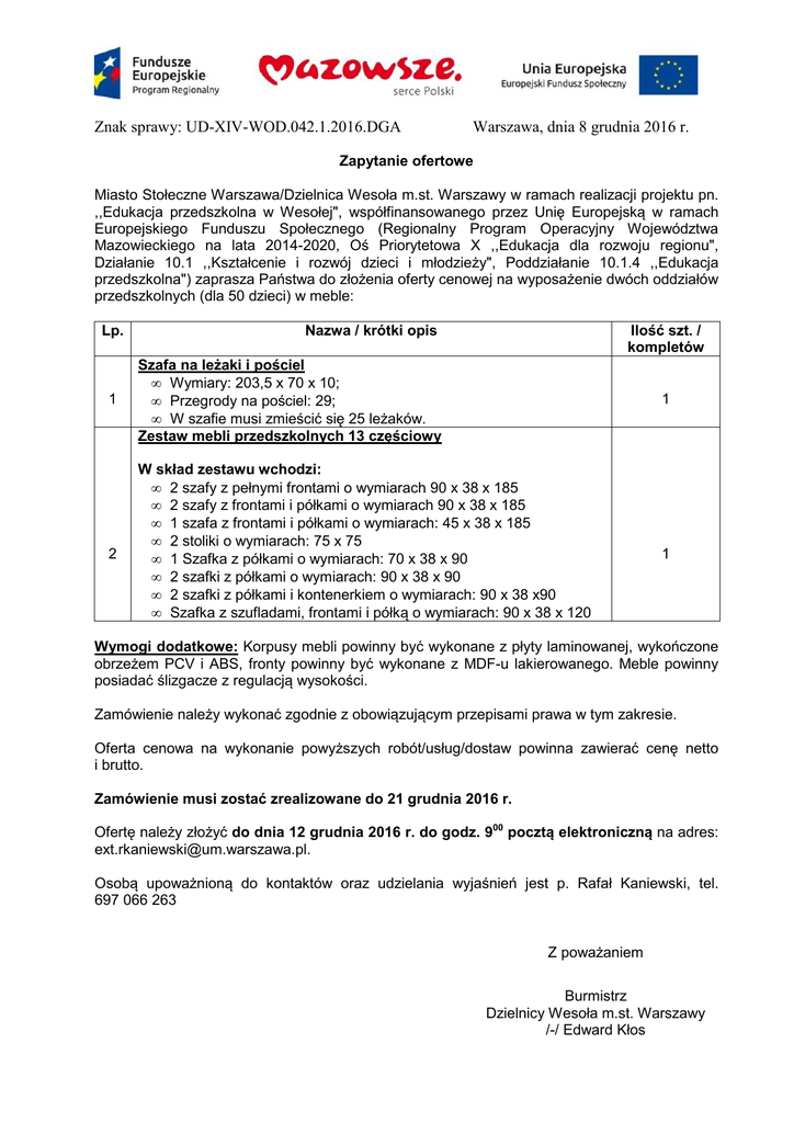 Znak sprawy: UD-XIV-WOD.042.1.2016.DGA Warszawa, dnia 8 grudnia 2016 r. Zapytanie ofertowe Miasto Stołeczne Warszawa/Dzielnica Wesoła m.st. Warszawy w ramach realizacji projektu pn. ,,Edukacja przedszkolna w Wesołej", współfinansowanego przez Unię Europejską w ramach Europejskiego Funduszu Społecznego (Regionalny Program Operacyjny Województwa Mazowieckiego na lata 2014-2020, Oś Priorytetowa X ,,Edukacja dla rozwoju regionu", Działanie 10.1 ,,Kształcenie i rozwój dzieci i młodzieży", Poddziałanie 10.1.4 ,,Edukacja przedszkolna") zaprasza Państwa do złożenia oferty cenowej na wyposażenie dwóch oddziałów przedszkolnych (dla 50 dzieci) w meble: Lp. 1 2 Nazwa / krótki opis Ilość szt. / kompletów Szafa na leżaki i pościel • Wymiary: 203,5 x 70 x 10; • Przegrody na pościel: 29; • W szafie musi zmieścić się 25 leżaków. Zestaw mebli przedszkolnych 13 częściowy 1 W skład zestawu wchodzi: • 2 szafy z pełnymi frontami o wymiarach 90 x 38 x 185 • 2 szafy z frontami i półkami o wymiarach 90 x 38 x 185 • 1 szafa z frontami i półkami o wymiarach: 45 x 38 x 185 • 2 stoliki o wymiarach: 75 x 75 • 1 Szafka z półkami o wymiarach: 70 x 38 x 90 • 2 szafki z półkami o wymiarach: 90 x 38 x 90 • 2 szafki z półkami i kontenerkiem o wymiarach: 90 x 38 x90 • Szafka z szufladami, frontami i półką o wymiarach: 90 x 38 x 120 1 Wymogi dodatkowe: Korpusy mebli powinny być wykonane z płyty laminowanej, wykończone obrzeżem PCV i ABS, fronty powinny być wykonane z MDF-u lakierowanego. Meble powinny posiadać ślizgacze z regulacją wysokości. Zamówienie należy wykonać zgodnie z obowiązującym przepisami prawa w tym zakresie. Oferta cenowa na wykonanie powyższych robót/usług/dostaw powinna zawierać cenę netto i brutto. Zamówienie musi zostać zrealizowane do 21 grudnia 2016 r. Ofertę należy złożyć do dnia 12 grudnia 2016 r. do godz. 900 pocztą elektroniczną na adres: [email protected]. Osobą upoważnioną do kontaktów oraz udzielania wyjaśnień jest p. Rafał Kaniewski, tel. 697 066 263 Z poważaniem Burmistrz Dzielnicy Wesoła m.st. Warszawy /-/ Edward Kłos