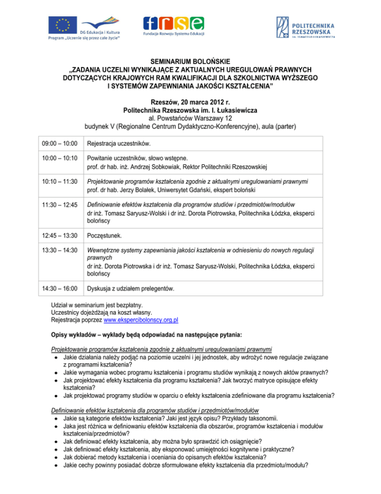 SEMINARIUM BOLOŃSKIE „ZADANIA UCZELNI WYNIKAJĄCE Z AKTUALNYCH UREGULOWAŃ PRAWNYCH DOTYCZĄCYCH KRAJOWYCH RAM KWALIFIKACJI DLA SZKOLNICTWA WYŻSZEGO I SYSTEMÓW ZAPEWNIANIA JAKOŚCI KSZTAŁCENIA” Rzeszów, 20 marca 2012 r. Politechnika Rzeszowska im. I. Łukasiewicza al. Powstańców Warszawy 12 budynek V (Regionalne Centrum Dydaktyczno-Konferencyjne), aula (parter) 09:00 – 10:00 Rejestracja uczestników. 10:00 – 10:10 Powitanie uczestników, słowo wstępne. prof. dr hab. inż. Andrzej Sobkowiak, Rektor Politechniki Rzeszowskiej 10:10 – 11:30 Projektowanie programów kształcenia zgodnie z aktualnymi uregulowaniami prawnymi prof. dr hab. Jerzy Bolałek, Uniwersytet Gdański, ekspert boloński 11:30 – 12:45 Definiowanie efektów kształcenia dla programów studiów i przedmiotów/modułów dr inż. Tomasz Saryusz-Wolski i dr inż. Dorota Piotrowska, Politechnika Łódzka, eksperci bolońscy 12:45 – 13:30 Poczęstunek. 13:30 – 14:30 Wewnętrzne systemy zapewniania jakości kształcenia w odniesieniu do nowych regulacji prawnych dr inż. Dorota Piotrowska i dr inż. Tomasz Saryusz-Wolski, Politechnika Łódzka, eksperci bolońscy 14:30 – 16:00 Dyskusja z udziałem prelegentów. Udział w seminarium jest bezpłatny. Uczestnicy dojeżdżają na koszt własny. Rejestracja poprzez www.ekspercibolonscy.org.pl Opisy wykładów – wykłady będą odpowiadać na następujące pytania: Projektowanie programów kształcenia zgodnie z aktualnymi uregulowaniami prawnymi Jakie działania należy podjąć na poziomie uczelni i jej jednostek, aby wdrożyć nowe regulacje związane z programami kształcenia? Jakie wymagania wobec programu kształcenia i programu studiów wynikają z nowych aktów prawnych? Jak projektować efekty kształcenia dla programu kształcenia? Jak tworzyć matryce opisujące efekty kształcenia? Jak projektować programy studiów w oparciu o efekty kształcenia zdefiniowane dla programu kształcenia? Definiowanie efektów kształcenia dla programów studiów i przedmiotów/modułów Jakie są kategorie efektów kształcenia? Jaki jest język opisu? Przykłady taksonomii. Jaka jest różnica w definiowaniu efektów kształcenia dla obszarów, programów kształcenia i modułów kształcenia/przedmiotów? Jak definiować efekty kształcenia, aby można było sprawdzić ich osiągnięcie? Jak definiować efekty kształcenia, aby eksponować umiejętności kognitywne i praktyczne? Jak dobierać metody kształcenia i oceniania do opisanych efektów kształcenia? Jakie cechy powinny posiadać dobrze sformułowane efekty kształcenia dla przedmiotu/modułu? Wewnętrzne systemy zapewniania jakości kształcenia w odniesieniu do nowych regulacji prawnych Jakie wymagania stawiane są wewnętrznym systemom zapewniania jakości kształcenia (WSZJK) w świetle nowych uregulowań prawnych? Jak tworzyć wewnętrzne systemy zapewniania jakości kształcenia w uczelni i w jednostkach uczelni? Jak projektować wytyczne działania takich systemów? Jaka jest relacja między system zapewniania jakości a kulturą jakości? Jakie są kryteria oceny PKA stymulujące zakres działania WSZJK?
