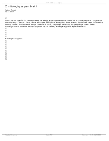 Szkoła Podstawowa w Łęknicy Z mitologią za pan brat ! Autor: Tomek 03.11.2015. Co to był za dzień ! Do naszej szkoły na lekcję języka polskiego w klasie VB przybyli bogowie i boginie ze starożytnego Olimpu: Zeus, Hera, Afrodyta, Hefajstos, Posejdon, Ares, Atena, Persefona oraz inni wielcy tamtej epoki. Prezentowali swoje historie z życia, zwyczaje, atrybuty, by przybliżyć nam świat mitologicznych czasów. Wszyscy spisali się na medal, a lekcja wypadła wyśmienicie ! Katarzyna Zagała http://spleknica.info Kreator PDF Utworzono 4 March, 2017, 03:06