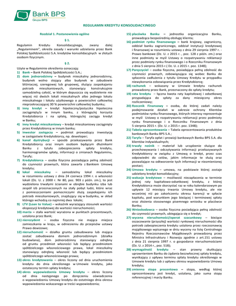 REGULAMIN KREDYTU KONSOLIDACYJNEGO Rozdział 1. Postanowienia ogólne § 1. Regulamin Kredytu Konsolidacyjnego, zwany dalej „Regulaminem”, określa zasady i warunki udzielania przez Bank Polskiej Spółdzielczości S.A. kredytów konsolidacyjnych w złotych osobom fizycznym. § 2. Użyte w Regulaminie określenia oznaczają: 1) Bank – Bank Polskiej Spółdzielczości S.A.; 2) dom jednorodzinny – budynek mieszkalny jednorodzinny, budynek wolno stojący albo budynek w zabudowie bliźniaczej, szeregowej lub grupowej, służący zaspokajaniu potrzeb mieszkaniowych, stanowiący konstrukcyjnie samodzielną całość, w którym dopuszcza się wydzielenie nie więcej niż dwóch lokali mieszkalnych albo jednego lokalu mieszkalnego i lokalu użytkowego o powierzchni całkowitej nieprzekraczającej 30 % powierzchni całkowitej budynku; 3) inny kredyt – kredyt hipoteczny/pożyczka hipoteczna zaciągnięty/a w innym banku, z którego/ej korzysta Kredytobiorca i na spłatę, którego/ej zaciąga kredyt w Banku; 4) inny kredyt mieszkaniowy – kredyt mieszkaniowy zaciągnięty przez Kredytobiorcę w innym banku; 5) inwestor zastępczy – podmiot prowadzący inwestycję w zastępstwie Kredytobiorcy, np. deweloper; 6) kanał dystrybucji – sposób przekazywania przez Bank Kredytobiorcy oraz innym osobom będącym dłużnikami Banku z tytułu zabezpieczenia spłaty kredytu, harmonogramów spłaty, informacji o zmianach Regulaminu, Taryfy; 7) Kredytobiorca – osoba fizyczna posiadająca pełną zdolność do czynności prawnych, która zawarła z Bankiem Umowę kredytu; 8) lokal mieszkalny – samodzielny lokal mieszkalny w rozumieniu ustawy z dnia 24 czerwca 1994 r. o własności lokali (Dz. U. z 2000 r. Nr 80, poz. 903 z późn. zm.), to jest wydzielona trwałymi ścianami w obrębie budynku izba lub zespół izb przeznaczonych na stały pobyt ludzi, które wraz z pomieszczeniami pomocniczymi służą zaspokajaniu ich potrzeb mieszkaniowych, znajdujący się w budynku, w skład którego wchodzą co najmniej dwa lokale; 9) LTV (Loan to Value) – wskaźnik wyrażający stosunek wartości ekspozycji kredytowej do wartości nieruchomości; 10) marża – stała wartość wyrażona w punktach procentowych, ustalona przez Bank; 11) nierezydent – osoba fizyczna nie mająca miejsca zamieszkania w kraju, w odniesieniu do przepisów ustawy Prawo dewizowe; 12) nieruchomość – działka gruntu zabudowana lub mająca zostać zabudowana domem jednorodzinnym (działka budowlana), dom jednorodzinny stanowiący odrębny od gruntu przedmiot własności lub będący przedmiotem spółdzielczego własnościowego prawa, lokal mieszkalny stanowiący odrębną własność lub będący przedmiotem spółdzielczego własnościowego prawa; 13) okres kredytowania – okres liczony od dnia uruchomienia kredytu do dnia określonego w Umowie kredytu, jako ostateczny termin spłaty kredytu; 14) okres wypowiedzenia Umowy kredytu – okres liczony od dnia następnego po doręczeniu oświadczenia o wypowiedzeniu Umowy kredytu do ostatniego dnia okresu wypowiedzenia wskazanego w treści wypowiedzenia; 15) placówka Banku – jednostka organizacyjna Banku, prowadząca bezpośrednią obsługę klienta; 16) podmiot rynku finansowego – bank krajowy, zagraniczny, oddział banku zagranicznego, oddział instytucji kredytowej i finansowej w rozumieniu ustawy z dnia 29 sierpnia 1997 r. Prawo bankowe (Dz. U. z 2015 r. , poz. 128 z późn. zm.) oraz inne podmioty w myśl Ustawy o rozpatrywaniu reklamacji przez podmioty rynku finansowego i o Rzeczniku Finansowym z dnia 5 sierpnia 2015 r.( Dz. U. z 2015 r. poz. 1348); 17) Poręczyciel – osoba fizyczna, posiadająca pełną zdolność do czynności prawnych, zobowiązująca się wobec Banku do spłacenia zadłużenia z tytułu Umowy Kredytu w przypadku niewykonania zobowiązania przez Kredytobiorcę; 18) rachunek – wskazany w Umowie kredytu rachunek prowadzony przez Bank, przeznaczony do spłaty kredytu; 19) rata kredytu – łączna kwota raty kapitałowej i odsetkowej przypadająca do spłaty za dany miesięczny okres rozliczeniowy; 20) Rzecznik Finansowy – osoba, do której zadań należy podejmowanie działań w zakresie ochrony Klientów podmiotów rynku finansowego, których interesy reprezentuje w myśl Ustawy o rozpatrywaniu reklamacji przez podmioty rynku finansowego i o Rzeczniku Finansowym z dnia 5 sierpnia 2015 r. (Dz. U. z 2015 r. poz. 1348); 21) Tabela oprocentowania – Tabela oprocentowania produktów bankowych Banku BPS S.A.; 22) Taryfa – Taryfa opłat i prowizji bankowych Banku BPS S.A. dla klientów indywidualnych; 23) trwały nośnik – materiał lub urządzenie służące do przechowywania i odczytywania informacji przekazywanych Kredytobiorcy w związku z Umową o kredyt, przez czas odpowiedni do celów, jakim informacje te służą oraz pozwalające na odtworzenie tych informacji w niezmienionej postaci; 24) Umowa kredytu – umowa, na podstawie której zostaje udzielony kredyt konsolidacyjny; 25) wakacje kredytowe – możliwość niezapłacenia w terminie jednej raty kapitałowo-odsetkowej kredytu, z której Kredytobiorca może skorzystać raz w roku kalendarzowym po upływie 12 miesięcy trwania Umowy kredytu, ale nie wcześniej niż po zakończeniu okresu karencji w spłacie kapitału, pod warunkiem jego bieżącej i terminowej spłaty oraz złożenia stosownego pisemnego wniosku w placówce Banku; 26) Wnioskodawca – osoba fizyczna posiadająca pełną zdolność do czynności prawnych, ubiegająca się o kredyt; 27) wycena nieruchomości/operat szacunkowy – bieżące oszacowanie (przyszłej) wartości rynkowej nieruchomości dla potrzeb zabezpieczenia kredytu ustalona przez rzeczoznawcę majątkowego wpisanego w dniu wyceny na listę Centralnego Rejestru Rzeczoznawców Majątkowych prowadzoną przez Ministra Infrastruktury i Rozwoju zgodnie z art.151 ustawy z dnia 21 sierpnia 1997 r. o gospodarce nieruchomościami (Dz. U. z 2014 r., poz. 518