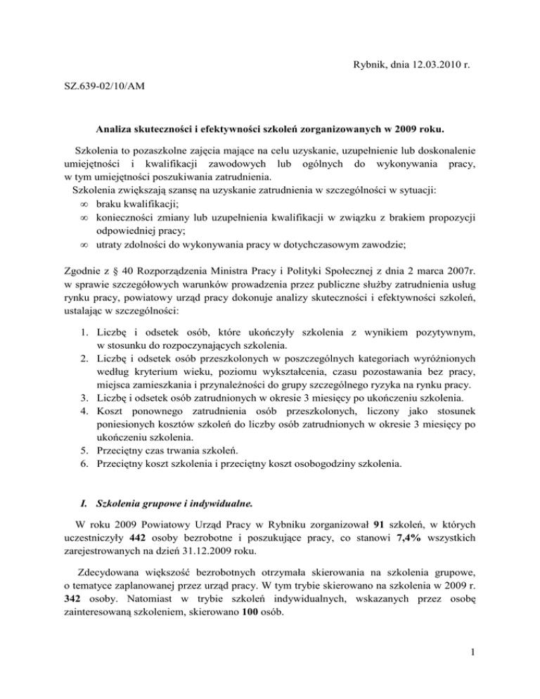 Rybnik, dnia 12.03.2010 r. SZ.639-02/10/AM Analiza skuteczności i efektywności szkoleń zorganizowanych w 2009 roku. Szkolenia to pozaszkolne zajęcia mające na celu uzyskanie, uzupełnienie lub doskonalenie umiejętności i kwalifikacji zawodowych lub ogólnych do wykonywania pracy, w tym umiejętności poszukiwania zatrudnienia. Szkolenia zwiększają szansę na uzyskanie zatrudnienia w szczególności w sytuacji: • braku kwalifikacji; • konieczności zmiany lub uzupełnienia kwalifikacji w związku z brakiem propozycji odpowiedniej pracy; • utraty zdolności do wykonywania pracy w dotychczasowym zawodzie; Zgodnie z § 40 Rozporządzenia Ministra Pracy i Polityki Społecznej z dnia 2 marca 2007r. w sprawie szczegółowych warunków prowadzenia przez publiczne służby zatrudnienia usług rynku pracy, powiatowy urząd pracy dokonuje analizy skuteczności i efektywności szkoleń, ustalając w szczególności: 1. Liczbę i odsetek osób, które ukończyły szkolenia z wynikiem pozytywnym, w stosunku do rozpoczynających szkolenia. 2. Liczbę i odsetek osób przeszkolonych w poszczególnych kategoriach wyróżnionych według kryterium wieku, poziomu wykształcenia, czasu pozostawania bez pracy, miejsca zamieszkania i przynależności do grupy szczególnego ryzyka na rynku pracy. 3. Liczbę i odsetek osób zatrudnionych w okresie 3 miesięcy po ukończeniu szkolenia. 4. Koszt ponownego zatrudnienia osób przeszkolonych, liczony jako stosunek poniesionych kosztów szkoleń do liczby osób zatrudnionych w okresie 3 miesięcy po ukończeniu szkolenia. 5. Przeciętny czas trwania szkoleń. 6. Przeciętny koszt szkolenia i przeciętny koszt osobogodziny szkolenia. I. Szkolenia grupowe i indywidualne. W roku 2009 Powiatowy Urząd Pracy w Rybniku zorganizował 91 szkoleń, w których uczestniczyły 442 osoby bezrobotne i poszukujące pracy, co stanowi 7,4% wszystkich zarejestrowanych na dzień 31.12.2009 roku. Zdecydowana większość bezrobotnych otrzymała skierowania na szkolenia grupowe, o tematyce zaplanowanej przez urząd pracy. W tym trybie skierowano na szkolenia w 2009 r. 342 osoby. Natomiast w trybie szkoleń indywidualnych, wskazanych przez osobę zainteresowaną szkoleniem, skierowano 100 osób. 1 Szkolenia ukończyło ogółem 430 osób co stanowi 97,3% osób skierowanych, w tym absolwenci szkoleń grupowych – 336 osób i absolwenci szkoleń indywidualnych – 94 osoby. Najczęstszą przyczyną nie ukończenia szkolenia był długotrwały pobyt na zwolnieniu lekarskim uczestników szkoleń lub podjęcie zatrudnienia w trakcie trwania szkolenia. Dane te przedstawia poniższy wykres: 350 300 250 200 grupowe 150 indywidualne 100 50 0 ilość szkoleń skierowani absolwenci II. Realizowane kierunki szkoleń w 2009 roku. Mając na celu realizację zadań na rzecz rozwoju zasobów ludzkich oraz biorąc pod uwagę przeprowadzoną analizę sytuacji rynku pracy i analizę ankiet dotyczących kierunków szkoleń przeprowadzonych wśród osób zarejestrowanych, Powiatowy Urząd Pracy w Rybniku zorganizował w 2009 roku następujące kierunki szkoleń grupowych: Lp. Nazwa szkolenia Ilość uczestników 1. 2. 3. 4. 5. 6. 7. 8. 9. 10. 11. 12. 13. Kadry – płace (II edycje) Księgowy (II edycje) Kasjer sprzedawca Referent administracyjno-biurowy Spawanie metodą MAG – TIG Spawanie metodą MAG – EL Kierowca operator wózków jezdniowych Asystent osób starszych i niepełnosprawnych Krawiec Kasjer handlowy Operator koparko ładowarki i koparki z poszerzeniem Murarz – tynkarz (II edycje) Operator sprzętu do robót ziemnych i urządzeń pokrewnych Własna firma 50 40 40 20 16 16 16 15 15 15 13 11 10 14. 10 2 15. 16. 17. 18. 19. 20. Kosmetyczka Magazynier Pracownik ochrony mienia i osób Spawanie metodą MAG i ponadpodstawowy Grafika komputerowa Rewident taboru podstawowy 10 10 10 10 8 7 Najwięcej osób skierowano na szkolenia z zakresu prac biurowych, spawania, obsługi sprzętu ciężkiego i wózków jezdniowych oraz prac związanych z szeroko pojętymi usługami. Jest to związane z zainteresowaniem osób zarejestrowanych tego rodzaju szkoleniami. W odpowiedzi na oczekiwane przez pracodawców kwalifikacje i umiejętności kandydatów do pracy oraz na potrzeby bezrobotnych w 2009 roku zorganizowano następujące kierunki szkoleń indywidualnych: Lp. 1. 2. 3. 4. 5. 6. 7. 8. 9. 10. 11. 12. 13. 14. 15. 16. 17. 18. 19. 20. 21. 22. 23. 24. 25. 26. 27. 28. Nazwa szkolenia Operator koparko ładowarki Kierowca operator wózków jezdniowych Palacz c. o. Prawo jazdy kat. C Instruktor nauki jazdy kat. B Dokształcający dla kierowców przewożących rzeczy podstawowy Magazynier z obsługą komputera Spawanie metodą MAG Kadry – płace Bukieciarz – florysta Operator koparki Prawo jazdy kat. C + E Kwalifikacja wstępna na przewóz osób Transport drogowy taksówką Spawanie metodą MAG oraz EL Operator ładowarki Kosztorysant robót budowlanych Własna firma Obsługa małej firmy Kasjer walutowo – złotowy Spawanie metodą TIG w aluminium Spawanie metodą EL oraz metodą TIG Spawanie metodą MAG oraz metodą TIG Towaroznawstwo materiałów medycznych Warsztaty EEG Biofeedback Uprawnienia SEP bez ograniczeń napięcia Kurs dokształcający dla kierowców przewożących rzeczy – dodatkowy Kosmetyczny Ilość uczestników 14 13 11 6 5 5 5 4 3 3 3 3 3 3 2 2 2 1 1 1 1 1 1 1 1 1 1 1 3 29. 30. Dyżurny ruchu Kurs pedagogiczny dla instruktora praktycznej nauki zawodu 1 1 Szeroki zakres tematyczny szkoleń indywidualnych pokazuje jak zróżnicowane i często specyficzne potrzeby posiadają pracodawcy oraz osoby, które zamierzają podjąć własną działalność gospodarczą. III. Osoby przeszkolone według określonych kryteriów. Poniższe wykresy przedstawiają liczbę oraz odsetek osób przeszkolonych w poszczególnych kategoriach wyróżnionych według określonych kryteriów. Liczba i odsetek osób przeszkolonych wg kryterium wieku: 26%(111os.) 32%(137os.) 18 - 24 lat 25 - 34 lat 35 - 44 
