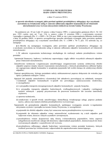UCHWAŁA NR XLIII/232/2010 RADY GMINY PRZYTOCZNA z dnia 15 czerwca 2010 r. w sprawie określenia wymagań, jakie powinni spełniać przedsiębiorcy ubiegający się o uzyskanie zezwolenia na świadczenie usług w zakresie odbierania odpadów komunalnych od właścicieli nieruchomości oraz wywozu nieczystości ciekłych na terenie Gminy Przytoczna Na podstawie art. 18 ust 2 pkt 15 ustawy z dnia 8 marca 1990 r. o samorządzie gminnym (Dz.U. Nr 142 poz. 1591 z późn. zm), art. 7 ust. 3 lit. a, ustawy z dnia 13 września 1996 r. o utrzymaniu czystości i porządku w gminach (Dz. U. z 2005 r. Nr 236 poz. 2008 ze zm.) oraz rozporządzenia Ministra środowiska z dnia 30 grudnia 2005r. w sprawie szczegółowego sposobu określania wymagań, jakie powinien spełniać przedsiębiorca ubiegający się o uzyskanie zezwolenia (Dz. U. z 2006 r. Nr 5, poz. 33) uchwala się, co następuje: § 1. Określa się następujące wymagania, jakie powinien spełniać przedsiębiorca ubiegający się o uzyskanie zezwolenia na świadczenie usług w zakresie odbierania odpadów komunalnych od właścicieli nieruchomości: 1. W zakresie wyposażenia technicznego niezbędnego do realizacji zadania przedsiębiorca winien posiadać: 1)potencjał finansowy, kadrowy i techniczny zapewniający ciągły odbiór wszystkich zebranych odpadów przez właścicieli nieruchomości; 2)możliwości techniczne i organizacyjne umożliwiające zorganizowanie systemu selektywnej zbiórki odpadów poprzez między innymi wyposażenie nieruchomości, z których przedsiębiorca odbierać będzie nie segregowane odpady komunalne w urządzenia (pojemniki lub worki) służące do selektywnej zbiórki odpadów; 3)sprzęt specjalistyczny, którego posiadanie należy udokumentować poprzez dołączenie do wniosku jego opisu z podaniem rodzajów i ilości; 4)pojazd lub pojazdy samochodowe o konstrukcji lub zabudowie pozwalającej na załadunek, transport i wyładunek odpadów komunalnych w sposób nie powodujący zanieczyszczenia środowiska, w szczególności: a) w przypadku transportu niesegregowanych odpadów komunalnych - pojazdy bezpylne, b) w przypadku transportu odpadów budowlanych, wielkogabarytowych i odpadów z pielęgnacji terenów zielonych - pojazdy przystosowane do przewozu kontenerów lub szczelne samochody ciężarowe, c) sprawne technicznie, d) oznakowane w sposób trwały umożliwiający identyfikację świadczącego usługi, poprzez podanie nazwy, adresu oraz numeru telefonu przedsiębiorstwa wywozowego; 5)pojemniki do gromadzenia odpadów komunalnych, spełniające wymagania zawarte w regulaminie utrzymania czystości i porządku na terenie Gminy Przytoczna, w szczególności: a) pojemniki do zbiórki odpadów winny być oznaczone nazwą przedsiębiorstwa wywozowego, b) pojemniki do zbierania odpadów winny uniemożliwiać wydostawanie się z nich odpadów pod wpływem wiatru, deszczu i innych czynników zewnętrznych, c) przedsiębiorca winien dysponować taką ilością i różnorodnością pojemników, która zapewni usługobiorcom możliwość zakupu lub dzierżawy odpowiednich pojemników, dostosowanych do ilości wytwarzanych odpadów i częstotliwości ich wywozu, d) przedsiębiorca odbierający odpady budowlane i przestrzenne winien posiadać kontenery, których wielkość powinna być zróżnicowana i odpowiednia do zapotrzebowania zamawiającego; Id: OMLPO-TCPUL-CTMFR-RQWLT-HTDDX. Podpisany Strona 1 6)bazę transportową spełniającą wymogi techniczne, bezpieczeństwa i higieny pracy, przeciwpożarowe, sanitarne i ochrony środowiska, wyposażoną między innymi w miejsca parkingowe, punkty napraw, miejsca do mycia pojazdów i pojemników lub w przypadku nie posiadania bazy transportowej wyposażonej w odpowiednie urządzenia, zobowiązany jest udokumentować prawo korzystania z takich urządzeń należących do innych przedsiębiorców. 2. W zakresie odbierania odpadów komunalnych od właścicieli nieruchomości przedsiębiorca winien dodatkowo spełniać następujące warunki: 1)ubiegający się o zezwolenie winien zorganizować system selektywnej zbiórki odpadów z nieruchomości, z których odbierać będzie niesegregowane odpady komunalne; 2)odpadów zebranych selektywnie przez właścicieli nieruchomości przedsiębiorca nie może mieszać z innymi odpadami; 3)jeśli przedsiębiorca zamierza przed przekazaniem odpadów komunalnych do miejsca odzysku lub unieszkodliwiania prowadzić w instalacjach ich sortowanie lub kompostowanie winien posiadać do tych instalacji tytuł prawny i stosowne zezwolenia na prowadzenie takiej działalności; 4)przedsiębiorca winien utrzymywać pojazdy i urządzenia służące do świadczenia usług w należytym stanie sanitarnym i porządkowym. W przypadku zanieczyszczenia przez przedsiębiorcę miejsc załadunku i trasy przejazdu odpadów zobowiązany jest on do ich uprzątnięcia; 5)przedsiębiorca zobowiązany jest do prowadzenia przejrzystego systemu ewidencji i rozliczeń świadczonych usług; 6)wniosek o wydanie zezwolenia na świadczenie usług w zakresie odbierania odpadów komunalnych od właścicieli nieruchomości winien spełniać odpowiednio wymogi określone w art. 8 ustawy z dnia 13 wrześni 1996 r. o utrzymaniu czystości i porządku w gminach (tekst jednolity Dz. U. z 2005 r. Nr 236, poz. 2008 z późniejszymi zmianami). 3. Jako miejsce składowania oraz odzysku odpadów, wskazuje się Międzygminne Składowisko Odpadów w Mnichach, zarządzane przez ZUO Clean City. § 2. Określa się następujące wymagania, jakie powinien spełniać przedsiębiorca obiegający się o uzyskanie zezwolenia na świadczenie usług w zakresie opróżniania zbiorników bezodpływowych i transportu nieczystości ciekłych: 1. W zakresie wyposażenia technicznego nie zbędnego do realizacji zadania przedsiębiorca winien posiadać: 1)potencjał finansowy, kadrowy i techniczny zapewniający ciągły odbiór nieczystości ciekłych zgromadzonych przez właścicieli nieruchomości