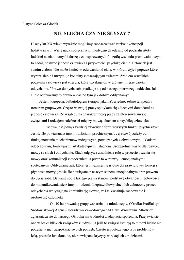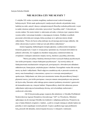 Justyna Solecka-Głodek NIE SŁUCHA CZY NIE SŁYSZY ? U schyłku XX wieku wyraźnie mogliśmy zaobserwować rozkwit koncepcji holistycznych. Wiele nauk społecznych i medycznych odeszło od podziału istoty ludzkiej na ciało ,umysł i duszę a zainspirowanych filozofią wschodu próbowało i czyni to nadal, dostrzec jedność człowieka i przywrócić "psychikę ciału". Człowiek jest swoim ciałem. Nie może istnieć w oderwaniu od ciała, w którym żyje i poprzez które wyraża siebie i utrzymuje kontakty z otaczającym światem. Źródłem wszelkich poczynań człowieka jest energia, którą uzyskuje on w głównej mierze dzięki oddychaniu. "Prawo do bycia sobą realizuje się od naszego pierwszego oddechu. Jak silnie odczuwamy to prawo widać po tym jak dobrze oddychamy" . Jestem logopedą, balbutologiem (terapia jąkania), a jednocześnie terapeutą i trenerem grupowym. Często w swojej pracy spotykam się z licznymi dowodami na jedność człowieka. Ze względu na charakter mojej pracy zainteresowałam się związkami i rodzajem zależności między mową, słuchem a psychiką człowieka. "Mowa jest jedną z bardziej złożonych form wyższych funkcji psychicznych. Jest ściśle powiązana z innym funkcjami psychicznym.". Jej rozwój zależy od funkcjonowania mechanizmów mózgowych, powiązanych z obwodowymi układami: oddechowym, fonacyjnym, artykulacyjnym i słuchem. Szczególnie ważne dla rozwoju mowy są słuch i oddychanie. Słuch odgrywa zasadniczą rolę w procesie uczenia się mowy oraz komunikacji z otoczeniem, a przez to w rozwoju emocjonalnym i społecznym. Oddychanie zaś, które jest niezmiernie istotne dla prawidłowej fonacji i płynności mowy, jest ściśle powiązane z naszym stanem emocjonalnym oraz prawem do bycia sobą. Dawanie sobie takiego prawa stanowi podstawę otwartości i gotowości do komunikowania się z innymi ludźmi. Nieprawidłowy słuch lub zaburzony proces oddychania wpływają na komunikację słowną, zaś ta kształtuje zachowanie i osobowość człowieka. Od 10 lat prowadzę grupy wsparcia dla młodzieży w Ośrodku Profilaktyki Środowiskowej Agencji Doradztwa Zawodowego "AD" we Wrocławiu. Młodzież zgłaszająca się do naszego Ośrodka ma trudności z adaptacją społeczną. Przejawia się ona w braku bliskich związków z ludźmi , a jeśli te związki istnieją to młodzi ludzie nie potrafią w nich zaspokajać swoich potrzeb. Często u podłoża tego typu problemów leżą, przeszłe lub aktualne, nierozwiązane kryzysy w relacjach z rodzicami. Charakteryzują ją również trudności w zaakceptowaniu samego siebie w roli młodego mężczyzny, młodej kobiety. W związku z powyższym nie są oni w stanie w pełni wyrażać siebie. Nic więc dziwnego, że w ich codziennym środowisku społecznym, jakim jest szkoła nie radzą sobie z wymaganiami szkolnymi oraz sytuacjami trudnymi na płaszczyźnie relacji z nauczycielami i rówieśnikami. Zaczęłam się zastanawiać czy w wyniku różnych doświadczeń życiowych jakie już zdobyli ci młodzi ludzie, nastąpiły jakieś zmiany w ich sposobie odbierania świata ( narząd słuchu)? I jak te zmiany, jeśli istnieją, wpływają na komunikację z innymi ludźmi? Odpowiedź na te pytania przyniosło mi zetknięcie się z koncepcją Alfreda Tomatisa, francuskiego audio-psycho-fonologa, za przyczyną profesor Andrei Jaworskiej. Aby wyjaśnić związki i zależności między psychiką i słuchem potrzebne jest krótkie wprowadzenie do tego tematu. Słuch jest jednym z pięciu zmysłów umożliwiających człowiekowi poznawanie i poszukiwanie tego, co jest mu potrzebne do zaspokajania swoich potrzeb. Dzięki słuchowi człowiek odbiera sygnały akustyczne, dzięki którym ocenia zjawiska z otaczającego świata. Istnieje bardzo duży wpływ sygnałów dźwiękowych na stan somatyczny i psychiczny człowieka, często bez udziału jego świadomości. Rodzaj dźwięków dochodzących do ucha może być przyczyną negatywnych lub pozytywnych stanów emocjonalnych człowieka. Dzięki funkcjonowaniu narządu słuchu jest możliwe czynne i bierne korzystanie z muzyki i śpiewu. Podobnie jak inne zmysły słuch musi być odpowiednio stymulowany, by się prawidłowo rozwijał. Brak stymulacji słuchowej może doprowadzić do zmian fizjologicznych , a nawet anatomicznych ucha. Słyszenie, słuchanie i wsłuchiwanie się to słowa o bardzo zbliżonym brzmieniu, znaczenie ich jednak nie jest tożsame. Słyszeć to "mieć słuch, odbierać wrażenia dźwiękowe, nie być głuchym, być zdolnym do słuchania". Inaczej można powiedzieć, że słyszenie to fizjologiczna zdolność odbierania dźwięków z otoczenia. Słuchanie to jakby drugi stopień słyszenia. Słuchać to "świadomie odbierać wrażenia dźwiękowe; zwracać uwagę na to, co się słyszy; starać się usłyszeć coś; odbierać i rozumieć czyjąś wypowiedź". Analizując tą definicję łatwo dostrzec, że podkreśla ona udział świadomości i woli w słuchaniu jak również rozkodowanie symboli. Wsłuchiwanie się to "słuchanie uważnie i w skupieniu". Jest to trzeci stopień odbierania wrażeń dźwiękowych, a od słuchania różni się jakościowo. Jest nacechowany większą koncentracją i zaangażowaniem emocjonalnym. Wsłuchiwanie się wymaga mobilizacji całego systemu nerwowego łącznie z ciałem i umysłem, gotowości do słuchania świata zewnętrznego, innych ludzi i samego siebie. Słuchanie, wsłuchiwanie się są zależne od postawy ciała. Postawa ta decyduje o jakości słyszenia, jak również o dobrej emisji głosu. Postawa wyprostowana, rozluźniona umożliwia głębokie oddychanie i swobodny przepływ powietrza[energii]. Wszelkie napięcia mięśniowe utrudniają lub wręcz uniemożliwiają właściwą emisję głosu i wsłuchiwanie się. Mówiąc o słuchu i jego roli, należy wspomnieć o tym, że Tomatis stwierdził, iż nie słyszymy jednakowo na obydwa ucha. Wynika to z faktu, że każde ucho reprezent