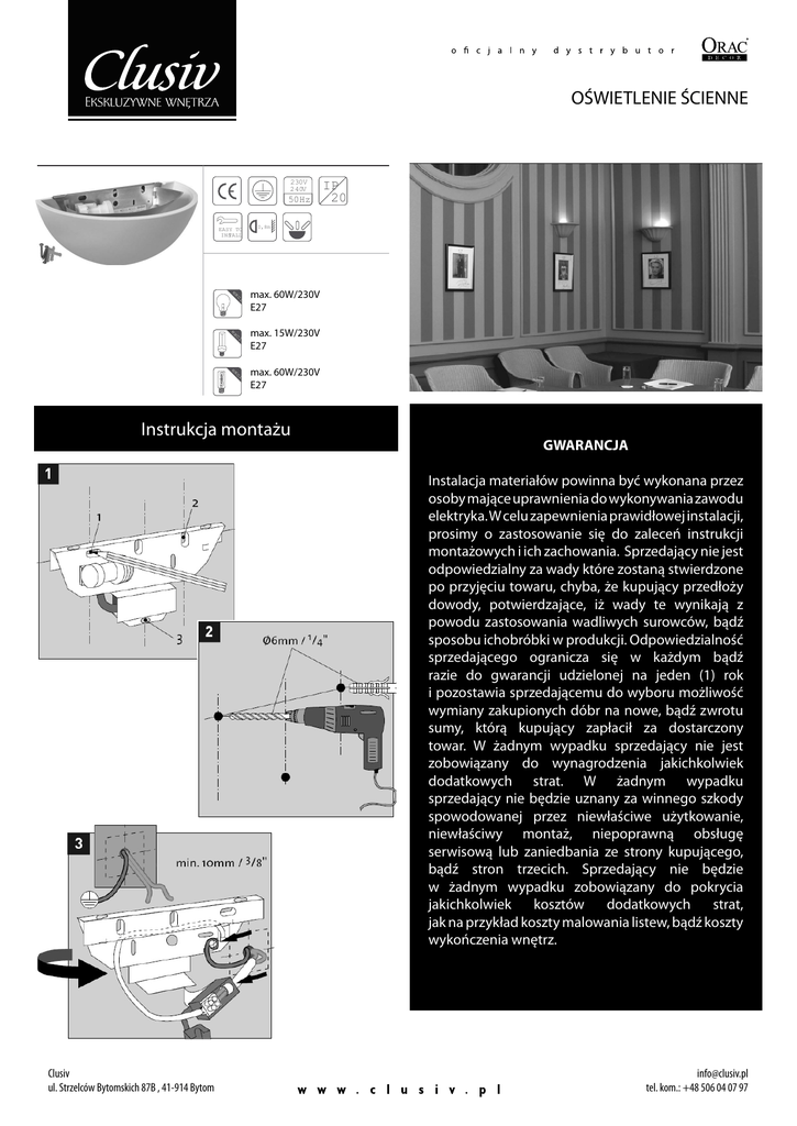 OŚWIETLENIE ŚCIENNE 230V 240V 50Hz EASY TO INSTALL IP 20 0,8m cl ex max. 60W/230V E27 cl ex max. 15W/230V E27 cl ex max. 60W/230V E27 Instrukcja montażu GWARANCJA Instalacja materiałów powinna być wykonana przez osoby mające uprawnienia do wykonywania zawodu elektryka. W celu zapewnienia prawidłowej instalacji, prosimy o zastosowanie się do zaleceń instrukcji montażowych i ich zachowania. Sprzedający nie jest odpowiedzialny za wady które zostaną stwierdzone po przyjęciu towaru, chyba, że kupujący przedłoży dowody, potwierdzające, iż wady te wynikają z powodu zastosowania wadliwych surowców, bądź sposobu ichobróbki w produkcji. Odpowiedzialność sprzedającego ogranicza się w każdym bądź razie do gwarancji udzielonej na jeden (1) rok i pozostawia sprzedającemu do wyboru możliwość wymiany zakupionych dóbr na nowe, bądź zwrotu sumy, którą kupujący zapłacił za dostarczony towar. W żadnym wypadku sprzedający nie jest zobowiązany do wynagrodzenia jakichkolwiek dodatkowych strat. W żadnym wypadku sprzedający nie będzie uznany za winnego szkody spowodowanej przez niewłaściwe użytkowanie, niewłaściwy montaż, niepoprawną obsługę serwisową lub zaniedbania ze strony kupującego, bądź stron trzecich. Sprzedający nie będzie w żadnym wypadku zobowiązany do pokrycia jakichkolwiek kosztów dodatkowych strat, jak na przykład koszty malowania listew, bądź koszty wykończenia wnętrz. Clusiv ul. Strzelców Bytomskich 87B , 41-914 Bytom [email protected] tel. kom.: +48 506 04 07 97 OŚWIETLENIE ŚCIENNE Clusiv ul. Strzelców Bytomskich 87B , 41-914 Bytom [email protected] tel. kom.: +48 506 04 07 97