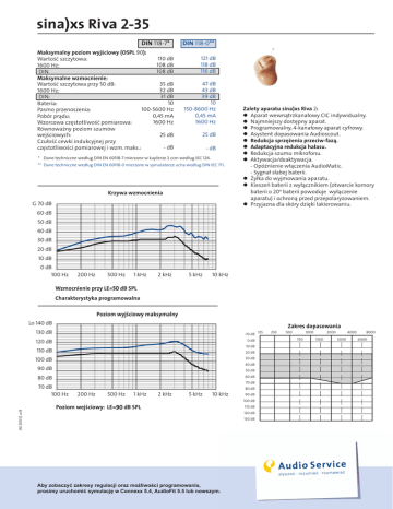 sina)xs Riva 2-35 DIN 118-7* Maksymalny poziom wyjściowy (OSPL 90): 110 dB Wartość szczytowa: 108 dB 1600 Hz: 108 dB DIN Maksymalne wzmocnienie: 35 dB Wartość szczytowa przy 50 dB: 32 dB 1600 Hz: 31 dB DIN: 10 Bateria: 100-5600 Hz Pasmo przenoszenia: 0,45 mA Pobór prądu: 1600 Hz Wzorcowa częstotliwość pomiarowa: Równoważny poziom szumów 25 dB wejściowych: Czułość cewki indukcyjnej przy - dB częstotliwości pomiarowej i wzm. maks.: DIN 118-0** 121 dB 118 dB 116 dB 47 dB 43 dB 39 dB 10 150-8600 Hz 0,45 mA 1600 Hz 25 dB - dB * Dane techniczne według DIN EN 60118-7 mierzone w kuplerze 2 ccm według IEC 126. ** Dane techniczne według DIN EN 60118-0 mierzone w symulatorze ucha według DIN IEC 711. Krzywa wzmocnienia G 70 dB Zalety aparatu sina)xs Riva 2: Aparat wewnątrzkanałowy CIC indywidualny. Najmniejszy dostępny aparat. Programowalny, 4-kanałowy aparat cyfrowy. Asystent dopasowania Audioscout. Redukcja sprzężenia przeciw-fazą. Adaptacyjna redukcja hałasu. Redukcja szumu mikrofonu. Aktywacja/deaktywacja. - Opóźnienie włączenia AudioMatic. - Sygnał słabej baterii. Żyłka do wyjmowania aparatu. Kieszeń baterii z wyłącznikiem (otwarcie komory baterii o 20o baterii powoduje wyłączenie aparatu) i ochroną przed przepolaryzowaniem. Przyjazna dla skóry dzięki lakierowaniu. 60 dB 50 dB 40 dB 30 dB 20 dB 10 dB 0 dB 100 Hz 200 Hz 500 Hz 1 kHz 2 kHz 5 kHz 10 kHz 50 dB SPL Wzmocnienie przy LE=50 Charakterystyka programowalna Poziom wyjściowy maksymalny Lo 140 dB Zakres dopasowania 130 dB -10 dB 0 dB 120 dB 10 dB 110 dB 20 dB 100 dB 30 dB 40 dB 90 dB 50 dB 60 dB 80 dB 70 dB 100 Hz 70 dB 80 dB 200 Hz 500 Hz 1 kHz 2 kHz 5 kHz 10 kHz 90 dB JM 20032 a/8 100 dB 90 dB SPL Poziom wejściowy: LE=90 110 dB 120 dB 130 dB Aby zobaczyæ zakresy regulacji oraz mo¿liwoœci programowania, prosimy uruchomiæ symulacjê w Connexx 5.4, AudioFit 5.5 lub nowszym. 125 250 500 1000 750 2000 1500 4000 3000 8000 6000