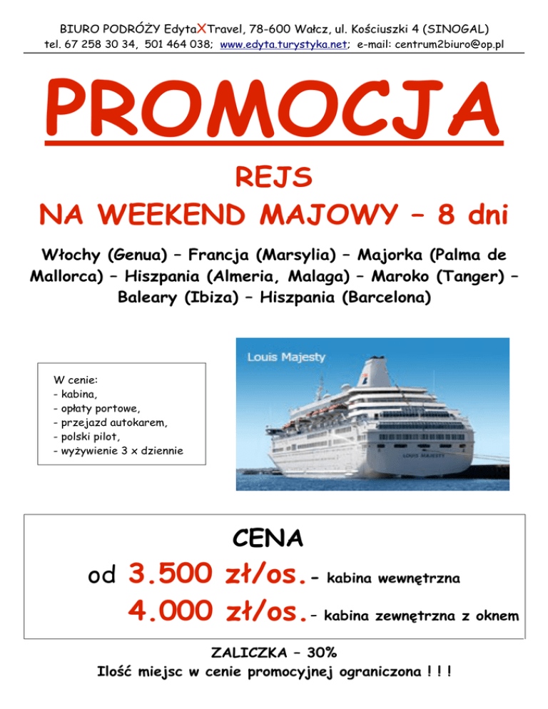 BIURO PODRÓŻY EdytaXTravel, 78-600 Wałcz, ul. Kościuszki 4 (SINOGAL) tel. 67 258 30 34, 501 464 038; www.edyta.turystyka.net; e-mail: [email protected] PROMOCJA REJS NA WEEKEND MAJOWY – 8 dni Włochy (Genua) – Francja (Marsylia) – Majorka (Palma de Mallorca) – Hiszpania (Almeria, Malaga) – Maroko (Tanger) – Baleary (Ibiza) – Hiszpania (Barcelona) W cenie: - kabina, - opłaty portowe, - przejazd autokarem, - polski pilot, - wyżywienie 3 x dziennie CENA od 3.500 zł/os.- kabina wewnętrzna 4.000 zł/os.- kabina zewnętrzna z oknem ZALICZKA – 30% Ilość miejsc w cenie promocyjnej ograniczona ! ! !