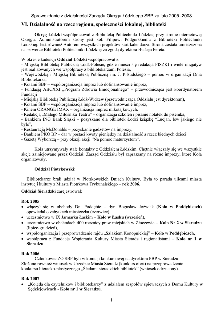 Sprawozdanie z działalności Zarządu Okręgu Łódzkiego SBP za lata 2005 -2008 VI. Działalność na rzecz regionu, społeczności lokalnej, biblioteki Okręg Łódzki współpracował z Biblioteką Politechniki Łódzkiej przy stronie internetowej Okręgu. Administratorem strony jest kol. Filipowi Podgórskiemu z Biblioteki Politechniki Łódzkiej. Jest również Autorem wszystkich projektów kart kalendarza. Strona została umieszczona na serwerze Biblioteki Politechniki Łódzkiej za zgodą dyrektora Błażeja Fereta. W okresie kadencji Oddział Łódzki współpracował z: - Miejską Biblioteką Publiczną Łódź-Polesie, gdzie mieści się redakcja FISZKI i wiele inicjatyw jest realizowanych we współpracy z bibliotekarzami Polesia, - Wojewódzką i Miejską Biblioteką Publiczną im. J. Piłsudskiego – pomoc w organizacji Dnia Bibliotekarza, - Kołami SBP – współorganizacja imprez lub dofinansowanie imprez, - Fundacją ABCXXI „Program Zdrowia Emocjonalnego” – przewodnicząca jest koordynatorem Fundacji - Miejską Biblioteką Publiczną Łódź-Widzew (przewodnicząca Oddziału jest dyrektorem), - Kołami SBP – współorganizacja imprez lub dofinansowanie imprez, - Kinem ORANGE IMAX – organizacja imprez mikołajkowych. - Redakcją „Małego Miłośnika Teatru” – organizacja szkoleń i pisanie notatek do pisemka, - Bankiem ING Bank Śląski – pozyskano dla bibliotek Łodzi książkę “Lucjan, lew jakiego nie było”, - Restauracją McDonalds – pozyskanie gadżetów na imprezy, - Bankiem PKO BP – dar w postaci kwoty pieniędzy na działalność a rzecz biednych dzieci - Gazetą Wyborczą – przy okazji akcji “Na pomoc maturzystom”. Koła utrzymywały stałe kontakty z Oddziałem Łódzkim. Chętnie włączały się we wszystkie akcje zainicjowane przez Oddział. Zarząd Oddziału był zapraszany na różne imprezy, które Koła organizowały. Oddział Piotrkowski: Bibliotekarze brali udział w Piotrkowskich Dniach Kultury. Była to parada ulicami miasta instytucji kultury z Miasta Piotrkowa Trybunalskiego – rok 2006. Oddział Sieradzki zarejestrował: Rok 2005 • włączył się w obchody Dni Poddębic – dyr. Bogusław Jóźwiak (Koło w Poddębicach) opowiadał o zabytkach miasteczka (czerwiec), • uczestnictwo w IX Jarmarku Łaskim – Koło w Łasku (wrzesień), • uczestnictwo w obchodach 400 rocznicy praw miejskich w Złoczewie – Koło Nr 2 w Sieradzu (lipiec-grudzień), • współorganizacja i przeprowadzenie rajdu „Szlakiem Konopnickiej” – Koło w Poddębicach, • współpraca z Fundacją Wspierania Kultury Miasta Sieradz i regionalistami – Koło nr 1 w Sieradzu. Rok 2006 Członkowie ZO SBP byli w komisji konkursowej na dyrektora PBP w Sieradzu Złożono również wniosek w Urzędzie Miasta Sieradz (konkurs ofert) na przeprowadzenie konkursu literacko-plastycznego „Śladami sieradzkich bibliotek” (wniosek odrzucony). Rok 2007 • „Kolęda dla czytelników i bibliotekarzy” z udziałem zespołów śpiewaczych z Domu Kultury w Sędziejowicach - Koło nr 1 w Sieradzu. 1 Sprawozdanie z działalności Zarządu Okręgu Łódzkiego SBP za lata 2005 -2008 • • • • • • • • • • • Uczestniczono w akcji „Hospicjum to też człowiek” organizowanej przez wolontariuszy z Sieradzkiego Hospicjum – Koło nr 1 w Sieradzu. Jasełka w wykonaniu studentów z Kolegium Nauczycielskiego w Wieluniu – przy współpracy z kołem SBP w Wieluniu. Koncert wiosenny pt. Od Lutosławskiego do Bacha w wykonaniu studentek Akademii Muzycznej im. K. Szymanowskiego w Katowicach - Koło w Wieluniu. Spotkanie z ludową artystką Wandą Majtyką z Wielunia dla grupy uczestniczącej w zajęciach Miejsko-Gminnego Ośrodka Pomocy Społecznej – Koło w Wieluniu. Dla lokalnej społeczności koło SBP w Łasku zorganizowało 3 wyjazdy do kina i teatru. Koło SBP w Łasku kontynuuje współpracę z instytucjami i organizacjami wspierającym bibliotekę m.in. Towarzystwem Przyjaciół Ziemi Łaskiej. Jak co roku Koło SBP w Poddębicach włączyło się do obchodów „Dni Poddębic”. Członkowie SBP uczestniczyli w organizacji i przeprowadzeniu Turnieju Jednego Wiersza. Koło SBP było współorganizatorem VIII edycji konkursu poetyckiego „Z łąk i pól”. Podsumowanie konkursu odbyło się 10 października 2007 roku. Poza tym Oddział Sieradzki na wniosek Starostwa Powiatu Poddębickiego opracował opinię nt. pana Przemysława Jaszczaka, starającego się o zatrudnienie na stanowisku dyrektora Powiatowej Biblioteki Publicznej w Poddębicach na czas nieokreślony. Zarząd Oddziału zaopiniował merytorycznie Regulamin i Schemat Organizacyjny Powiatowej Biblioteki Publicznej w Poddębicach – na prośbę dyr. Jaszczaka ( wysłano 24 października). Zarząd Oddziału z zarządami kół nr 1 i nr 2 w Sieradzu zorganizował spotkanie z przewodniczącą Zarządu Głównego SBP i wicedyrektorem Biblioteki Narodowej Elżbietą Stefańczyk. Zarząd Oddziału rozpropagował propozycję Zarządu Okręgu SBP w Łodzi wydania Kalendarza Bibliotekarza. W tej inicjatywie wzięły udział koła nr 1 i nr 2 w Sieradzu (fotografie PBP w Sieradzu i MiGBP w Złoczewie) oraz koło w Poddębicach. W pracach komisji konkursowej uczestniczyła Grażyna Łacina. Rok 2008 Zbierano książki dla Wilna na prośbę Chełmskiej Biblioteki Publicznej i Zarządu Okręgu Łódzkiego. Zebrano ponad 60 książek. Koło w Wieluniu zebrało 110 książek i wysłało bezpośrednio do Chełma. Oddział Skierniewicki: Członkowie Oddziału włączyli się w organizację tradycyjnego Skierniewickiego Święta Kwiatów, Owoców i Warzyw. Przygotowywano stoiska eksponujące dorobek poszczególnych gmin. 2