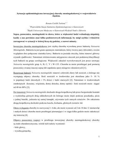 Sytuacja epidemiologiczna inwazyjnej choroby meningokokowej w województwie śląskim. Renata Cieślik Tarkota1, 2 1 Wojewódzka Stacja Sanitarno-Epidemiologiczna w Katowicach Śląski Uniwersytet Medyczny w Katowicach Wydział Nauk o Zdrowiu 2 Sepsa, posocznica, meningokoki to słowa, które u większości ludzi wzbudzają niepokój, każdy z nas powinien znać kilka podstawowych informacji, by mógł szybko i właściwie zareagować w sytuacji w której liczą się godziny, a nawet minuty. Inwazyjna choroba meningokokowa jest ciężką chorobą wywołaną przez bakterię Neisseria Meningitidis. Bakteria ta jest gram-ujemnym ziarniakiem, który tworzy pary (dwoinki), swoim wyglądem dwa połączone ziarenka kawy. Bakteria ta posiada otoczkę, która stanowi główny czynnik zjadliwości. Natomiast zróżnicowanie antygenowe otoczek jest podstawą klasyfikacji tych bakterii na grupy serologiczne. Większość zakażeń wywoływanych jest przez serotypy Neisseria meningitidis grup A, B, C, Y i W-135. Choroba ta może przebiegać pod postacią posocznicy zwanej inaczej sepsą lub zapalenia opon mózgowo rdzeniowych [1]. Rezerwuar bakterii Neisseria meningitidis stanowi człowiek chory lub nosiciel, u którego nie występują objawy choroby. Ilość nosicieli w środowisku jest określana jako 5- 10 % w populacji ludzi dorosłych i 1% dzieci i ludzi starszych [2]. Natomiast w środowiskach zamkniętych (koszary, więzienia, domy dziecka, domy opieki) ilość nosicieli może sięgać od 40 do 80% [3]. Do transmisji Neisseria meningitidis dochodzi droga kropelkową lub przez bezpośredni kontakt z wydzieliną górnych dróg oddechowych do którego może dojść podczas pocałunku, picia z jednej butelki, jedzenia tej samej kanapki, używania tych samych sztućców. Do zakażenia drogą kropelkową dochodzi podczas kaszlu, kichania, głośnych rozmów itd. Okres wylęgania choroby to zazwyczaj 3- 4 dni, ale może wynosić od 2 do 10 dni. U niemowląt i małych dzieci choroba może przebiegać piorunująco i w ciągu kilku godzin może zakończyć się śmiercią [4]. Objawy posocznicy (sepsy) w przebiegu inwazyjnej choroby meningokokowej choroby są mało charakterystyczne, wśród nich należy wymienić: - bóle głowy, - wysoką gorączkę, 1 - dreszcze, - nadmierne pocenie się, - spadek ciśnienia krwi, - zimne dłonie i stopy, - bladość skóry, - bóle w okolicach lędźwi (wylewy do nadnerczy), - na skórze pojawiają się wybroczyny skórne, które mogą przechodzić w większe zmiany krwotoczne, jednakże objaw ten pojawiają się u około 10- 50% chorych. Przy zmianach skórnych warto przeprowadzić test przy użyciu szklanki: bok szklanki przykładamy do zmian skórnych i obserwujemy czy bledną. W sytuacji gdy zmiany wysypkowe nie bledną, można podejrzewać, że jest to wysypka krwotoczna występująca w przebiegu inwazyjnej choroby meningokokowej [2, 4]. Objawy zapalenia opon mózgowo rdzeniowych to: - objawy oponowe (silne bóle głowy, sztywność karku, światłowstręt) - wysoka gorączka, - pobudzenie psychoruchowe, - zaburzenia świadomości, przeczulica, - objaw Kerniga, objaw Brudzińskiego (przy przygięciu głowy do klatki piersiowej następuje zgięcie kończyn dolnych w stawach), - karkowo- midriatyczny Flataua (przy biernym pochyleniu głowy do przodu dochodzi do rozszerzenia źrenic) [1, 5]. Postępowanie w przypadku podejrzenia inwazyjnej choroby meningokokowej z uwagi na jej bardzo piorunujący przebieg, polega na jak najszybszym kontakcie z lekarzem (pogotowie, szpitalny oddział ratunkowy, izba przyjęć szpitala, lekarz). Lekarz, który będzie podejrzewał chorobę, natychmiast podejmie działanie zmierzające do diagnostyki i wdroży natychmiastowe leczenie. Osobom z otoczenia zalecane jest ograniczenie kontaktów do absolutnego minimum z uwagi na możliwość zakażenia oraz w przypadku ryzyka zakażenia, podanie profilaktyczne antybiotyku po konsultacji z lekarzem. Każda osoba z kontaktu z chorym na IChM musi być jak najszybciej skonsultowana przez lekarza, celem rozważenia konieczności podania chemioprofilaktyki [4, 6]. Powikłania to między innymi martwica, która występuje w miejscach krwawych wylewów i zmian wybroczynowych w skórze i narządach wewnętrznych. Rozległa martwica w obrębie 2 kończyn górnych i dolnych może skutkować koniecznością amputacji. Wśród innych powikłań należy wymienić reaktywne zapalenie stawów, zapalenie błon surowiczych (w tym wysięki do jamy osierdziowej w sercu i jamy opłucnej), głuchotę i uszkodzenie nerwów czaszkowych [7]. Leczeniem z wyboru pozostaje zastosowanie antybiotyków z grupy penicylin oraz leczenie objawowe. Inwazyjna choroba meningokokowa jest zagrożeniem życia, w którym ważna jest każda minuta, dlatego też leczenie antybiotykiem musi być wdrożone jak najszybciej. Im szybciej wdrożone leczenie tym większa szansa na wyleczenie i mniejsze ryzyko powikłań [4]. Profilaktyka swoista polega na uodpornieniu osób przy zastosowaniu dostępnych szczepionek. W Polsce są dostępne preparaty szczepionkowe uodparniające przeciwko meningokokom wszystkich najczęściej wywołujących chorobę serotypów meningokoków. Do tej pory zarejestrowano preparaty szczepionkowe uodparniające przeciwko meningokom: - grupy B, - grupy C, - grupy A+ C, - grup A, C, W-135, Y. Uodpornienie przeciwko meningokokom można już rozpocząć po ukończeniu 1 miesiąca życia dziecka (przeciwko meningokokom grupy B) lub 2 miesiąca życia (przeciwko meningokokom grup A, C, W-135, Y). Sczepienia te oczywiście mogą być wykonywane również u osób dorosłych. W związku z tym, iż dostępnych jest kilka preparatów szczepionkowych należy podczas planowania tej formy profilaktyki lekarz dokona doboru właściwych preparatów szczepionkowych [8]. Profilaktyka nieswoista polega na zachowaniu właściwej higieny, która zmniejsza ryzyko zachorowania na inwazyjną chorobę meningokokową. Należy unikać nas