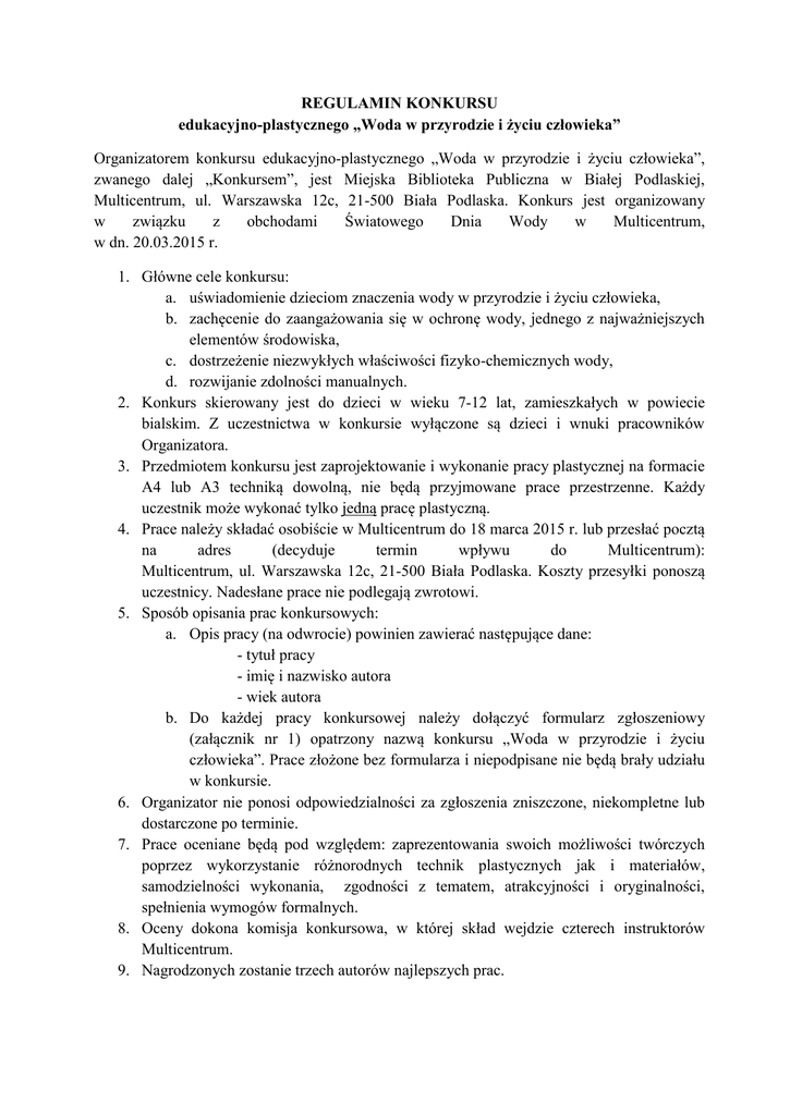 REGULAMIN KONKURSU edukacyjno-plastycznego „Woda w przyrodzie i życiu człowieka” Organizatorem konkursu edukacyjno-plastycznego „Woda w przyrodzie i życiu człowieka”, zwanego dalej „Konkursem”, jest Miejska Biblioteka Publiczna w Białej Podlaskiej, Multicentrum, ul. Warszawska 12c, 21-500 Biała Podlaska. Konkurs jest organizowany w związku z obchodami Światowego Dnia Wody w Multicentrum, w dn. 20.03.2015 r. 1. Główne cele konkursu: a. uświadomienie dzieciom znaczenia wody w przyrodzie i życiu człowieka, b. zachęcenie do zaangażowania się w ochronę wody, jednego z najważniejszych elementów środowiska, c. dostrzeżenie niezwykłych właściwości fizyko-chemicznych wody, d. rozwijanie zdolności manualnych. 2. Konkurs skierowany jest do dzieci w wieku 7-12 lat, zamieszkałych w powiecie bialskim. Z uczestnictwa w konkursie wyłączone są dzieci i wnuki pracowników Organizatora. 3. Przedmiotem konkursu jest zaprojektowanie i wykonanie pracy plastycznej na formacie A4 lub A3 techniką dowolną, nie będą przyjmowane prace przestrzenne. Każdy uczestnik może wykonać tylko jedną pracę plastyczną. 4. Prace należy składać osobiście w Multicentrum do 18 marca 2015 r. lub przesłać pocztą na adres (decyduje termin wpływu do Multicentrum): Multicentrum, ul. Warszawska 12c, 21-500 Biała Podlaska. Koszty przesyłki ponoszą uczestnicy. Nadesłane prace nie podlegają zwrotowi. 5. Sposób opisania prac konkursowych: a. Opis pracy (na odwrocie) powinien zawierać następujące dane: - tytuł pracy - imię i nazwisko autora - wiek autora b. Do każdej pracy konkursowej należy dołączyć formularz zgłoszeniowy (załącznik nr 1) opatrzony nazwą konkursu „Woda w przyrodzie i życiu człowieka”. Prace złożone bez formularza i niepodpisane nie będą brały udziału w konkursie. 6. Organizator nie ponosi odpowiedzialności za zgłoszenia zniszczone, niekompletne lub dostarczone po terminie. 7. Prace oceniane będą pod względem: zaprezentowania swoich możliwości twórczych poprzez wykorzystanie różnorodnych technik plastycznych jak i materiałów, samodzielności wykonania, zgodności z tematem, atrakcyjności i oryginalności, spełnienia wymogów formalnych. 8. Oceny dokona komisja konkursowa, w której skład wejdzie czterech instruktorów Multicentrum. 9. Nagrodzonych zostanie trzech autorów najlepszych prac. 10. Ogłoszenie wyników konkursu nastąpi 20.03.2015 r. o godz. 16.00 podczas zajęć edukacyjnych organizowanych przez Multicentrum z okazji Światowego Dnia Wody. Nagrodzone prace zostaną w tym dniu zaprezentowane uczestnikom zajęć. Lista laureatów wraz ze zdjęciami ich prac zostanie zamieszczona na stronie www.multicentrum.mbp.org.pl. 11. Laureaci w nagrodę otrzymają dyplomy oraz nagrody rzeczowe. 12. Przekazanie prac konkursowych jest równoznaczne z: a. udzieleniem Organizatorowi zgody na nieodpłatne wykorzystanie w/w prac bezterminowo, bez żadnych ograniczeń terytorialnych na wszystkich polach eksploatacji, o których mowa w art. 50 Ustawy z dnia 4 lutego 1994 roku o prawie autorskim i prawach pokrewnych (Dz. U. Z 2000 r., Nr 80, poz. 904 z późniejszymi zmianami). b. ze zrzeczeniem się praw autorskich do swoich prac na rzecz Organizatora Konkursu. Organizator nie bierze na siebie odpowiedzialności za niezgodne z prawem wykorzystanie przez Uczestników złożonej pracy konkursowej cudzej własności intelektualnej. 13. Regulamin Konkursu oraz formularz zgłoszeniowy dostępne są na stronie: www.multicentrum.mbp.org.pl. Szczegółowych informacji na temat konkursu udziela Multicentrum, tel. 83 341-60-17, e-mail: [email protected]. 14. Organizator Konkursu zastrzega sobie prawo do zmiany czasu trwania Konkursu i warunków udziału w Konkursie oraz do jego odwołania bez podania przyczyny. 15. W sprawach nieuregulowanych w niniejszym Regulaminie rozstrzyga Organizator. 16. Złożenie prac na Konkurs oznacza akceptację jego warunków, wyrażonych w niniejszym Regulaminie.