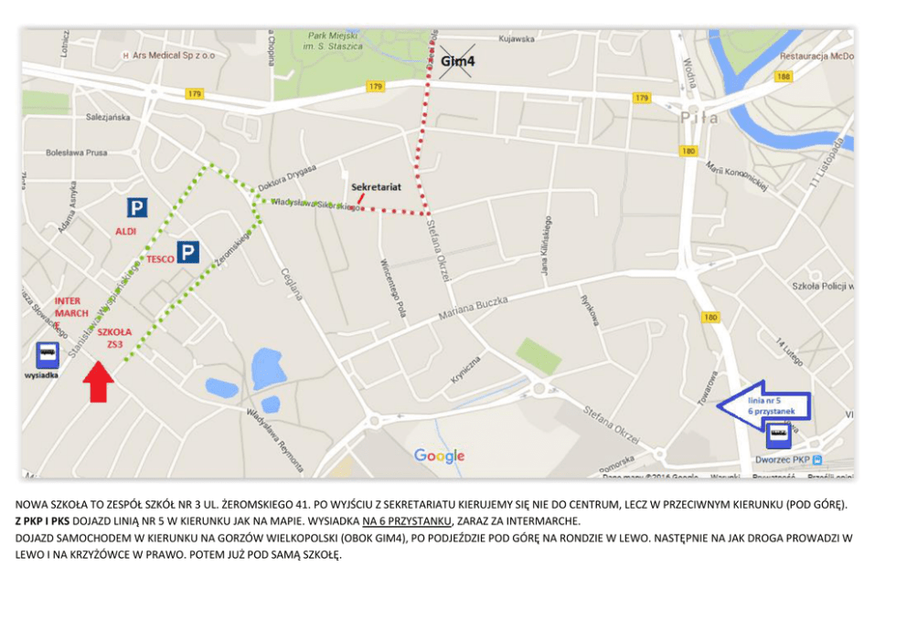 NOWA SZKOŁA TO ZESPÓŁ SZKÓŁ NR 3 UL. ŻEROMSKIEGO 41. PO WYJŚCIU Z SEKRETARIATU KIERUJEMY SIĘ NIE DO CENTRUM, LECZ W PRZECIWNYM KIERUNKU (POD GÓRĘ). Z PKP I PKS DOJAZD LINIĄ NR 5 W KIERUNKU JAK NA MAPIE. WYSIADKA NA 6 PRZYSTANKU, ZARAZ ZA INTERMARCHE. DOJAZD SAMOCHODEM W KIERUNKU NA GORZÓW WIELKOPOLSKI (OBOK GIM4), PO PODJEŹDZIE POD GÓRĘ NA RONDZIE W LEWO. NASTĘPNIE NA JAK DROGA PROWADZI W LEWO I NA KRZYŻÓWCE W PRAWO. POTEM JUŻ POD SAMĄ SZKOŁĘ.