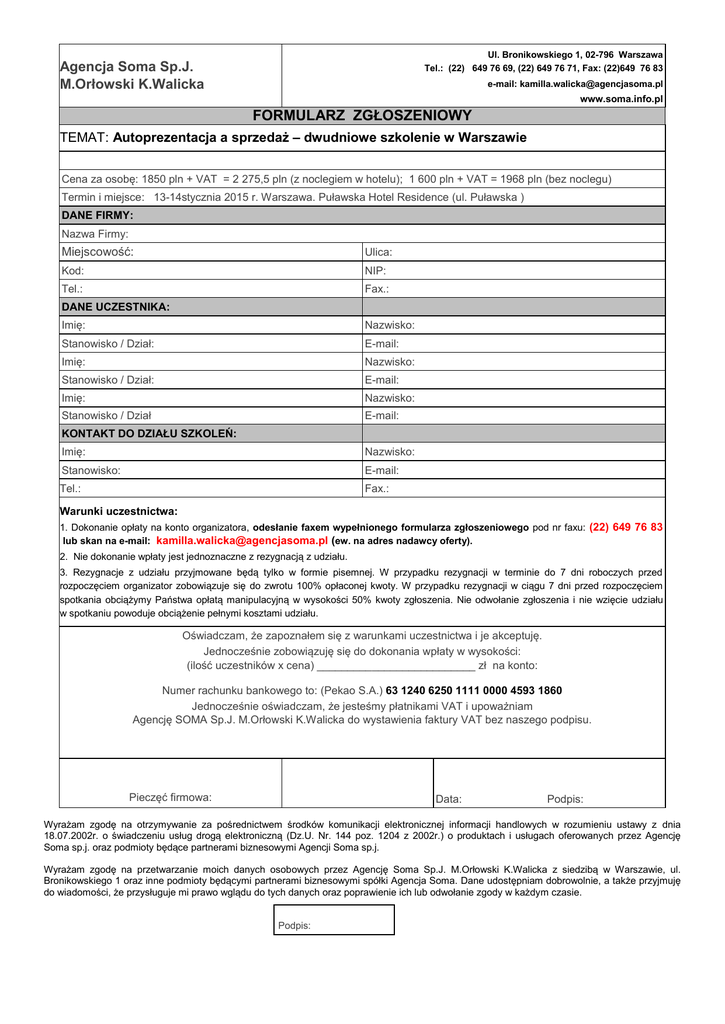 Ul. Bronikowskiego 1, 02-796 Warszawa Tel.: (22) 649 76 69, (22) 649 76 71, Fax: (22)649 76 83 Agencja Soma Sp.J. M.Orłowski K.Walicka e-mail: [email protected] www.soma.info.pl FORMULARZ ZGŁOSZENIOWY TEMAT: Autoprezentacja a sprzedaż – dwudniowe szkolenie w Warszawie Cena za osobę: 1850 pln + VAT = 2 275,5 pln (z noclegiem w hotelu); 1 600 pln + VAT = 1968 pln (bez noclegu) Termin i miejsce: 13-14stycznia 2015 r. Warszawa. Puławska Hotel Residence (ul. Puławska ) DANE FIRMY: Nazwa Firmy: Miejscowość: Ulica: Kod: NIP: Tel.: Fax.: DANE UCZESTNIKA: Imię: Nazwisko: Stanowisko / Dział: E-mail: Imię: Nazwisko: Stanowisko / Dział: E-mail: Imię: Nazwisko: Stanowisko / Dział E-mail: KONTAKT DO DZIAŁU SZKOLEŃ: Imię: Nazwisko: Stanowisko: E-mail: Tel.: Fax.: Warunki uczestnictwa: 1. Dokonanie opłaty na konto organizatora, odesłanie faxem wypełnionego formularza zgłoszeniowego pod nr faxu: (22) 649 76 83 lub skan na e-mail: [email protected] (ew. na adres nadawcy oferty). 2. Nie dokonanie wpłaty jest jednoznaczne z rezygnacją z udziału. 3. Rezygnacje z udziału przyjmowane będą tylko w formie pisemnej. W przypadku rezygnacji w terminie do 7 dni roboczych przed rozpoczęciem organizator zobowiązuje się do zwrotu 100% opłaconej kwoty. W przypadku rezygnacji w ciągu 7 dni przed rozpoczęciem spotkania obciążymy Państwa opłatą manipulacyjną w wysokości 50% kwoty zgłoszenia. Nie odwołanie zgłoszenia i nie wzięcie udziału w spotkaniu powoduje obciążenie pełnymi kosztami udziału. Oświadczam, że zapoznałem się z warunkami uczestnictwa i je akceptuję. Jednocześnie zobowiązuję się do dokonania wpłaty w wysokości: (ilość uczestników x cena) __________________________ zł na konto: Numer rachunku bankowego to: (Pekao S.A.) 63 1240 6250 1111 0000 4593 1860 Jednocześnie oświadczam, że jesteśmy płatnikami VAT i upoważniam Agencję SOMA Sp.J. M.Orłowski K.Walicka do wystawienia faktury VAT bez naszego podpisu. Pieczęć firmowa: Data: Podpis: Wyrażam zgodę na otrzymywanie za pośrednictwem środków komunikacji elektronicznej informacji handlowych w rozumieniu ustawy z dnia 18.07.2002r. o świadczeniu usług drogą elektroniczną (Dz.U. Nr. 144 poz. 1204 z 2002r.) o produktach i usługach oferowanych przez Agencję Soma sp.j. oraz podmioty będące partnerami biznesowymi Agencji Soma sp.j. Wyrażam zgodę na przetwarzanie moich danych osobowych przez Agencję Soma Sp.J. M.Orłowski K.Walicka z siedzibą w Warszawie, ul. Bronikowskiego 1 oraz inne podmioty będącymi partnerami biznesowymi spółki Agencja Soma. Dane udostępniam dobrowolnie, a także przyjmuję do wiadomości, że przysługuje mi prawo wglądu do tych danych oraz poprawienie ich lub odwołanie zgody w każdym czasie. Podpis: