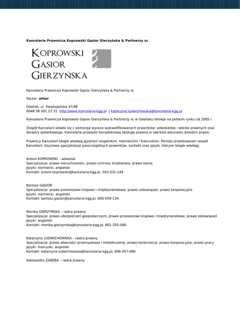 Kancelaria Prawnicza Koprowski Gąsior Gierzyńska & Partnerzy sc Kancelaria Prawnicza Koprowski Gąsior Gierzyńska & Partnerzy sc Sector: other Gdańsk, ul. Świętojańska 47/48 0048 58 301 23 31 http://www.kancelaria-kgg.pl | [email protected] Kancelaria Prawnicza Koprowski Gąsior Gierzyńska & Partnerzy sc w Gdańsku istnieje na polskim rynku od 2005 r. Zespół Kancelarii składa się z ośmiorga wysoce wykwalifikowanych prawników: adwokatów, radców prawnych oraz doradcy podatkowego. Kancelaria prowadzi kompleksową obsługę prawną w zakresie dwunastu dziedzin prawa. Prawnicy Kancelarii biegle władają językiem angielskim, niemieckim i francuskim. Poniżej przedstawiam zespół Kancelarii, kluczowe specjalizacje poszczególnych prawników, kontakt oraz języki, którymi biegle władają. Antoni KOPROWSKI – adwokat Specjalizacje: prawo nieruchomości, prawo ochrony środowiska, prawo karne Języki: niemiecki, angielski Kontakt: [email protected], 502-031-149 Bartosz GĄSIOR Specjalizacje: prawo przewozowe krajowe i międzynarodowe, prawo zobowiązań, prawo korporacyjne Języki: niemiecki, angielski Kontakt: [email protected], 600-059-134 Monika GIERZYŃSKA – radca prawny Specjalizacje: prawo ubezpieczeń gospodarczych, prawo przewozowe krajowe i międzynarodowe, prawo zobowiązań Języki: angielski Kontakt: [email protected], 601-255-566 Katarzyna LUDWICHOWSKA – radca prawny Specjalizacje: prawo własności przemysłowej i intelektualnej, prawo konkurencji, prawo korporacyjne, prawo pracy Języki: francuski, angielski Kontakt: [email protected], 606-457-080 Aleksandra ZARĘBA – radca prawny Specjalizacje: prawo zobowiązań, prawo korporacyjne, prawo mieszkaniowe Języki: angielski Kontakt: [email protected], 609-385-100 Piotr GELIŃSKI – doradca podatkowy Specjalizacje: prawo podatkowe Języki: angielski Kontakt: [email protected], 502-944-780 Michał KOZIOROWSKI- adwokat Specjalizacje: prawo zobowiązań, prawo karne skarbowe Języki: angielski Kontakt: [email protected], 601-679-262 Małgorzata GORCZYŃSKA – ROLKA – adwokat Specjalizacje: prawo autorskie, prawo zamówień publicznych, prawo karne Języki: angielski Kontakt: [email protected], 668-679-952 II. Obsługa prawna Inwestora W ramach wsparcia COI dla Inwestora świadczonego przez Invest in Pomerania, Kancelaria deklaruje specjalistyczną pomoc poprzez udzielanie informacji prawnych przy obsługiwanych projektach inwestycyjnych. Zakres usług Kancelarii obejmuje w szczególności: • opiniowanie oraz sporządzania umów; • opracowywanie opinii prawnych; • bieżące doradztwo prawne w formie ustnych konsultacji; • zastępstwo prawne przed organami administracji publicznej i samorządowej; • sporządzanie raportów due diligence spółek i nieruchomości, czyli analiza ryzyk prawnych związanych z nabyciem określonej spółki prawa handlowego, czy też nieruchomości; • przeprowadzanie szkoleń z określonych dziedzin bieżącego stosowania prawa. Pierwsza ustna konsultacja prawna mająca na celu określenie potrzeb i działań jakie należy podjąć w konkretnych przypadkach jest bezpłatna. Ponadto Kancelaria oferuje preferencyjną stawkę godzinową w kwocie 80,00 EUR (98,40 EUR brutto) netto z tytułu prowadzenia kompleksowej obsługi prawnej procesu inwestycyjnego. Wskazana stawka jest stosowana przy rozliczaniu w oparciu o system godzinowy, jak również stanowi podstawę dla określenia wynagrodzenia ryczałtowego. III. French Desk Kancelaria oferuje również szeroką współpracę przy tworzeniu i rozwijaniu projektu „French Desk”. W celu poszukiwania kontaktów z potencjalnymi inwestorami z krajów francuskojęzycznych jesteśmy w stanie zaangażować się w prezentację działalności Invest in Pomerania wśród podmiotów francuskojęzycznych działających na terenie Pomorza, w Polsce oraz za granicą. Jednocześnie oferujemy kompleksową obsługę prawną w języku francuskim. IV. Publikacje prawnicze Oferujemy opracowywanie publikacji o tematyce prawnej do publikatorów Invest in Pomerania. Zagadnienia poruszane w artykułach byłyby dobierane z punktu widzenia potrzeb i zainteresowań Inwestora. V. Osoba do kontaktu Katarzyna Ludwichowska – radca prawny [email protected] 606-457-080 Mając na uwadze fakt, że Kancelaria współpracuje z lokalnymi izbami i zrzeszeniami gospodarczymi, wierzymy, że nawiązanie wzajemnych kontaktów przysłuży się realizacji projektów inwestycyjnych oraz wymianie doświadczeń i spostrzeżeń ekonomicznych pomiędzy wszystkimi podmiotami procesu inwestycyjnego. Katarzyna Ludwichowska radca prawny
