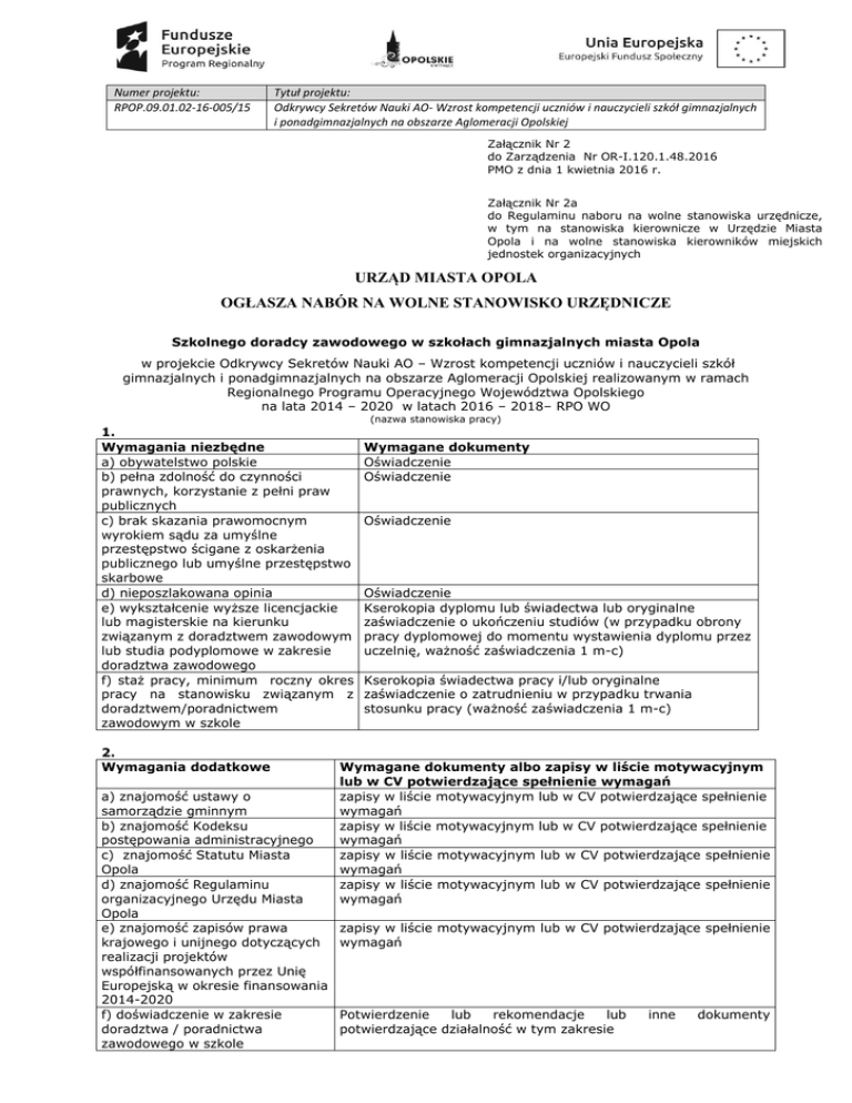 Numer projektu: RPOP.09.01.02-16-005/15 Tytuł projektu: Odkrywcy Sekretów Nauki AO- Wzrost kompetencji uczniów i nauczycieli szkół gimnazjalnych i ponadgimnazjalnych na obszarze Aglomeracji Opolskiej Załącznik Nr 2 do Zarządzenia Nr OR-I.120.1.48.2016 PMO z dnia 1 kwietnia 2016 r. Załącznik Nr 2a do Regulaminu naboru na wolne stanowiska urzędnicze, w tym na stanowiska kierownicze w Urzędzie Miasta Opola i na wolne stanowiska kierowników miejskich jednostek organizacyjnych URZĄD MIASTA OPOLA OGŁASZA NABÓR NA WOLNE STANOWISKO URZĘDNICZE Szkolnego doradcy zawodowego w szkołach gimnazjalnych miasta Opola w projekcie Odkrywcy Sekretów Nauki AO – Wzrost kompetencji uczniów i nauczycieli szkół gimnazjalnych i ponadgimnazjalnych na obszarze Aglomeracji Opolskiej realizowanym w ramach Regionalnego Programu Operacyjnego Województwa Opolskiego na lata 2014 – 2020 w latach 2016 – 2018– RPO WO (nazwa stanowiska pracy) 1. Wymagania niezbędne a) obywatelstwo polskie b) pełna zdolność do czynności prawnych, korzystanie z pełni praw publicznych c) brak skazania prawomocnym wyrokiem sądu za umyślne przestępstwo ścigane z oskarżenia publicznego lub umyślne przestępstwo skarbowe d) nieposzlakowana opinia e) wykształcenie wyższe licencjackie lub magisterskie na kierunku związanym z doradztwem zawodowym lub studia podyplomowe w zakresie doradztwa zawodowego f) staż pracy, minimum roczny okres pracy na stanowisku związanym z doradztwem/poradnictwem zawodowym w szkole 2. Wymagania dodatkowe a) znajomość ustawy o samorządzie gminnym b) znajomość Kodeksu postępowania administracyjnego c) znajomość Statutu Miasta Opola d) znajomość Regulaminu organizacyjnego Urzędu Miasta Opola e) znajomość zapisów prawa krajowego i unijnego dotyczących realizacji projektów współfinansowanych przez Unię Europejską w okresie finansowania 2014-2020 f) doświadczenie w zakresie doradztwa / poradnictwa zawodowego w szkole Wymagane dokumenty Oświadczenie Oświadczenie Oświadczenie Oświadczenie Kserokopia dyplomu lub świadectwa lub oryginalne zaświadczenie o ukończeniu studiów (w przypadku obrony pracy dyplomowej do momentu wystawienia dyplomu przez uczelnię, ważność zaświadczenia 1 m-c) Kserokopia świadectwa pracy i/lub oryginalne zaświadczenie o zatrudnieniu w przypadku trwania stosunku pracy (ważność zaświadczenia 1 m-c) Wymagane dokumenty albo zapisy w liście motywacyjnym lub w CV potwierdzające spełnienie wymagań zapisy w liście motywacyjnym lub w CV potwierdzające spełnienie wymagań zapisy w liście motywacyjnym lub w CV potwierdzające spełnienie wymagań zapisy w liście motywacyjnym lub w CV potwierdzające spełnienie wymagań zapisy w liście motywacyjnym lub w CV potwierdzające spełnienie wymagań zapisy w liście motywacyjnym lub w CV potwierdzające spełnienie wymagań Potwierdzenie lub rekomendacje lub potwierdzające działalność w tym zakresie inne dokumenty Numer projektu: RPOP.09.01.02-16-005/15 Tytuł projektu: Odkrywcy Sekretów Nauki AO- Wzrost kompetencji uczniów i nauczycieli szkół gimnazjalnych i ponadgimnazjalnych na obszarze Aglomeracji Opolskiej g) zainteresowania związane z nowoczesnymi technikami poradnictwa edukacyjnozawodowego h)wysokie umiejętności organizacyjne, umiejętność szybkiego reagowania na potrzeby związane z pełnioną funkcją oraz rozwiązywania problemów, umiejętność prowadzenie zajęć indywidualnych i grupowych; i) cechy osobowe: Sumienność, dokładność, punktualność, wysoka odporność na stres, kultura osobista, kreatywność 3. zapisy w liście motywacyjnym lub w CV potwierdzające spełnienie wymagań zapisy w liście motywacyjnym lub w CV potwierdzające spełnienie wymagań zapisy w liście motywacyjnym lub w CV potwierdzające spełnienie wymagań Zakres wykonywanych zadań na stanowisku: a) b) c) d) e) f) g) h) i) j) k) l) m) Realizacja następujących zadań w szkołach gimnazjalnych miasta Opola, tj.: - Publicznym Gimnazjum nr 1 w Opolu, - Publicznym Gimnazjum nr 4 w Opolu, - Publicznym Gimnazjum nr 5 w Opolu, - Publicznym Gimnazjum nr 9 w Opolu: systematyczne diagnozowanie zapotrzebowania uczniów na informacje edukacyjne i zawodowe oraz pomoc w planowaniu kształcenia i kariery zawodowej, ze szczególnym uwzględnieniem uczniów ze specjalnymi potrzebami edukacyjnymi; gromadzenie, aktualizacja i udostępnianie informacji edukacyjnych i zawodowych właściwych dla poziomu gimnazjalnego; prowadzenie zajęć grupowych i indywidualnych związanych z wyborem kierunku kształcenia i zawodu oraz planowaniem kształcenia i kariery zawodowej; prowadzenie konsultacji dla uczniów i rodziców; prowadzenie działalności informacyjno-doradczej koordynowanej przez szkołę; współpraca z innymi nauczycielami w tworzeniu i zapewnieniu ciągłości działań w zakresie doradztwa edukacyjno-zawodowego; wspieranie nauczycieli, wychowawców grup wychowawczych i innych specjalistów w udzielaniu pomocy psychologiczno-pedagogicznej; przygotowanie programu zewnętrznego wsparcia szkoły w zakresie doradztwa edukacyjnozawodowego uczniów, ze szczególnym uwzględnieniem uczniów ze specjalnymi potrzebami edukacyjnymi; kontakty bezpośrednie z uczestnikami, mające na celu dokładne sprawdzenie oczekiwań i możliwości uczestników projektu w zakresie doradztwa edukacyjno-zawodowego; opracowanie raportu ewaluacyjnego po zakończeniu projektu (jeden raport na szkołę); prowadzenia dokumentacji, m.in. list obecności, miesięcznych kart czasu pracy, dzienników zajęć i innych wymaganych przepisami regulującymi realizację projektów dofinansowanych z funduszy unijnych; rzetelne i terminowe sporządzanie sprawozdań merytorycznych z przebiegu realizacji projektu oraz przekazywanie ich koordynatorowi projektów; współpraca z koordynatorem projektów oraz personelem zarządzającym w projekcie. Odpowiedzialność za: I. Odpowiedzialność za zgodną z wytycznymi, umowami i innym