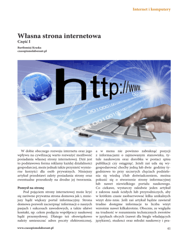 Internet i komputery Własna strona internetowa Część I Bartłomiej Kraska czasopismolaborant.pl W dobie obecnego rozwoju internetu oraz jego wpływu na cywilizację warto rozważyć możliwość posiadania własnej strony internetowej. Dziś jest to podstawowa forma reklamy każdej działalności gospodarczej, może jednak także przynieść wymierne korzyści dla osób prywatnych. Niniejszy artykuł przedstawi zalety posiadania strony oraz ewentualne przeszkody na drodze jej tworzenia. a w menu nie powinno zabraknąć pozycji z informacjami o zajmowanym stanowisku, tytule naukowym oraz dorobku w postaci spisu publikacji czy osiągnięć. Jeżeli zaś uda się wygospodarować choćby jedną lub dwie godziny tygodniowo to przy szczerych chęciach podzielenia się wiedzą i/lub doświadczeniem, można pokusić się o stworzenie strony informacyjnej lub nawet niewielkiego portalu naukowego. Pomysł na stronę Co ciekawe, wystarczy zaledwie jeden artykuł Pod pojęciem strony internetowej może kryć z zakresu nauk ścisłych lub przyrodniczych, aby się zarówno prywatna strona domowa jak i, mnie- w krótkim czasie zaobserwować kilka unikalnych jszy bądź większy portal informacyjny. Strona wizyt dzie-nnie. Jeśli zaś artykuł będzie zawierał domowa pozwoli zaczerpnąć informacji o naszych trudno dostępne informacje to liczba wizyt pasjach i sukcesach zawodowych, a także ułatwi wzrośnie nawet kilkakrotnie. Obecnie, ze względu kontakt, np. celem podjęcia współpracy naukowej na trudność w rozumieniu technicznych zwrotów bądź przemysłowej. Dlatego też obowiązkowo w językach obcych (nawet dla biegle władających należy umieszczać adres poczty elektronicznej, językiem), studenci oraz młodzi naukowcy i prawww.czasopismolaborant.pl 41 Internet i komputery cownicy chętniej wyszukują polskie artykuły. Cena Stronę internetową możemy mieć oczywiście nie ponosząc absolutnie żadnych kosztów, podobnie zresztą jak pocztę elektroniczną czy konto na portalach społecznościowych. Jednak zgodnie z regułą iż nie ma nic za darmo, za naszą oszczędność przyjdzie nam zapłacić w postaci wyskakujących reklam które są dla nas sponsorem. Wyjątkiem mogą być strony prywatne tworzone na uczelniach, gdzie do póki jesteśmy pracownikami takiej placówki, miejsce na serwerze bez reklamowych niespodzianek na pewno się znajdzie. W opcji bezpłatnej nie możemy jednak liczyć na dowolność wyboru naszej domeny, czyli adresu internetowego który prowadzi do strony. Będzie on zawierał nazwę usługodawcy z którego usług korzystamy. Inne ograniczenia to ilość miejsca na serwerze, limit wielkości plików, dozwolone typy plików czy transfer miesięczny (wszystkie te parametry zostaną wyjaśnione w dalszej części artykułu). W przypadku gdy jesteśmy w stanie wydać kilkadziesiąt (lub kilkaset) złotych na stronę, możliwości staną się praktycznie nieograniczone. Za utrzymanie domeny przyjdzie nam zapłacić rocznie od około 50 – 100 PLN netto, przy czym pierwszy rok jest zwykle całkowicie lub prawie darmowy. Natomiast przyzwoity serwer to koszt minimum kilkadziesiąt złotych – w przypadku prostej strony, kilkaset dla bardzo rozbudowanych strony (a nawet kliku, a serwer zawsze można współdzielić ze znajomymi) do kliku tysięcy jeśli mamy zamiar postawić wielki portal internetowy. w korespondencji elektronicznej, np. w celach konsultacyjnych może spowodować jej przechwycenie i automatyczne zarejestrowanie przez szpiegujące strony internetowe które mamy otwarte wraz z pocztą w przeglądarce internetowej. Dostępność wymyślonej przez nas nazwy możemy sprawdzić na stronach usługodawców, wpisując ją w wyszukiwarkę domen. Raz wybranej nazwy nie powinno się zmieniać dlatego że wszelkie osoby które nas odwiedziły, będą nas ponownie szukać w tym samym miejscu. Jeśli jednak zmiana jest nieunikniona to powinniśmy zachować starą domenę na co najmniej rok, i umieścić na niej informację o przeniesieniu strony. Jeśli nasza strona była popularna to możemy mieć pewność że po porzuceniu starej domeny, szybko znajdzie się jej nowy właściciel. Może ona bowiem pozostać w niektórych wyszukiwarkach oraz notatkach pewnych osób, trafią na nową stronę szukawszy naszej. Wybór serwera Każdy serwer charakteryzuje kilka parametrów ściśle zależnych od jego ceny. W przypadku prostej strony domowej lub informacyjnej to właściwie można je zignorować i wybrać najtańszą opcję. Natomiast jeżeli zapragniemy rozbudowanej galerii, forum dla szerszej ilości internautów lub portal informacyjny, parametry serwera mają istotny wpływ na nasz wybór. Do najważniejszych należy zaliczyć ilość miejsca na serwerze które zajmie strona, umieszczone załączniki, pliki do pobrania oraz poczta w naszej domenie (o ile chcemy taką posiadać); transfer miesięczny/roczny czyli ilość danych pobranych do i wysłanych z serwera (głównie na pobieranie strony przez odwiedzających oraz pocztę przychodzącą i wychodzącą) oraz możliwość Wybór domeny Warto zatroszczyć się aby nazwa domeny była zakładania baz danych. Ten ostatni pozwala na łatwa do zapamiętania. Zapewni to niewątpliwie zakładanie stron, których modyfikowanie i zmiana wzrost odwiedzin. Zadanie to może się jednak zawartości nie wymaga żadnej wiedzy o tworzeniu okazać trudne gdyż rejestracja domen trwa już od stron. Przekroczenie któregokolwiek z parametrów bardzo dawna i zdecydowana większość prostych może skutkować zablokowaniem strony na jakiś nazw czy choćby nazwisk jest już zajęta. Dodat- czas lub skróceniem okresu rozliczeniowego który kowo od jakiegoś czasu istnieją firmy specjalizujące zwykle trwa jeden rok, i potrzeby uiszczenia opłaty się hurtową rejestracją za grosze ciekawie za przedłużenie abonamentu znacznie szybciej. brzmiących domen aby je później odsprzedać z zyskiem za niemałe kwoty. Dlatego też