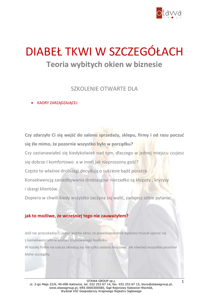 DIABEŁ TKWI W SZCZEGÓŁACH Teoria wybitych okien w biznesie SZKOLENIE OTWARTE DLA • KADRY ZARZĄDZAJĄCEJ Czy zdarzyło Ci się wejść do salonu sprzedaży, sklepu, firmy i od razu poczuć się źle mimo, że pozornie wszystko było w porządku? Czy zastanawiałeś się kiedykolwiek nad tym, dlaczego w jednej miejscu czujesz się dobrze I komfortowo a w innej jak nieproszony gość? Często to właśnie drobiazgi decydują o sukcesie bądź porażce. Konsekwencją zaniedbywania drobiazgów nierzadko są kłopoty , kryzysy i skargi klientów. Dopiero w chwili kiedy wszystko zaczyna się walić, zadajesz sobie pytanie: jak to możliwe, że wcześniej tego nie zauważyłem? Jeśli nie przeszkadza Ci jedno wybite okno, to prawdopodobnie będziesz musiał uporać się z konsekwencjami w postaci zrujnowanego budynku. W każdej firmie na sukces składają się nie tylko zadania kluczowe, ale również wszystkie pozornie błahe szczegóły. OTAWA GROUP sp.j. ul. 3-go Maja 22/6, 40-096 Katowice, tel. 032 253 67 14, fax. 032 253 67 15, [email protected], www.otawagroup.pl, KRS 0000300580, Sąd Rejonowy Katowice-Wschód, Wydział VIII Gospodarczy Krajowego Rejestru Sądowego 1 KORZYŚCI Z UDZIAŁU W SZKOLENIU • Zobaczysz jak detale skutecznie mogą zniechęcić Klienta do transakcji. • Będziesz wiedział jak rozpoznawać w Twojej firmie „wybite okna”. • Dostrzeżesz jak drobne różnice wpływają na wizerunek Twój i Twojej firmy. • Dzięki drobnym poprawkom i konsekwencji w ich wdrażaniu, nabierzesz większej pewności siebie w kontaktach z Klientem. • Będziesz wiedział jak skutecznie zapobiegać „wybijaniu okien” w Twojej firmie. PROGRAM SZKOLENIA • Jak powstała teoria „wybitych okien”? − eksperyment Filipa Zimbardo − bezwzględne reagowanie na najdrobniejsze przejawy nieładu. • Teoria „wybitych okien” w biznesie: − priorytety w prowadzeniu firmy − drobiazgi a sukces firmy − zarząd i personel – podział zadań. • Zasady – jak zapobiegać „wybijaniu okien”? − wizerunek pracowników − odpowiedzialność kierownictwa − wygląd biura, salonu, sklepu • Obsesja i kompulsja – na czym należy się skupić i o co zatroszczyć w firmie? − przyczyny niezadowolenia klientów − badania jakości obsługi Mystery Shopper Wartością dodaną szkolenia będą ćwiczenia case study w których trenerzy korzystają z wyników badań MillwardBrown SMG/KRC Mystery Shopper. OTAWA GROUP sp.j. ul. 3-go Maja 22/6, 40-096 Katowice, tel. 032 253 67 14, fax. 032 253 67 15, [email protected], www.otawagroup.pl, KRS 0000300580, Sąd Rejonowy Katowice-Wschód, Wydział VIII Gospodarczy Krajowego Rejestru Sądowego 2 MIEJSCE SZKOLENIA: HOTEL MERCURE F.CHOPIN WARSZAWA, AL. JANA PAWŁA II 22 TERMINY DO WYBORU: 5-6 LUTEGO 2011 9-10 MARCA 2011 CZAS TRWANIA: 16 GODZIN MAKSYMALNA WIELKOŚĆ GRUPY: 12 OSÓB CENA: 1190 ZŁ CENA OBEJMUJE: • MATERIAŁY SZKOLENIOWE • CERTYFIKAT • SERWIS KAWOWY • LUNCH OTAWA GROUP sp.j. ul. 3-go Maja 22/6, 40-096 Katowice, tel. 032 253 67 14, fax. 032 253 67 15, [email protected], www.otawagroup.pl, KRS 0000300580, Sąd Rejonowy Katowice-Wschód, Wydział VIII Gospodarczy Krajowego Rejestru Sądowego 3