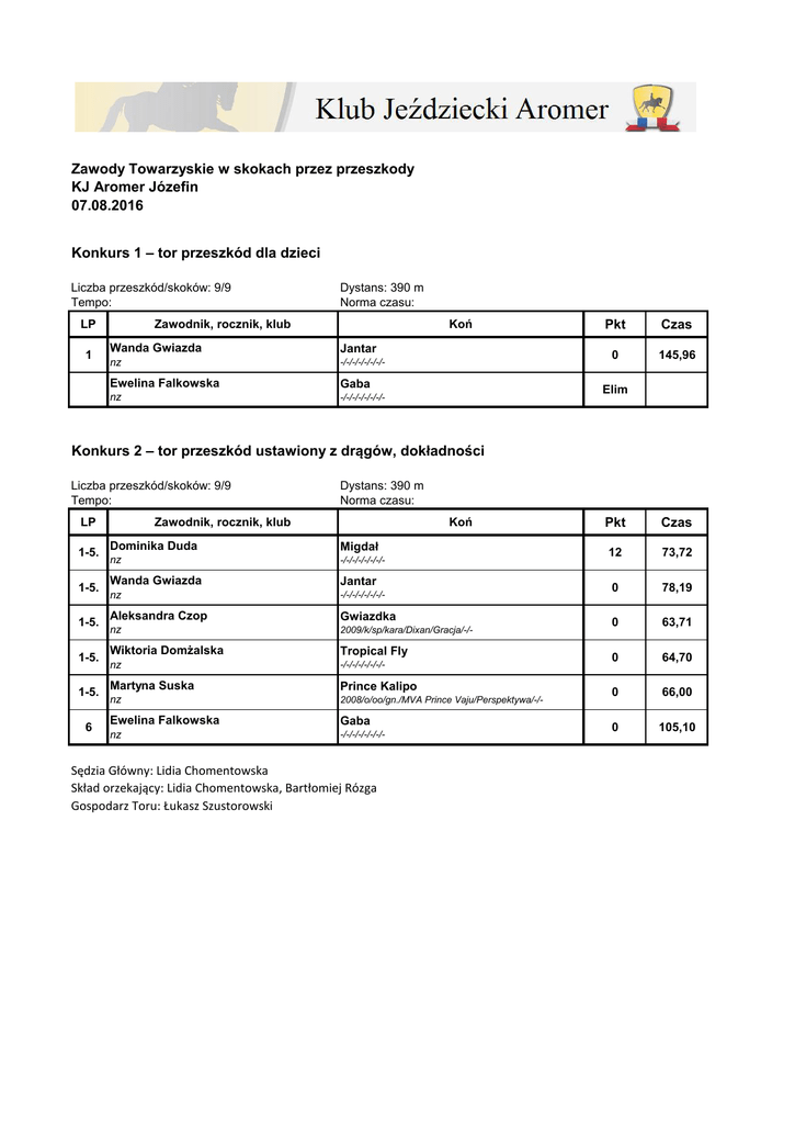 Zawody Towarzyskie w skokach przez przeszkody KJ Aromer Józefin 07.08.2016 Konkurs 1 – tor przeszkód dla dzieci Liczba przeszkód/skoków: 9/9 Tempo: LP 1 Dystans: 390 m Norma czasu: Koń Zawodnik, rocznik, klub Wanda Gwiazda Jantar nz -/-/-/-/-/-/-/- Ewelina Falkowska Gaba nz -/-/-/-/-/-/-/- Pkt Czas 0 145,96 Elim Konkurs 2 – tor przeszkód ustawiony z drągów, dokładności Liczba przeszkód/skoków: 9/9 Tempo: LP 1-5. 1-5. 1-5. 1-5. 1-5. 6 Dystans: 390 m Norma czasu: Koń Zawodnik, rocznik, klub Dominika Duda Migdał nz -/-/-/-/-/-/-/- Wanda Gwiazda Jantar nz -/-/-/-/-/-/-/- Aleksandra Czop Gwiazdka nz 2009/k/sp/kara/Dixan/Gracja/-/- Wiktoria Domżalska Tropical Fly nz -/-/-/-/-/-/-/- Martyna Suska Prince Kalipo nz 2008/o/oo/gn./MVA Prince Vaju/Perspektywa/-/- Ewelina Falkowska Gaba nz -/-/-/-/-/-/-/- Sędzia Główny: Lidia Chomentowska Skład orzekający: Lidia Chomentowska, Bartłomiej Rózga Gospodarz Toru: Łukasz Szustorowski Pkt Czas 12 73,72 0 78,19 0 63,71 0 64,70 0 66,00 0 105,10 Zawody Towarzyskie w skokach przez przeszkody KJ Aromer Józefin 07.08.2016 Konkurs 3 – Krzyżaki wys. 40 cm Liczba przeszkód/skoków: 9/9 Tempo: 300 m/min. LP 1-6. 1-6. 1-6. 1-6. 1-6. 1-6. 7 8 9 10-11. 10-11. Dystans: 390 m Norma czasu: 78" Koń Zawodnik, rocznik, klub Dominika Duda Migdał nz -/-/-/-/-/-/-/- Angelika Glasek Pkt Czas 0 69,57 Tobi nz gr. -/-/-/-/-/-/-/- 0 75,20 Natalia Bujalska JM'04 KJ Akademia Kucania Dawidy Betoven 0 57,46 Maja Szczęsna JM'02 -/-/-/-/-/-/-/- Czandra nz gr. D 2007/k/t.szl./-/NN/NN/-/- 0 67,65 Klaudia Skłodowska Tweedy gr. C nz -/-/-/-/-/-/-/- 0 69,30 Agnieszka Przygocka Kaliber nz -/-/-/-/-/-/-/- 0 73,82 JM'05 Angelika Glasek Tobi nz gr. -/-/-/-/-/-/-/- 1 80,69 Ewa Bochenko Chilli Pepper -/-/-/-/-/-/-/- -/-/-/-/-/-/-/- 5 95,79 Patrycja Urbaniak Wena nz -/-/-/-/-/-/-/- 6 85,89 gr. 9 112,33 gr. 9 111,78 Justyna Dec J'99 nz Justyna Dec nz JM'02 Madras -/w/-/-/-/-/-/- J'99 Madras -/w/-/-/-/-/-/- Sędzia Główny: Lidia Chomentowska Skład orzekający: Lidia Chomentowska, Bartłomiej Rózga Gospodarz Toru: Łukasz Szustorowski Zawody Towarzyskie w skokach przez przeszkody KJ Aromer Józefin 07.08.2016 Konkurs 4 – Debiuty 50 cm – dokładności Liczba przeszkód/skoków: 9/9 Tempo: 300 m/min. LP 1-17. 1-17. 1-17. 1-17. 1-17. 1-17. 1-17. 1-17. 1-17. 1-17. 1-17. 1-17. 1-17. 1-17. 1-17. 1-17. 1-17. 18-19 18-19 20 Dystans: 390 m Norma czasu: 78" Koń Zawodnik, rocznik, klub Anna Tyburska Kelpie gr. D nz -/-/-/-/-/-/-/-/- Anna Tyburska Kelpie gr. D nz -/-/-/-/-/-/-/-/- Bianka Kwiatkowska Marica nz gr. 2004/k/haftl./kaszt./NN/NN/-/- Dominika Duda Migdał nz -/-/-/-/-/-/-/- Ewa Bochenko Chilli Pepper -/-/-/-/-/-/-/- -/-/-/-/-/-/-/- Justyna Dec Diuk J'99 nz Justyna Dec -/-/-/-/-/-/-/- Diuk J'99 nz -/-/-/-/-/-/-/- Klaudia Skłodowska Tweedy gr. C nz -/-/-/-/-/-/-/- Lidia Szmurło-Klik Wena nz -/-/-/-/-/-/-/- Łukasz Zaremba JM'01 Maja Szczęsna Macbeth gr. C 2007/o/kuc/siwa/Nowogródek/Muffin/-/- nz JM'05 Czandra nz gr. D 2007/k/t.szl./-/NN/NN/-/- Martyna Suska Prince Kalipo nz 2008/o/oo/gn./MVA Prince Vaju/Perspektywa/-/- Natalia Bujalska JM'04 KJ Akademia Kucania Dawidy Betoven Nayon Lee Karina nz -/-/-/-/-/-/-/- Sabina Grzejdziak Tambura nz -/-/-/-/-/-/-/- Wiktoria Domżalska Tropical Fly nz -/-/-/-/-/-/-/- Natalia Koc Antar gr. C bpk MAZ 2011/-/-/-/Ares/Antayja Bordery/-/- Natalia Łazowska M'07 -/-/-/-/-/-/-/- Mithryl gr. B nz 2003/w/kuc/kara w s./Piorun/Moorlands Ailleen/-/- Wiktoria Domżalska Tropical Fly nz -/-/-/-/-/-/-/- Pola Skarżyńska Jazon nz 2001/w/sp/sk.gn./Jakonin/Dama/-/- Pkt Czas 0 68,99 0 65,36 0 76,71 0 70,76 0 72,94 0 66,68 0 62,66 0 67,52 0 68,8 0 59,18 0 65,15 0 63,62 0 61,91 0 74,73 0 65,33 0 62,71 0 59,14 4 64,09 4 55,01 5 78,48 Agnieszka Przygocka Kaliber nz -/-/-/-/-/-/-/- Sędzia Główny: Lidia Chomentowska Skład orzekający: Lidia Chomentowska, Bartłomiej Rózga Gospodarz Toru: Łukasz Szustorowski Rez. Zawody Towarzyskie w skokach przez przeszkody KJ Aromer Józefin 07.08.2016 Konkurs 5 – Mini LL 70 cm – dokładności Liczba przeszkód/skoków: 9/9 Tempo: 325 m/min. LP 1-12. 1-12. 1-12. 1-12. 1-12. 1-12. 1-12. 1-12. 1-12. 1-12. 1-12. 1-12. 13 14-15 14-15 16 17 Dystans: 400 m Norma czasu: 74" Koń Zawodnik, rocznik, klub Aleksandra Czop Gwiazdka nz 2009/k/sp/kara/Dixan/Gracja/-/- Aleksandra Czop Lucky Luke nz -/-/-/-/-/-/-/- Emilia Mędrzecka Korys Lapis nz 1996/w/sp/kaszt./Laufer/Korys Dumna/-/- Irena Pawłowska Ninette L M'07 gr. C bpk MAZ 2005/k/kuc/kaszt./Top Ewita/Nancy L/-/- Karolina Kłos Kapablanka nz gr. E 1999/k/ukr.wierz./kaszt./Belick/Kapela Lidia Szmurło-Klik Wena nz -/-/-/-/-/-/-/- Maria Kozłowska Asturia nz 2005/k/sp/-/Seigon/Andromeda/-/- Marlena Pałygiewicz Caton nz -/-/-/-/-/-/-/- Martyna Suska Prince Kalipo nz 2008/o/oo/gn./MVA Prince Vaju/Perspektywa/-/- Monika Kuchta Davanti nz -/-/-/-/-/-/-/- Sabina Grzejdziak Tambura nz -/-/-/-/-/-/-/- Zofia Kiser Pectus JM'02 nz 2009/-/-/-/-/-/-/- Bianka Kwiatkowska Marica nz gr. 2004/k/haftl./kaszt./NN/NN/-/- Nayon Lee Karina nz -/-/-/-/-/-/-/- Wiktoria Leszek-Karwańska bpk MAZ Natalia Łazowska nz Antar gr. C 2011/-/-/-/Ares/Antayja Bordery/-/- M'07 nz Łukasz Zaremba JM'01 Mithryl gr. B 2003/w/kuc/kara w s./Piorun/Moorlands Ailleen/-/- JM'01 Macbeth gr. C 2007/o/kuc/siwa/Nowogródek/Muffin/-/- Sędzia Główny: Lidia Chomentowska Skład orzekający: Lidia Chomentowska, Bartłomiej Rózga Gospodarz Toru: Łukasz Szustorowski Pkt Czas 0 62,67 0 67,39 0 55,99 0 65,80 0 63,00 0 65,26 0 72,42 0 63,21 0 66,27 0 73,40 0 62,58 0 66,21 1 74,39 4 73,92 4 62,18 9 92,22 20 105,76 Zawody Towarzyskie w skokach przez przeszkody KJ Aromer Józefin 07.08.2016 Konkurs 6 – LL 90 cm – zwykły Liczba przeszkód/skoków: 9/10 Tempo: 325 m/min. LP 1 2 3 4 5 6 7 8 9 10 11 12 13 14 15 16 17 18 19 Dystans: 400 m Norma czasu: 74" Koń Zawodnik, rocznik, klub Emilia Mędrzecka Korys Lapis nz 1996/w/sp/kaszt./Laufer/Korys Dumna/-/- Monika Marczyk Monte Christo JM'03 KJ Aromer Józefin -
